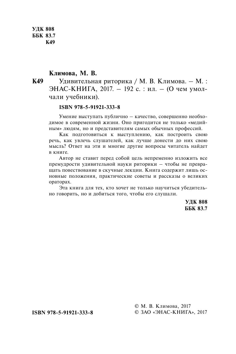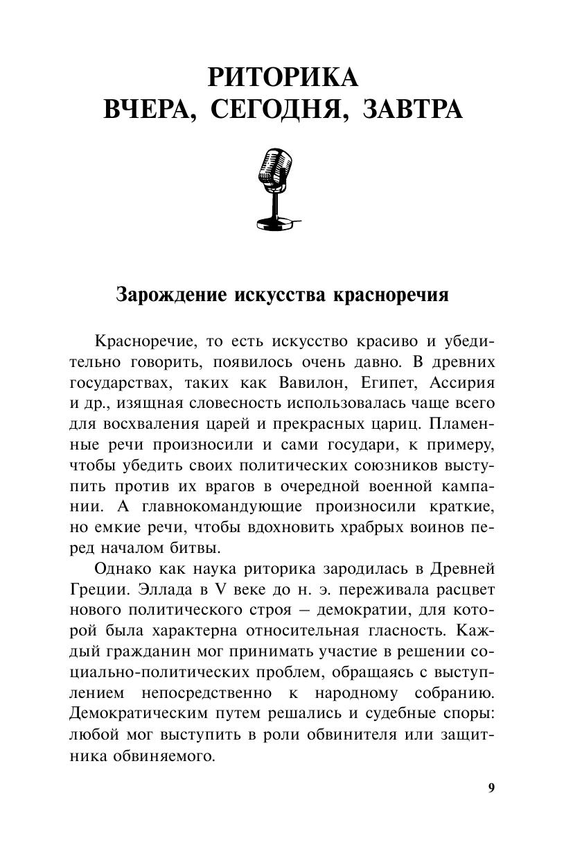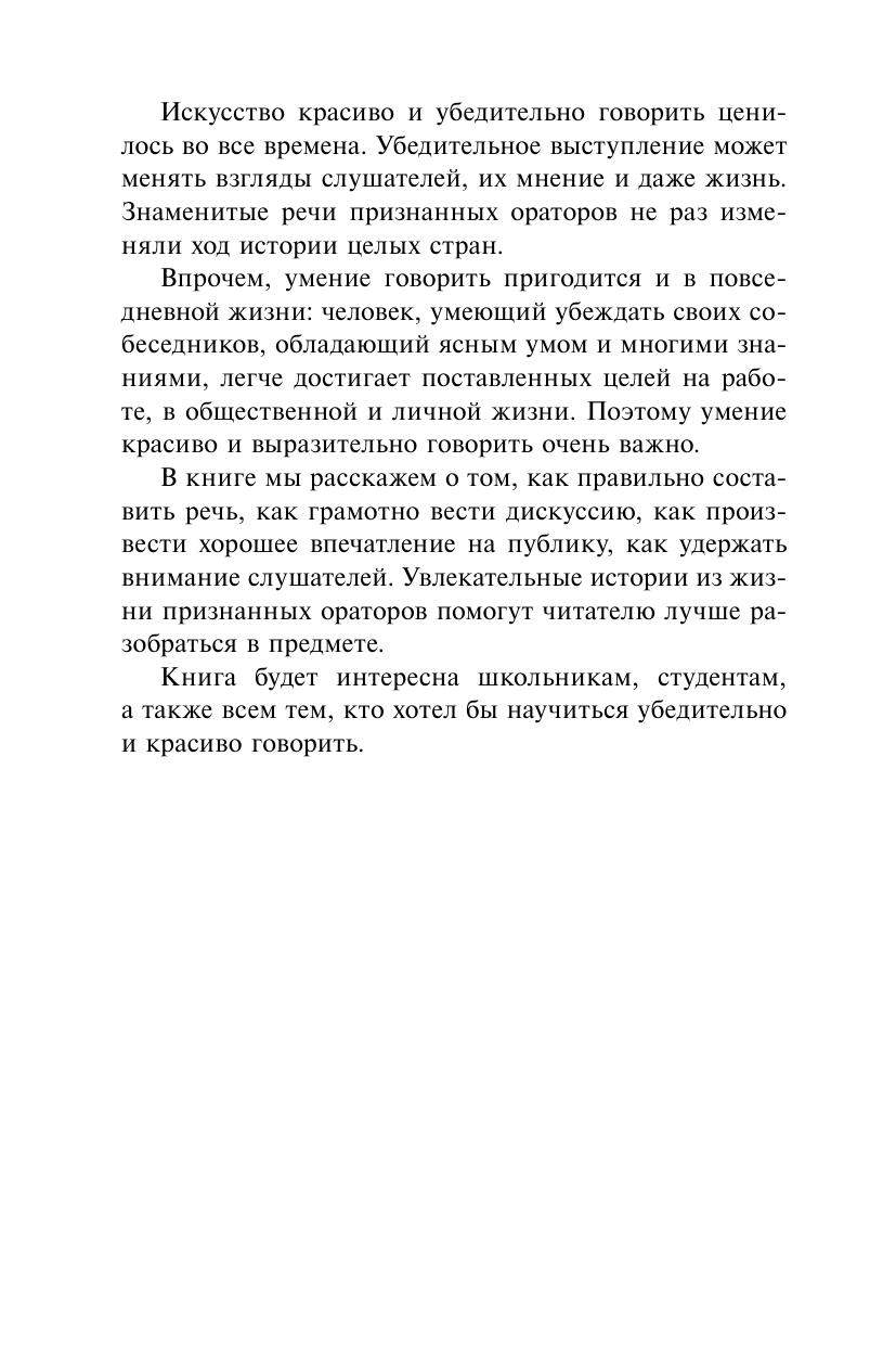 Умение выступать публично – качество, совершенно необходимое в современной жизни. Оно пригодится не только «медийным» людям, но и представителям самых обычных профессий. Как подготовиться к выступлению, как построить свою речь, как увлечь слушателей, как лучше донести до них свою мысль? Ответ на эти и многие другие вопросы читатель найдет в книге. Автор не ставит перед собой цель непременно изложить все премудрости удивительной науки риторики – чтобы не превращать повествование в скучные лекции. Книга содержит лишь основные положения, практические советы и рассказы о великих ораторах. Эта книга для тех, кто хочет не только научиться убедительно говорить, но и добиться того, чтобы его слушали.