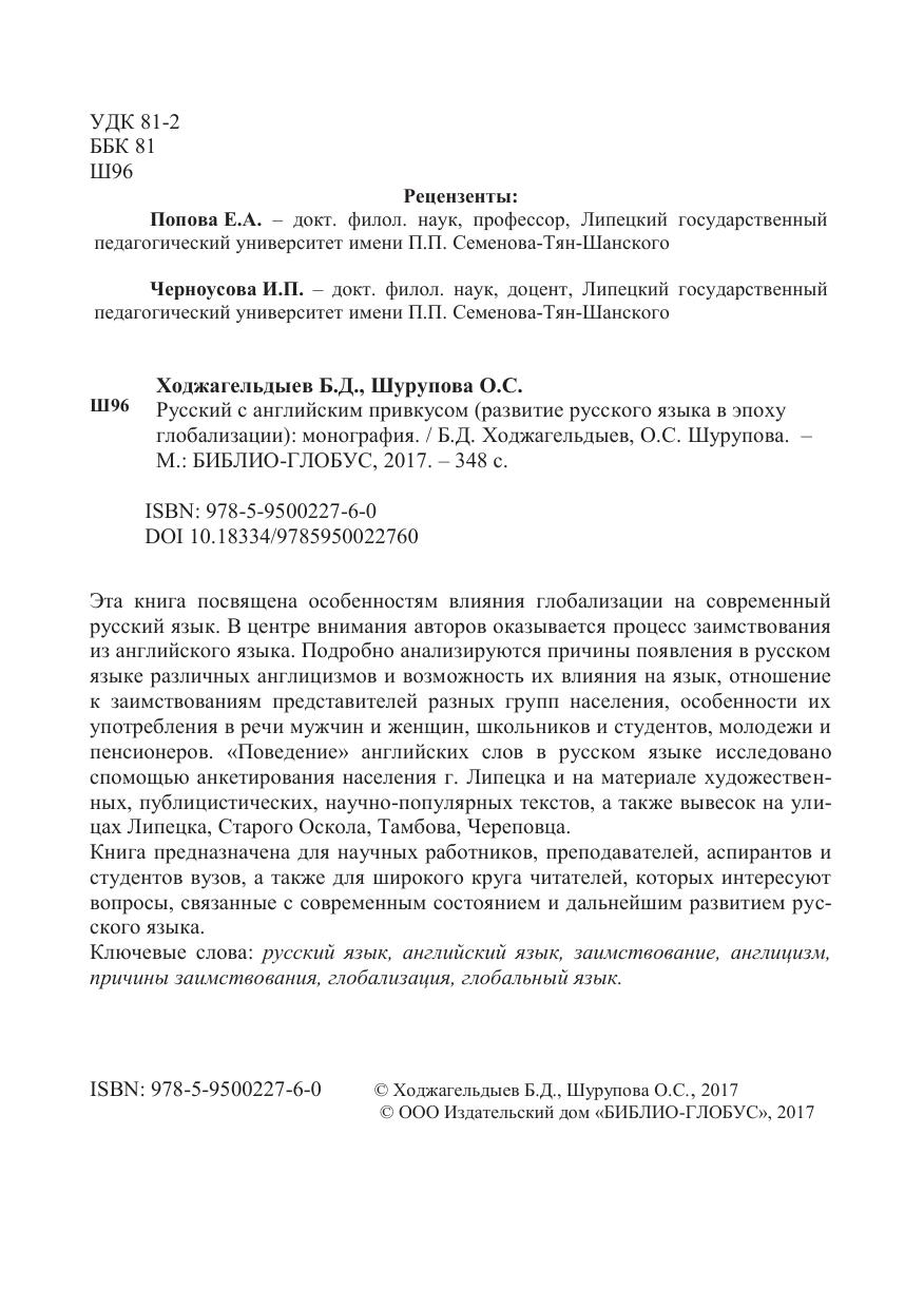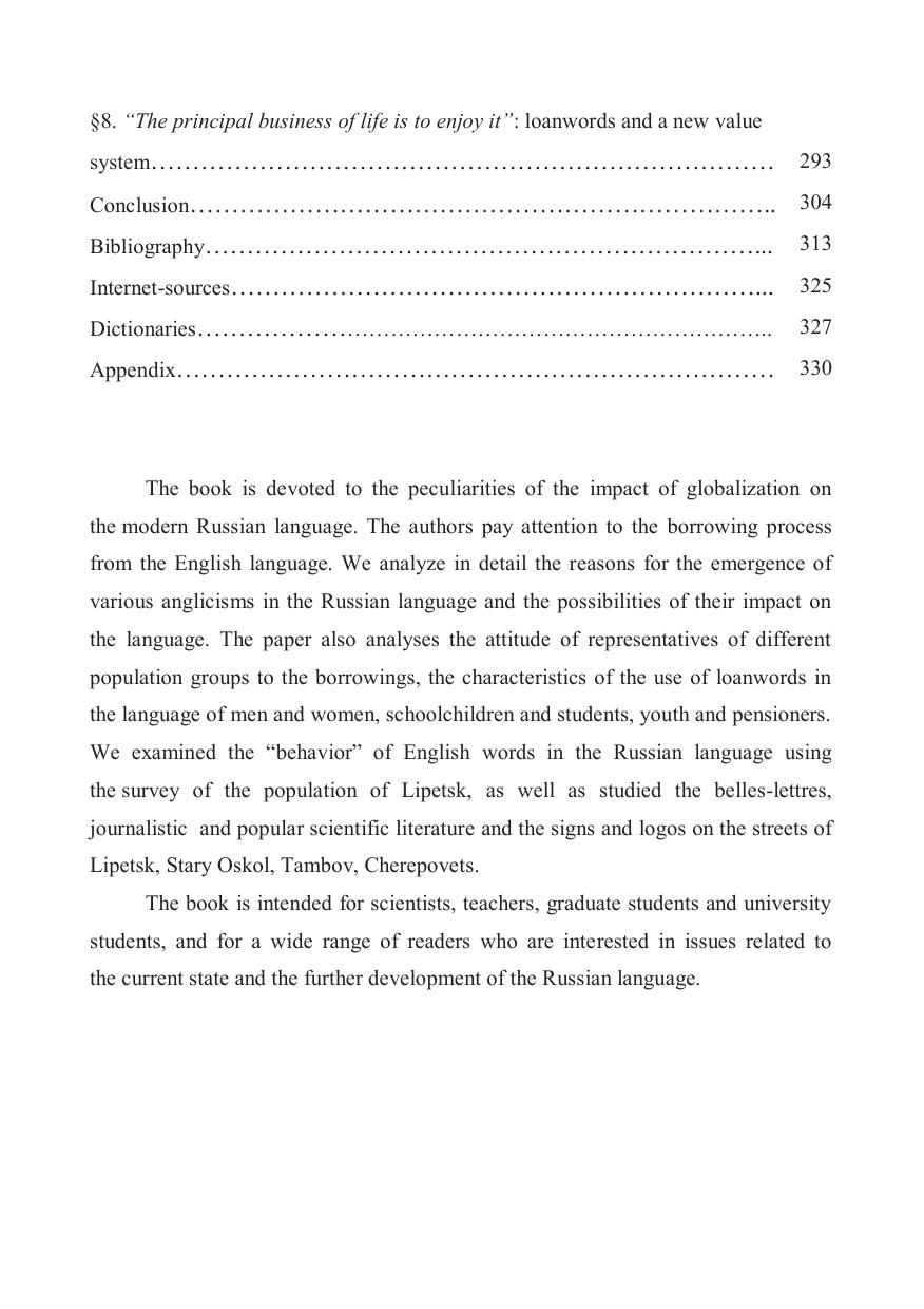 Эта книга посвящена особенностям влияния глобализации на современный русский язык. В центре внимания авторов оказывается процесс заимствования из английского языка. Подробно анализируются причины появления в русском языке различных англицизмов и возможность их влияния на язык, отношение к заимствованиям представителей разных групп населения, особенности их употребления в речи мужчин и женщин, школьников и студентов, молодежи и пенсионеров. «Поведение» английских слов в русском языке исследовано спомощью анкетирования населения г. Липецка и на материале художественных, публицистических, научно-популярных текстов, а также вывесок на улицах Липецка, Старого Оскола, Тамбова, Череповца. Книга предназначена для научных работников, преподавателей, аспирантов и студентов вузов, а также для широкого круга читателей, которых интересуют вопросы, связанные с современным состоянием и дальнейшим развитием русского языка.