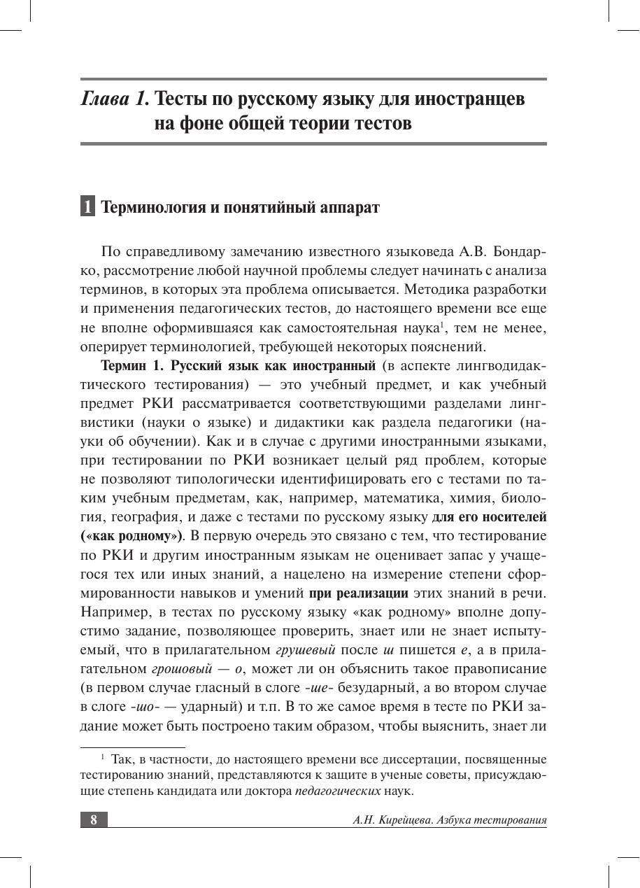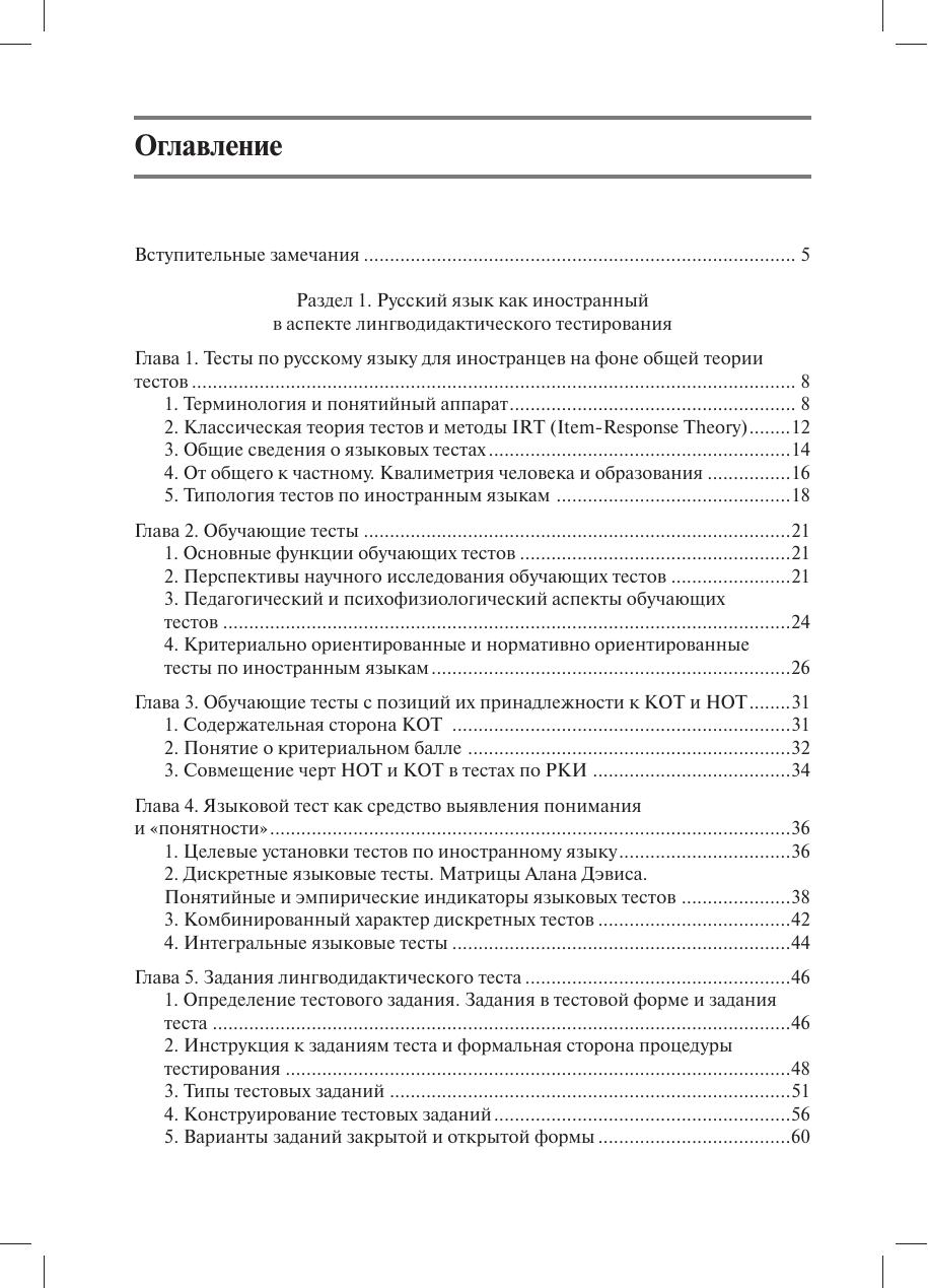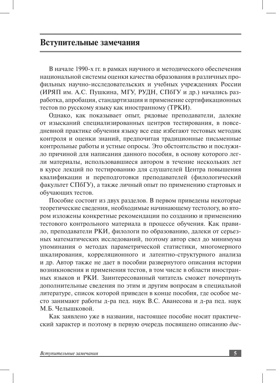 В пособии приводятся теоретические сведения, которые необходимы начинающему тестологу, анализируются уже существующие тестовые батареи и даются конкретные рекомендации по разработке и применению учебных тестов. Изложение тестологических концепций в пособии сведено до минимума: автор делает упор на практические советы по созданию дискретных тестов (по отдельным видам речевой деятельности) и интегральных тестов, позволяющих определить степень сформированности целостного представления о русском языке в сознании иностранца. Пособие призвано помочь преподавателям освоить применение обучающих тестов в повседневной учебной практике. Это позволит им лучше подготовить студентов-иностранцев к сертификационному тестированию, по-новому взглянуть на возможности оценки знаний учащихся и добиться ее большей объективности. Адресовано всем специалистам в области РКИ, а также студентам старших курсов, аспирантам и преподавателям различных филологических специальностей, интересующимся проблемами языкового тестирования.