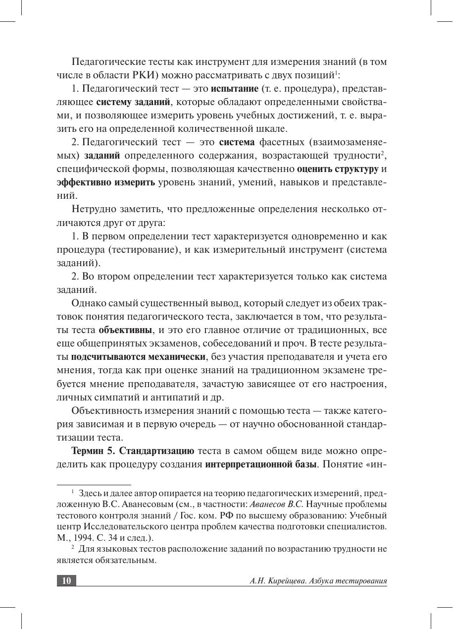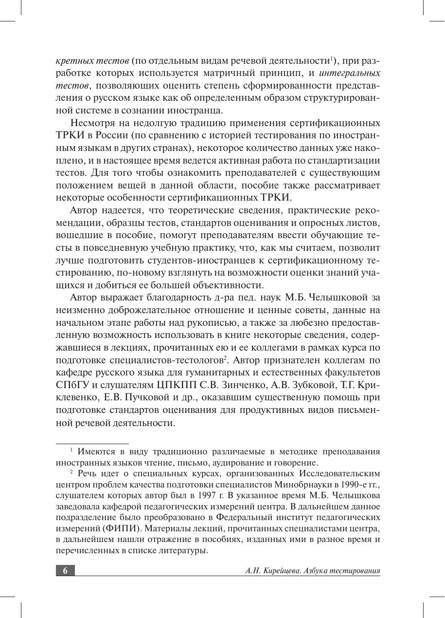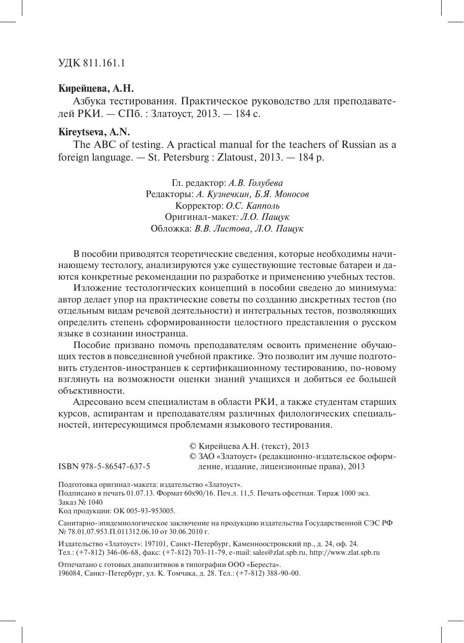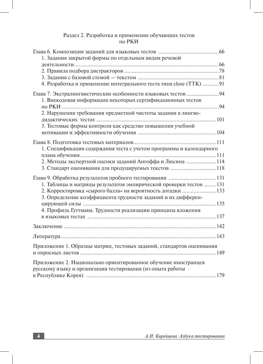 В пособии приводятся теоретические сведения, которые необходимы начинающему тестологу, анализируются уже существующие тестовые батареи и даются конкретные рекомендации по разработке и применению учебных тестов. Изложение тестологических концепций в пособии сведено до минимума: автор делает упор на практические советы по созданию дискретных тестов (по отдельным видам речевой деятельности) и интегральных тестов, позволяющих определить степень сформированности целостного представления о русском языке в сознании иностранца. Пособие призвано помочь преподавателям освоить применение обучающих тестов в повседневной учебной практике. Это позволит им лучше подготовить студентов-иностранцев к сертификационному тестированию, по-новому взглянуть на возможности оценки знаний учащихся и добиться ее большей объективности. Адресовано всем специалистам в области РКИ, а также студентам старших курсов, аспирантам и преподавателям различных филологических специальностей, интересующимся проблемами языкового тестирования.