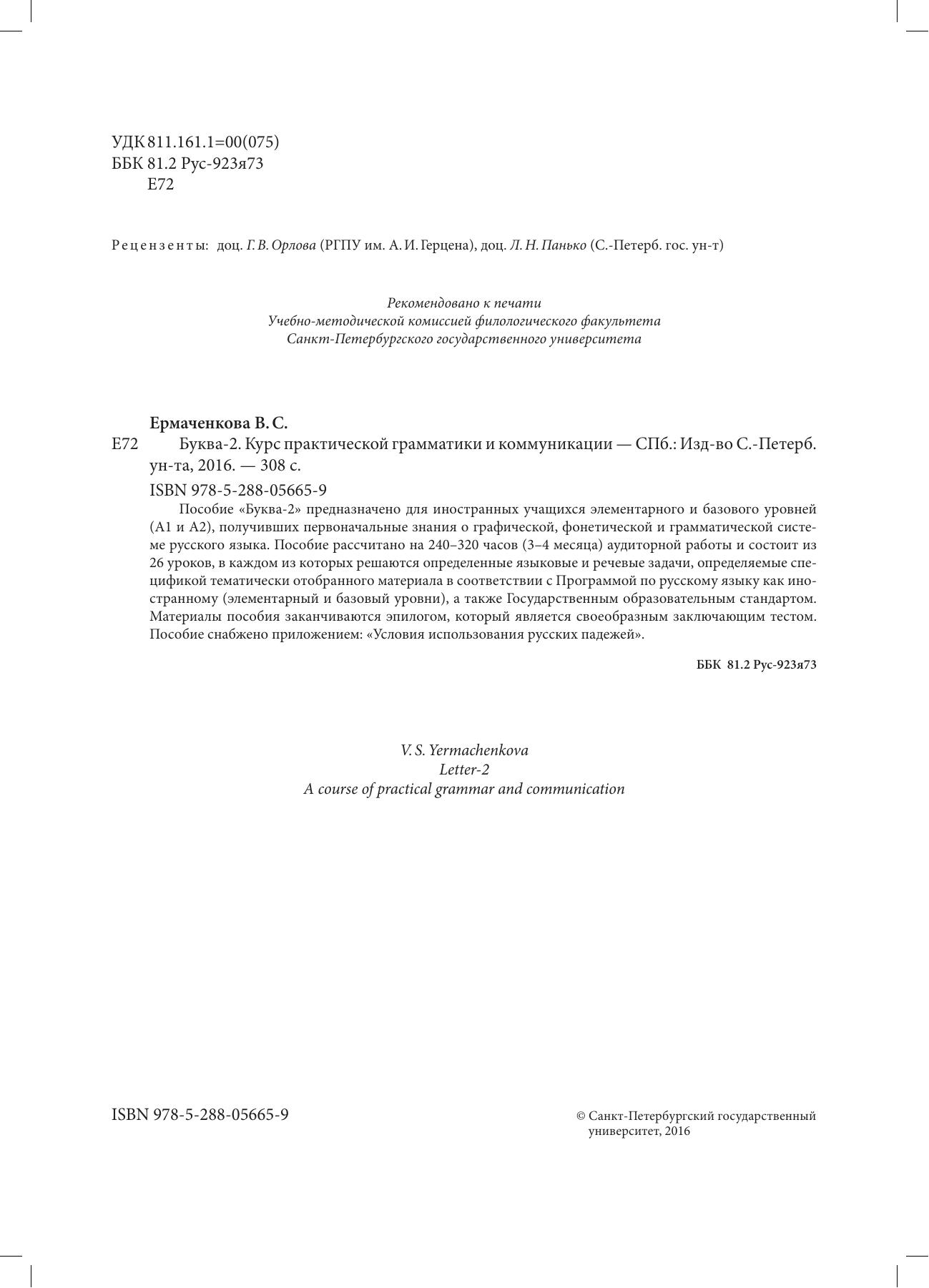 Пособие «Буква-2» предназначено для иностранных учащихся элементарного и базового уровней (А1 и А2), получивших первоначальные знания о графической, фонетической и грамматической системе русского языка. Пособие рассчитано на 240–320 часов (3–4 месяца) аудиторной работы и состоит из 26 уроков, в каждом из которых решаются определенные языковые и речевые задачи, определяемые спецификой тематически отобранного материала в соответствии с Программой по русскому языку как иностранному (элементарный и базовый уровни), а также Государственным образовательным стандартом.