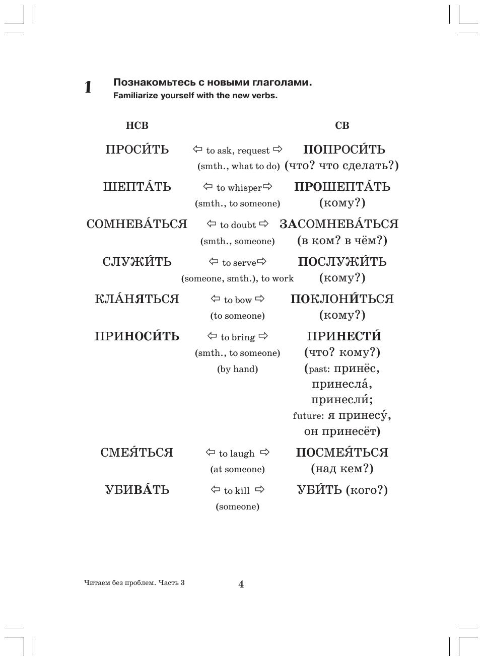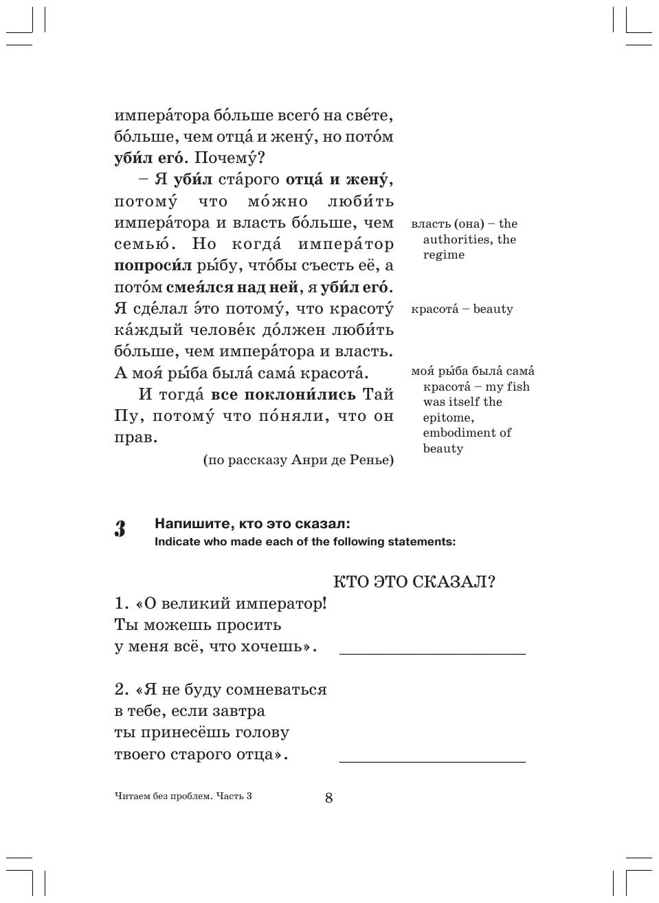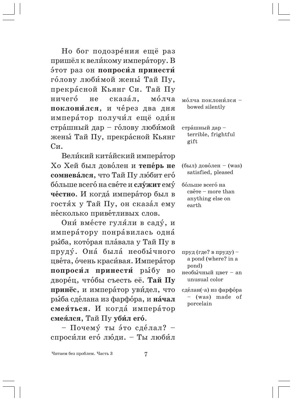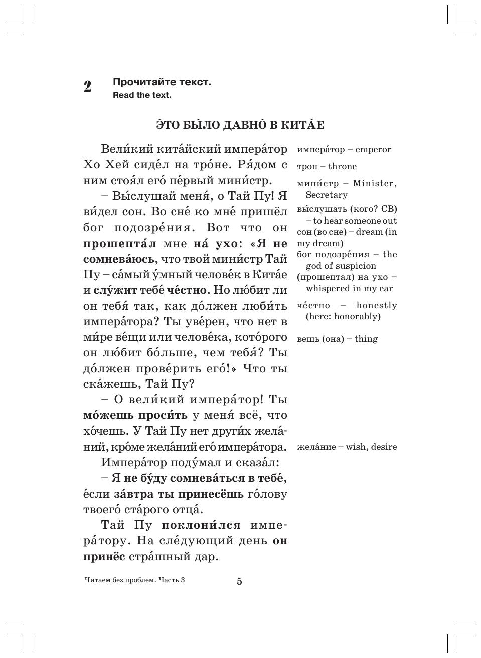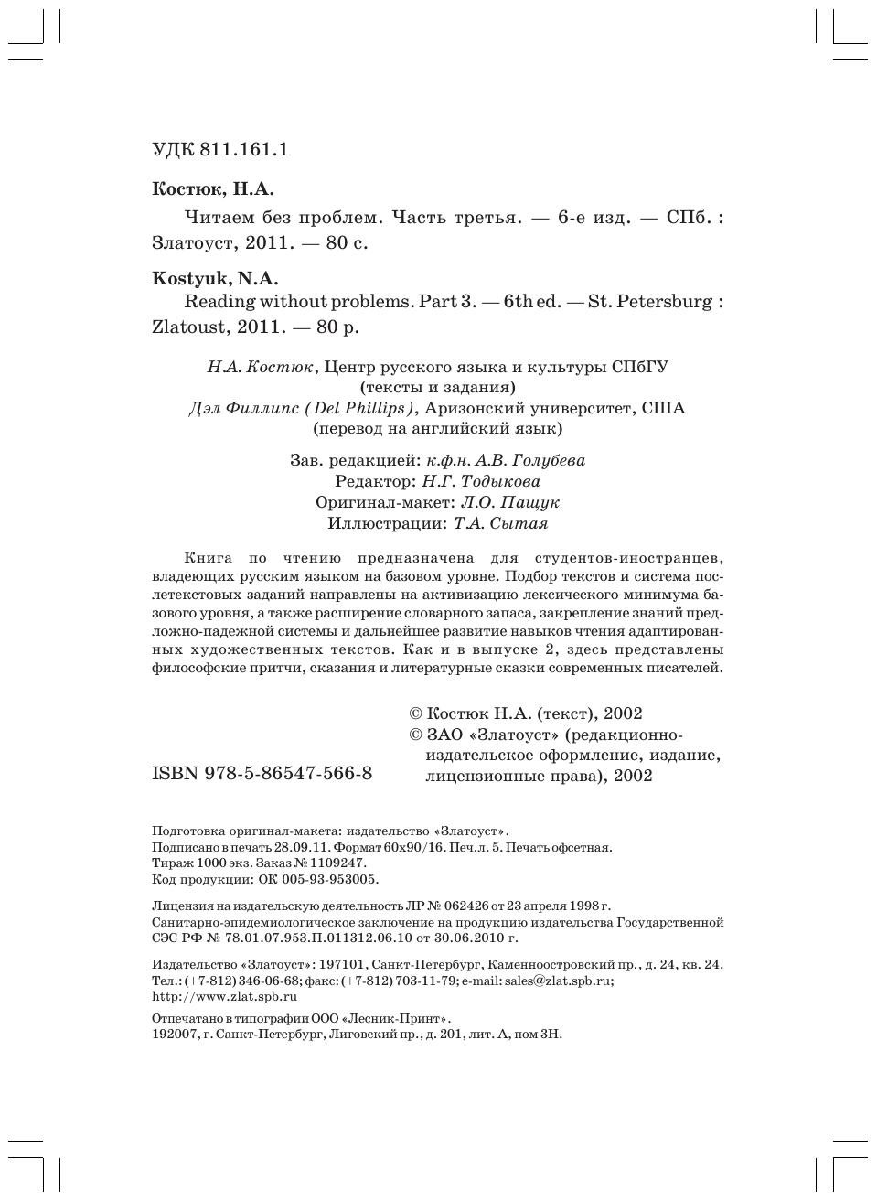 Для начинающих изучать русский язык (базовый уровень (А2)). Полезна тем, кто еще плохо знает русский язык, но очень хочет начать читать что-нибудь элементарное — по языку, а не по содержанию. Содержит короткие и интересные адаптированные тексты с ударениями (лексический минимум — 760 слов), русско-английский притекстовый словарь, упражнения для аудиторной и самостоятельной работы, иллюстрации. Книга также может быть использована в качестве рабочей тетради учащегося. В 4 выпусках. Выпуск третий. Сказки, притчи, истории.