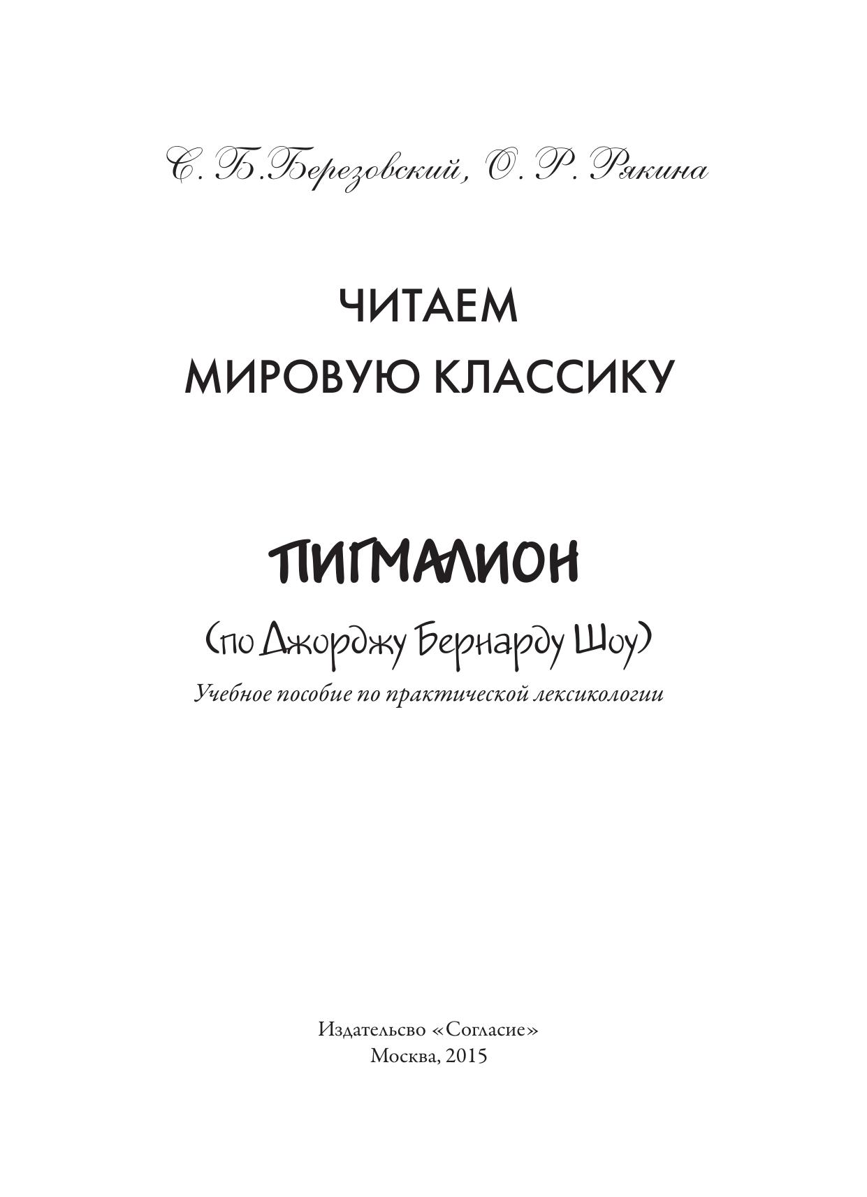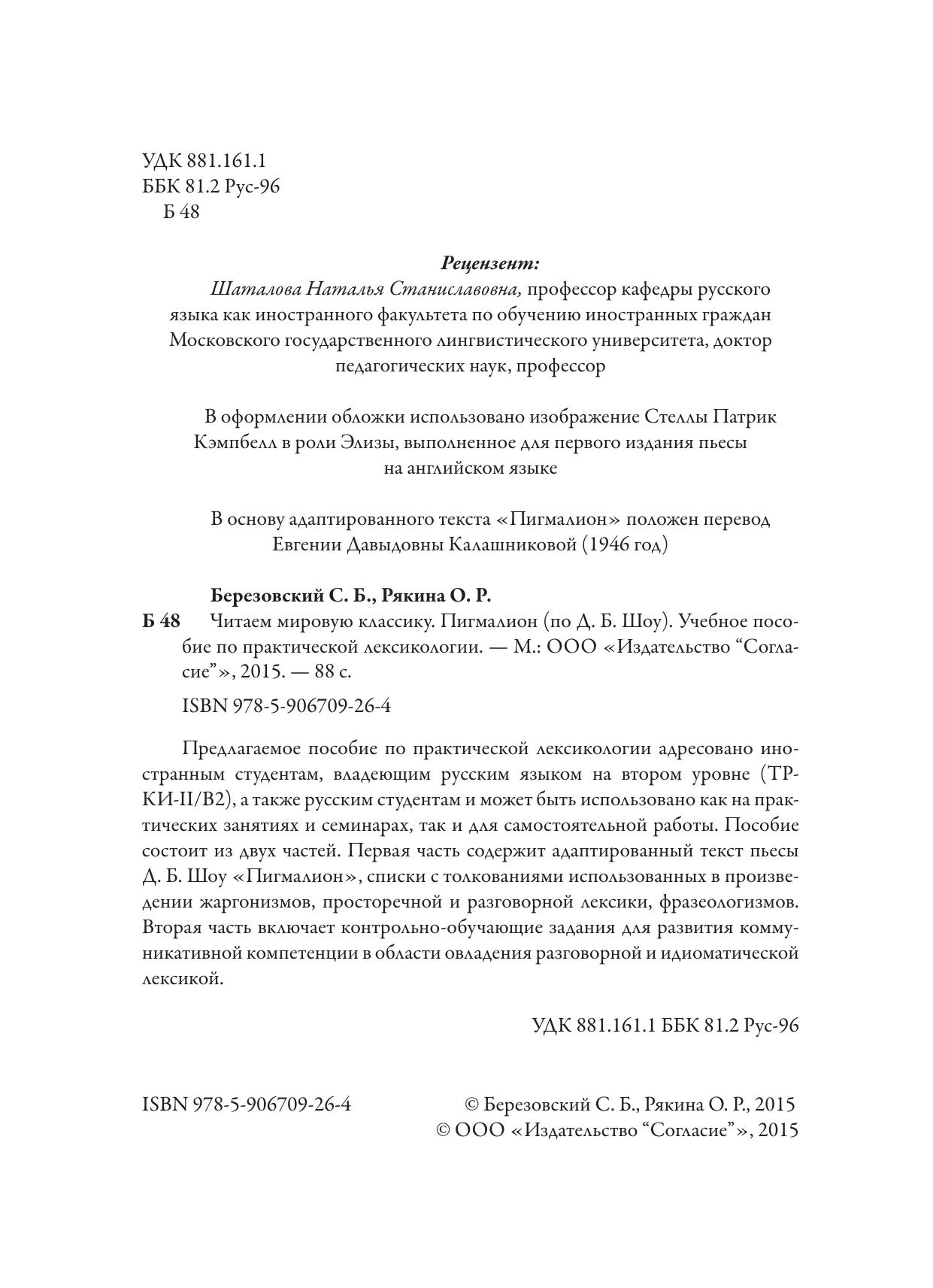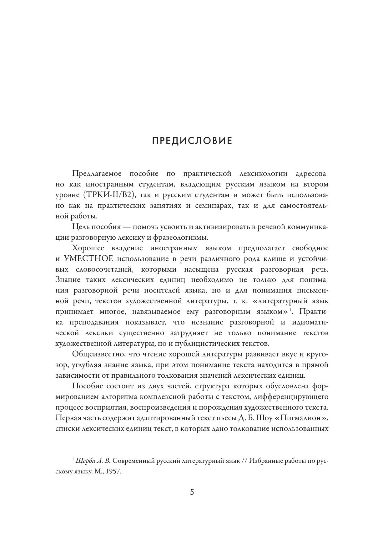 Предлагаемое пособие по практической лексикологии адресовано иностранным студентам, владеющим русским языком на втором уровне (ТР- КИ-II/B2), а также русским студентам и может быть использовано как на практических занятиях и семинарах, так и для самостоятельной работы. Пособие состоит из двух частей. Первая часть содержит адаптированный текст пьесы Д. Б. Шоу "Пигмалион", списки с толкованиями использованных в произведении жаргонизмов, просторечной и разговорной лексики, фразеологизмов. Вторая часть включает контрольно-обучающие задания для развития коммуникативной компетенции в области овладения разговорной и идиоматической лексикой.