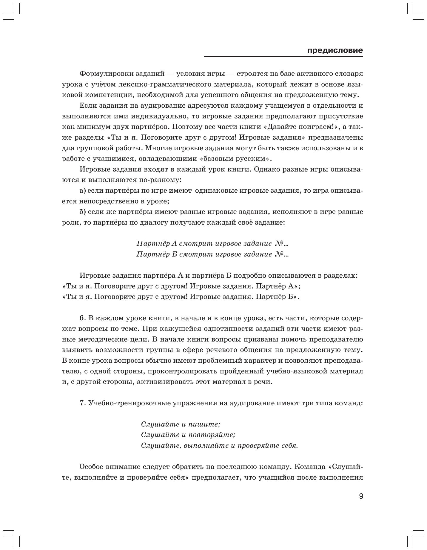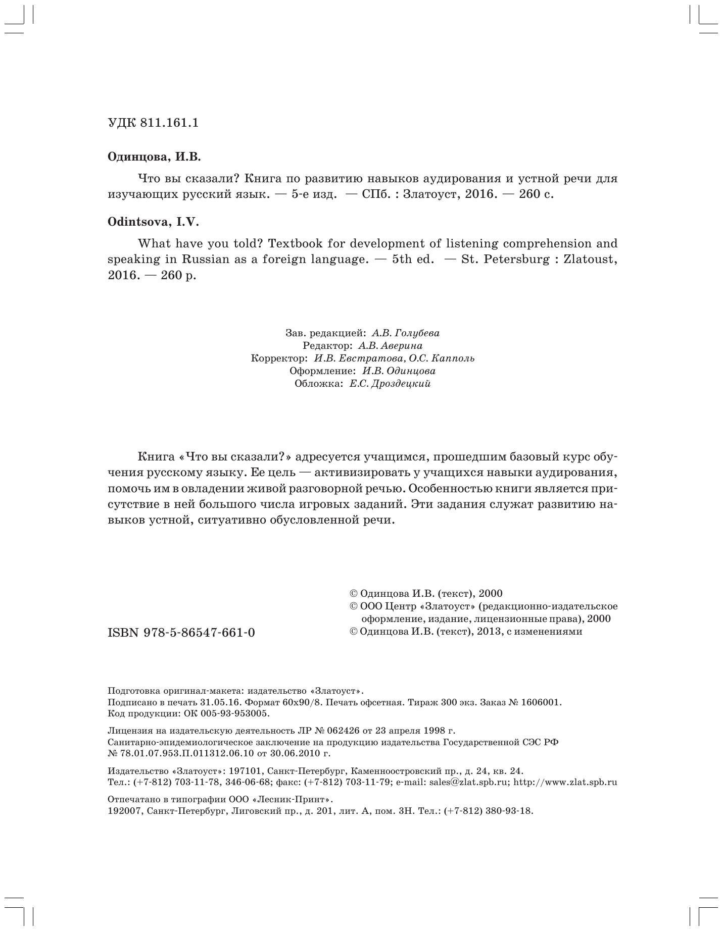 Книга «Что вы сказали?» адресуется учащимся, прошедшим базовый курс обучения русскому языку. Ее цель — активизировать у учащихся навыки аудирования, помочь им в овладении живой разговорной речью. Особенностью книги является присутствие в ней большого числа игровых заданий. Эти задания служат развитию навыков устной, ситуативно обусловленной речи.