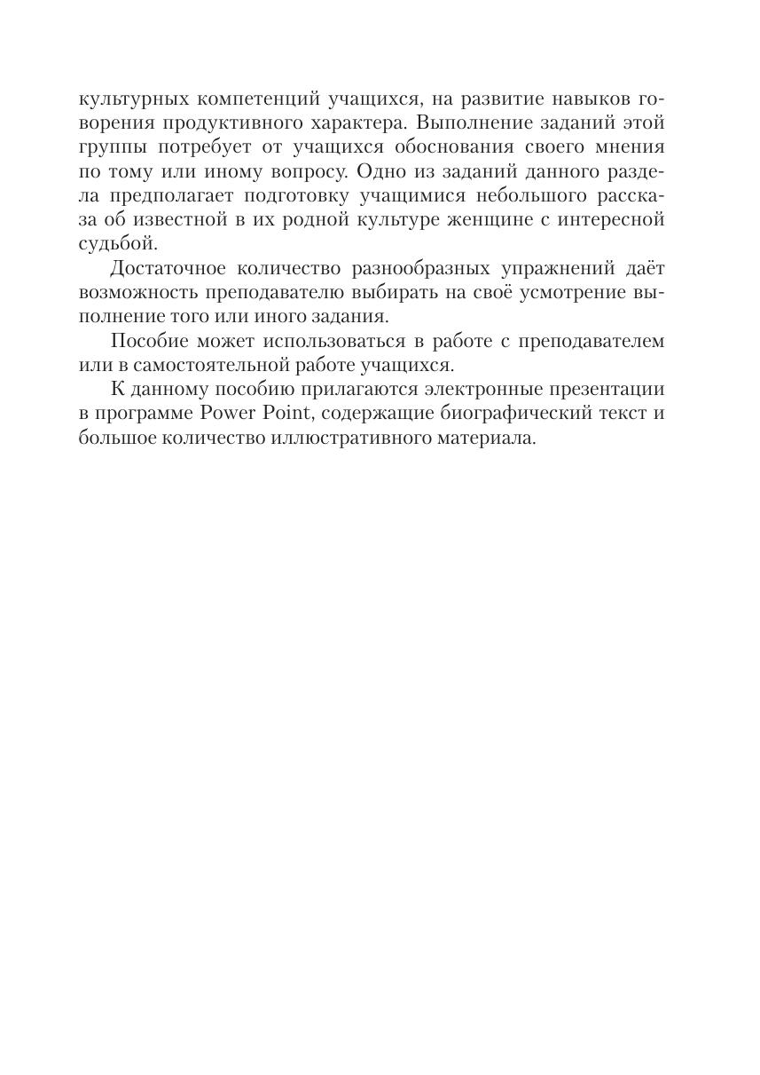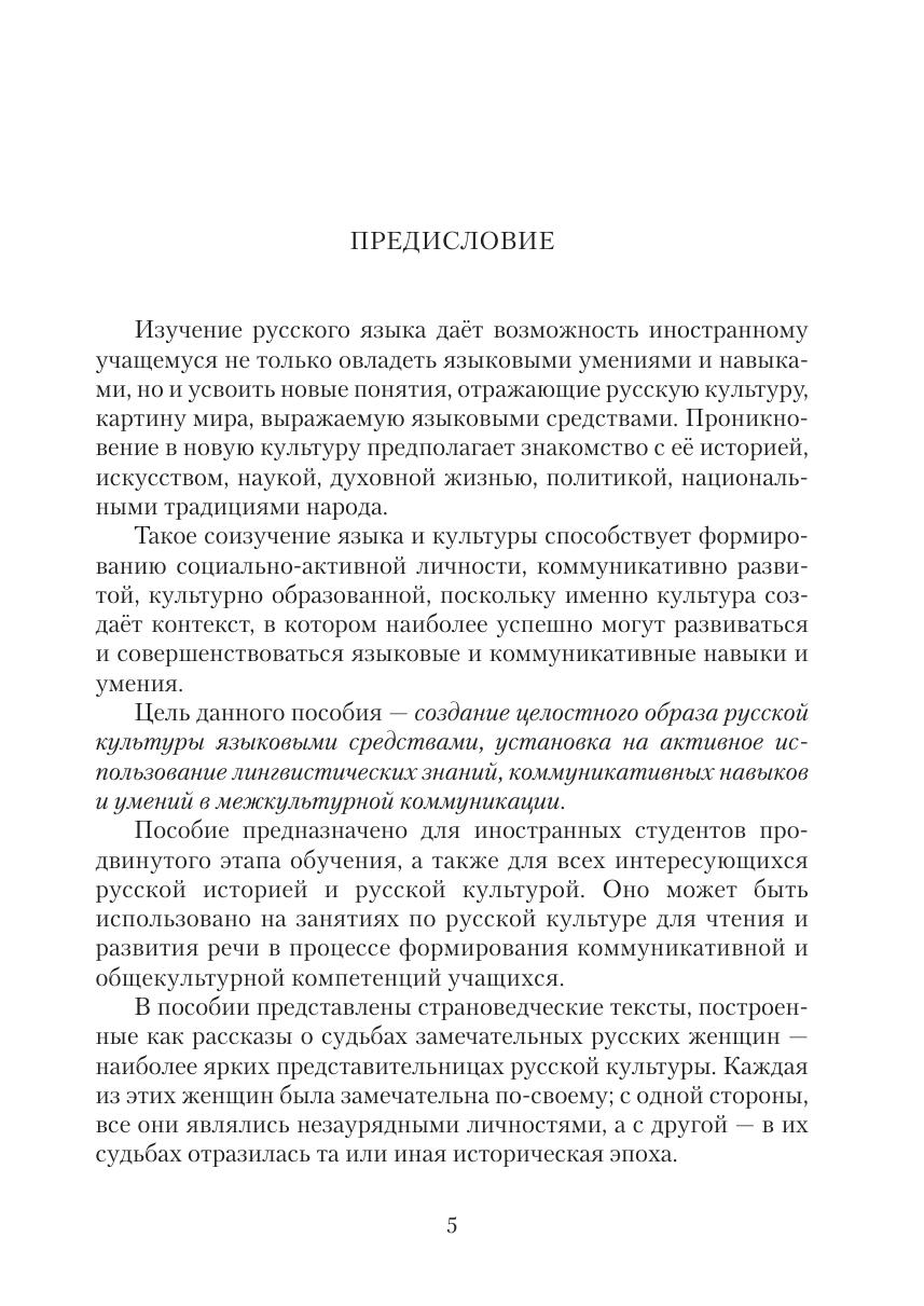 В пособии представлены страноведческие тексты, построенные как рассказы о судьбах замечательных русских женщин — наиболее ярких представительницах русской культуры, в жизни которых отразилась историческая эпоха. Авторы в целях расширения стра-новедческих знаний учащихся наряду с широко