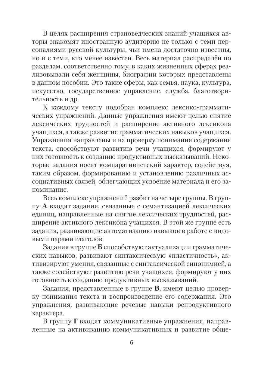 известными персоналиями русской культуры предлагают сведения о тех, кто менее известен иностранной аудитории. Материал распределён по разде-лам, соответственно тому, в каких жизненных сферах реализовывали себя женщины, биографии которых представлены в данном посо-бии. К каждому тексту