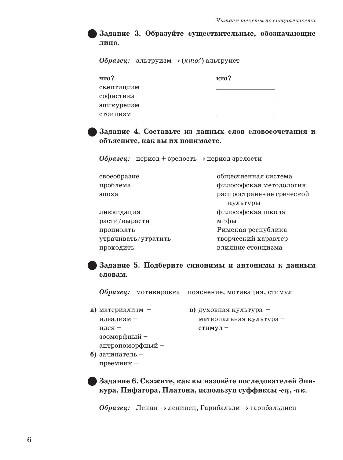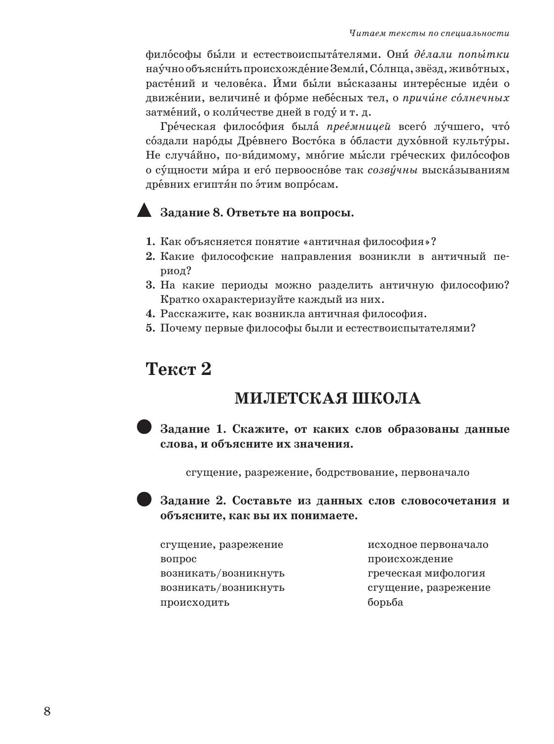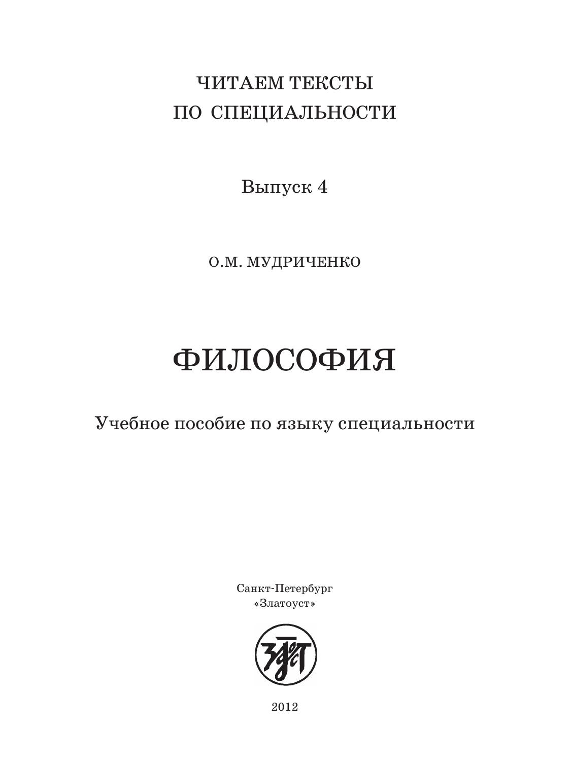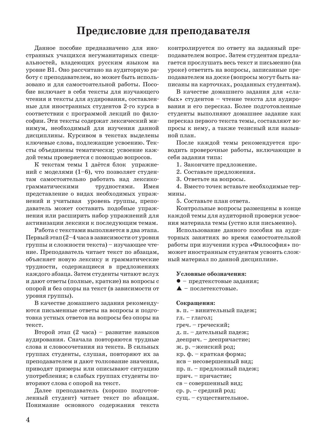 Читаем тексты по специальности вып. 4. Пособие основано на научно-популярных текстах, большая часть которых является переработанным и адаптированным материалом из учебного словаря-справочника «Великие философы» и издания «Великие мыслители Запада». В пособии 7 тем, представленных тематическими блоками, в каждом из которых не менее двух текстов. Тексты сопровождаются предтекстовыми и послетекстовыми заданиями, направленными на проверку усвоения лексического минимума по теме и содержания текстов. Работа с текстами предполагает формирование знаний, навыков и умений в различных видах чтения, а также говорения, письма. Тексты для аудирования собраны в отдельный блок. Пособие предназначено для студентов, владеющих русским языком как иностранным на уровне ТРКИ-1 (B1) и изучающих общеобразовательную дисциплину «Философия». Входит в серию «Читаем тексты по специальности», которая предназначена для студентов, изучающих русский язык на основном этапе обучения.