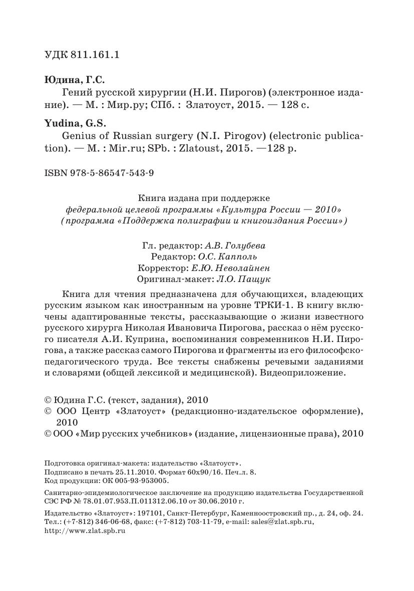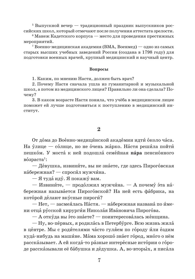 Книга для чтения предназначена для обучающихся, владеющих русским языком как иностранным на уровне ТРКИ-1. В книгу включены адаптированные тексты, рассказывающие о жизни известного русского хирурга Николая Ивановича Пирогова, рассказ о нём русского писателя А.И. Куприна, воспоминания современников Н.И. Пирогова, а также рассказ самого Пирогова и фрагменты из его философско-педагогического труда. Все тексты снабжены речевыми заданиями и словарями (общей лексикой и медицинской).