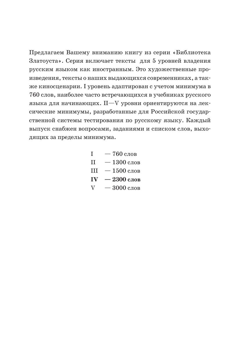 Предлагаем Вашему вниманию книгу из серии "Библиотека Златоуста". Серия включает тексты для 5 уровней владения русским языком как иностранным. Это художественные произведения, тексты о наших выдающихся современниках, а также киносценарии. I уровень адаптирован с учетом минимума в 760 слов, наиболее часто встречающихся в учебниках русского языка для начинающих. II-V уровни ориентируются на лексические минимумы, разработанные для Российской государственной системы тестирования по русскому языку. Каждый выпуск снабжен вопросами, заданиями и списком слов, выходящих за пределы минимума.