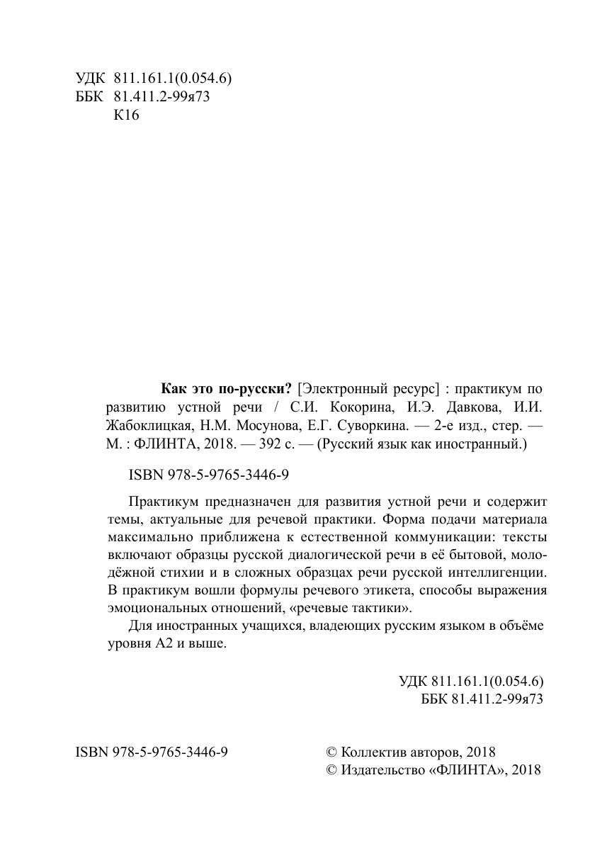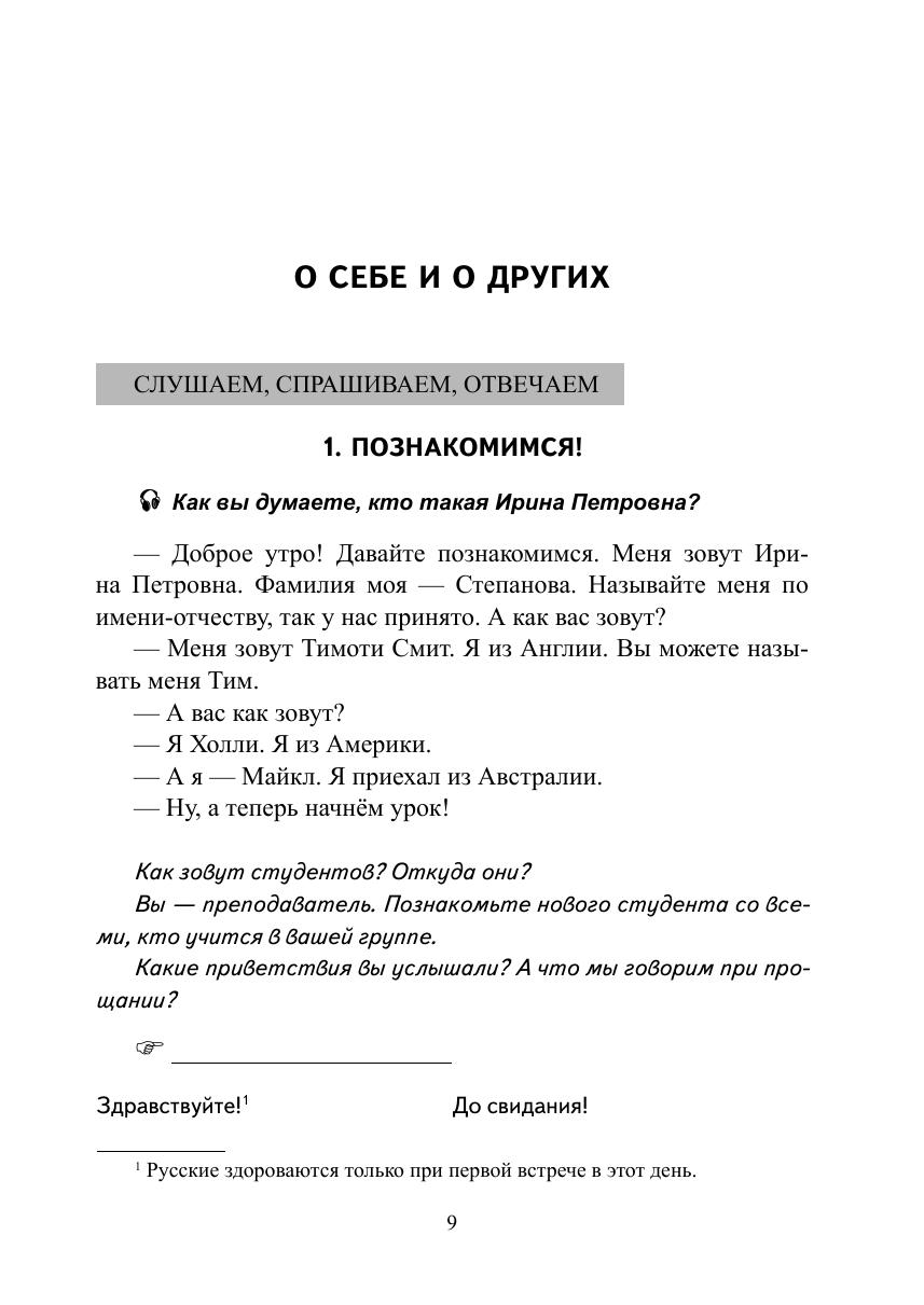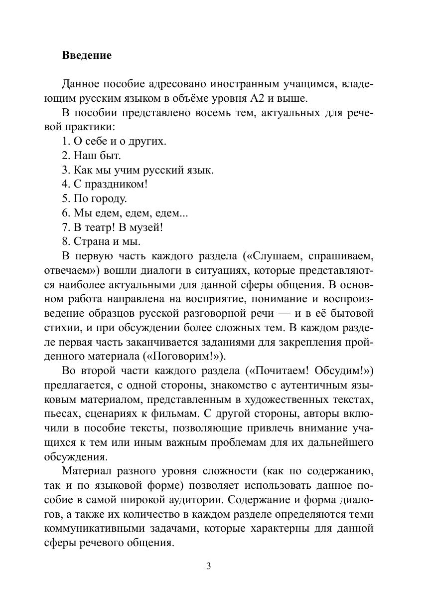 Практикум предназначен для развития устной речи и содержит темы, актуальные для речевой практики. Форма подачи материала максимально приближена к естественной коммуникации: тексты включают образцы русской диалогической речи в её бытовой, молодёжной стихии и в сложных образцах речи русской интеллигенции. В практикум вошли формулы речевого этикета, способы выражения эмоциональных отношений, «речевые тактики». Для иностранных учащихся, владеющих русским языком в объёме уровня А2 и выше.