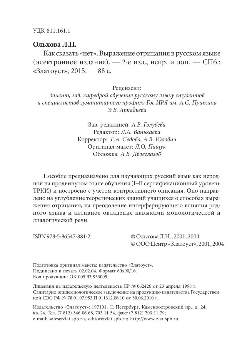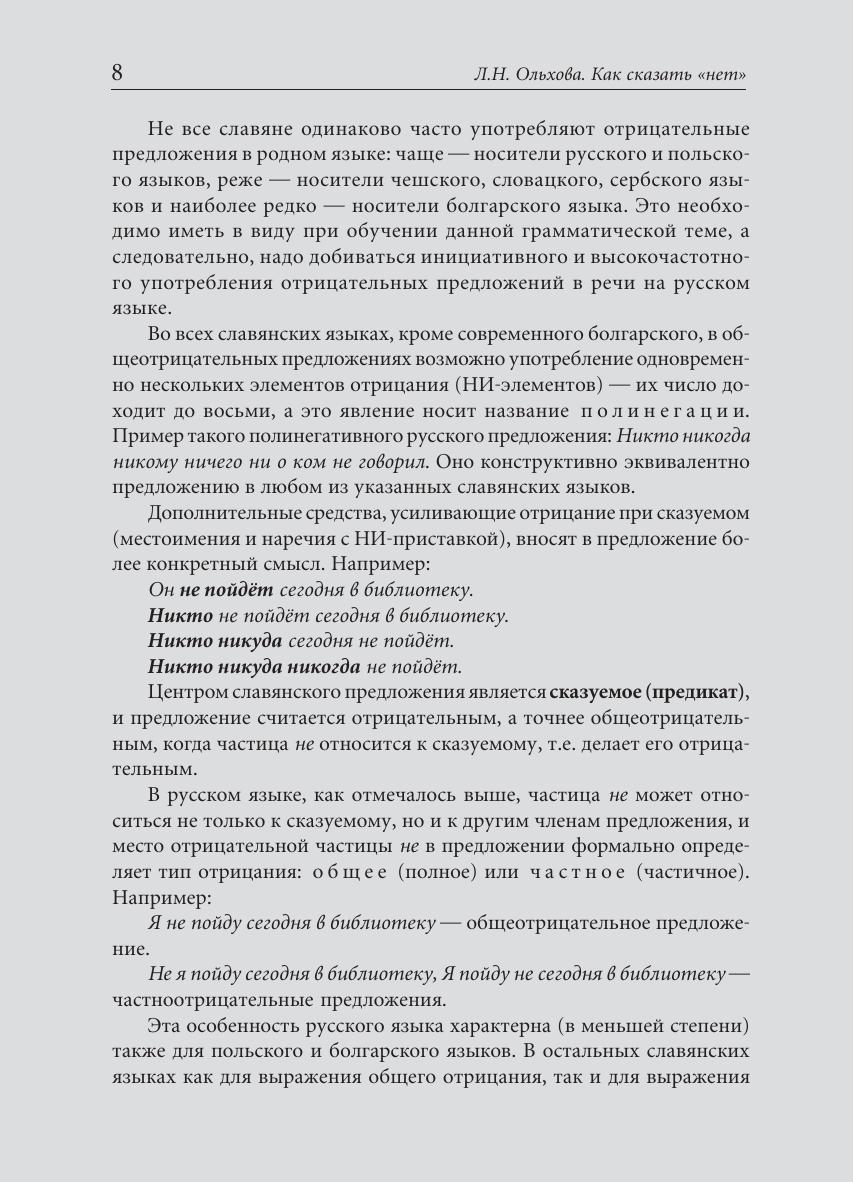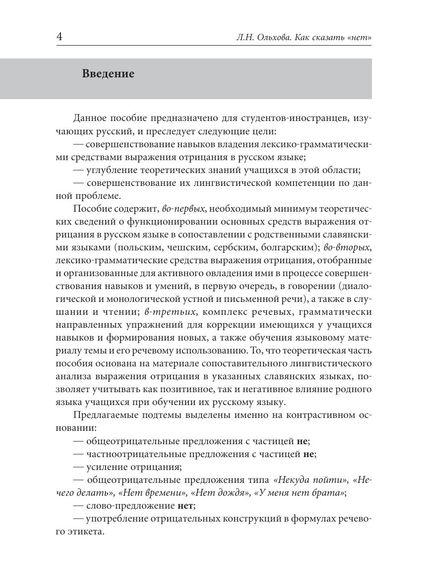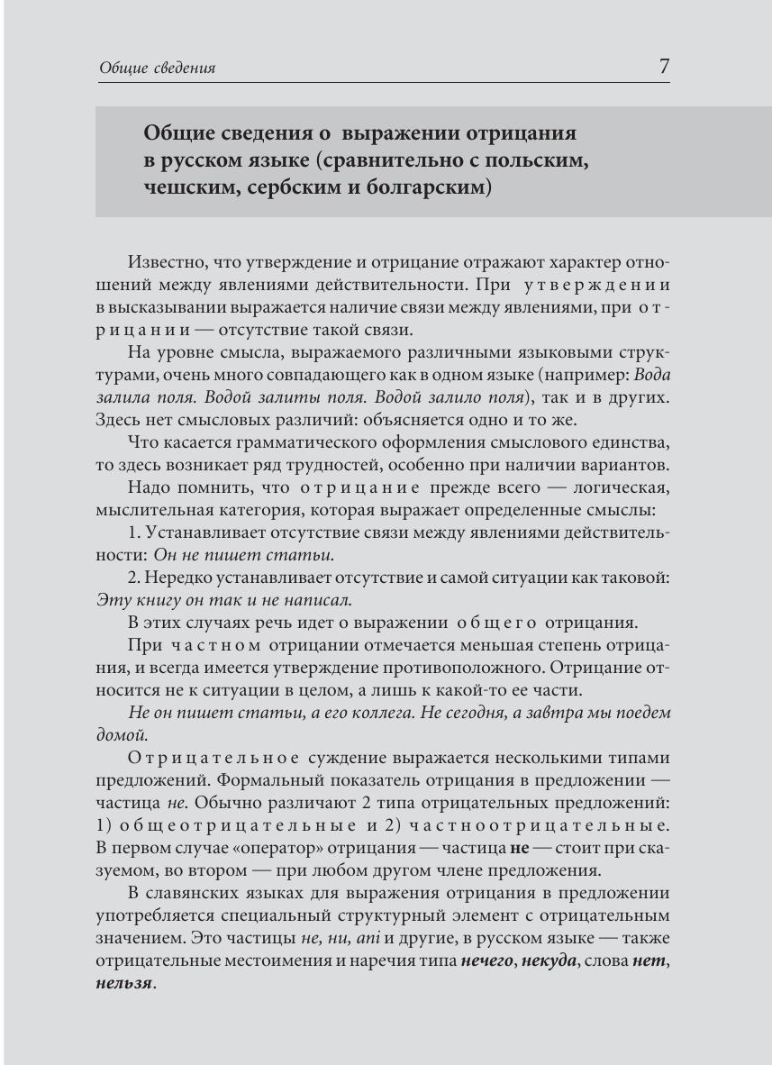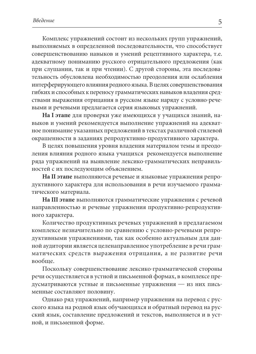 Пособие предназначено для изучающих русский язык как неродной на продвинутом этапе обучения (I–II сертификационный уровень ТРКИ) и построено с учетом контрастивного описания. Оно направлено на углубление теоретических знаний учащихся о способах выражения отрицания, на преодоление интерферирующего влияния родного языка и активное овладение навыками монологической и диалогической речи.
