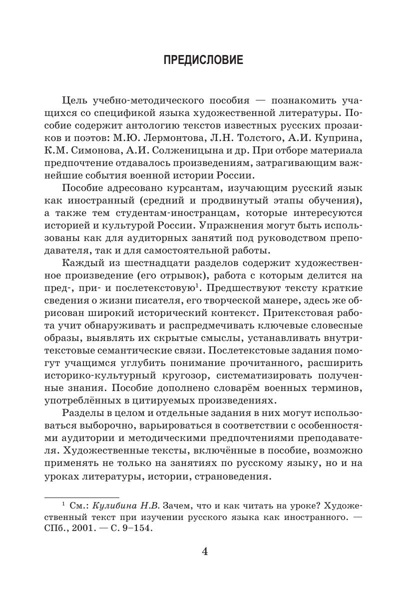 Учебное пособие представляет собой методические разработки для занятий по русскому языку как иностранному на материале военной прозы. Пособие включает как поэтические (М.Ю. Лермонтов, Ю.В. Друнина), так и прозаические (Л.Н. Толстой, А.И. Куприн, К.М. Симонов, А.И. Солженицын и др.) произведения и отрывки. Ориентировано на средний и продвинутый уровни (В1–В2). Рекомендуется для слушателей военных учебных заведений.