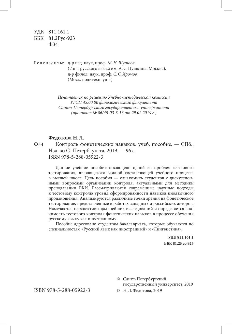 Данное учебное пособие посвящено одной из проблем языкового тестирования, являющегося важной составляющей учебного процесса в высшей школе. Цель пособия — ознакомить студентов с дискуссионными вопросами организации контроля, актуальными для методики преподавания РКИ. Рассматриваются современные научные подходы к тестовому контролю уровня сформированности навыков иноязычного произношения. Анализируются различные точки зрения на фонетическое тестирование, представленные в работах западных и российских авторов. Намечаются перспективы дальнейших исследований и определяется значимость тестового контроля фонетических навыков в процессе обучения русскому языку как иностранному. Пособие адресовано студентам бакалавриата, которые обучаются по специальностям «Русский язык как иностранный» и «Лингвистика».