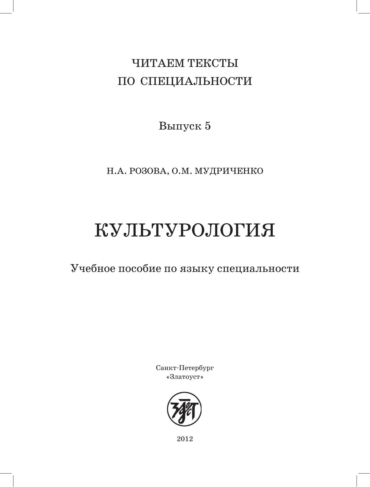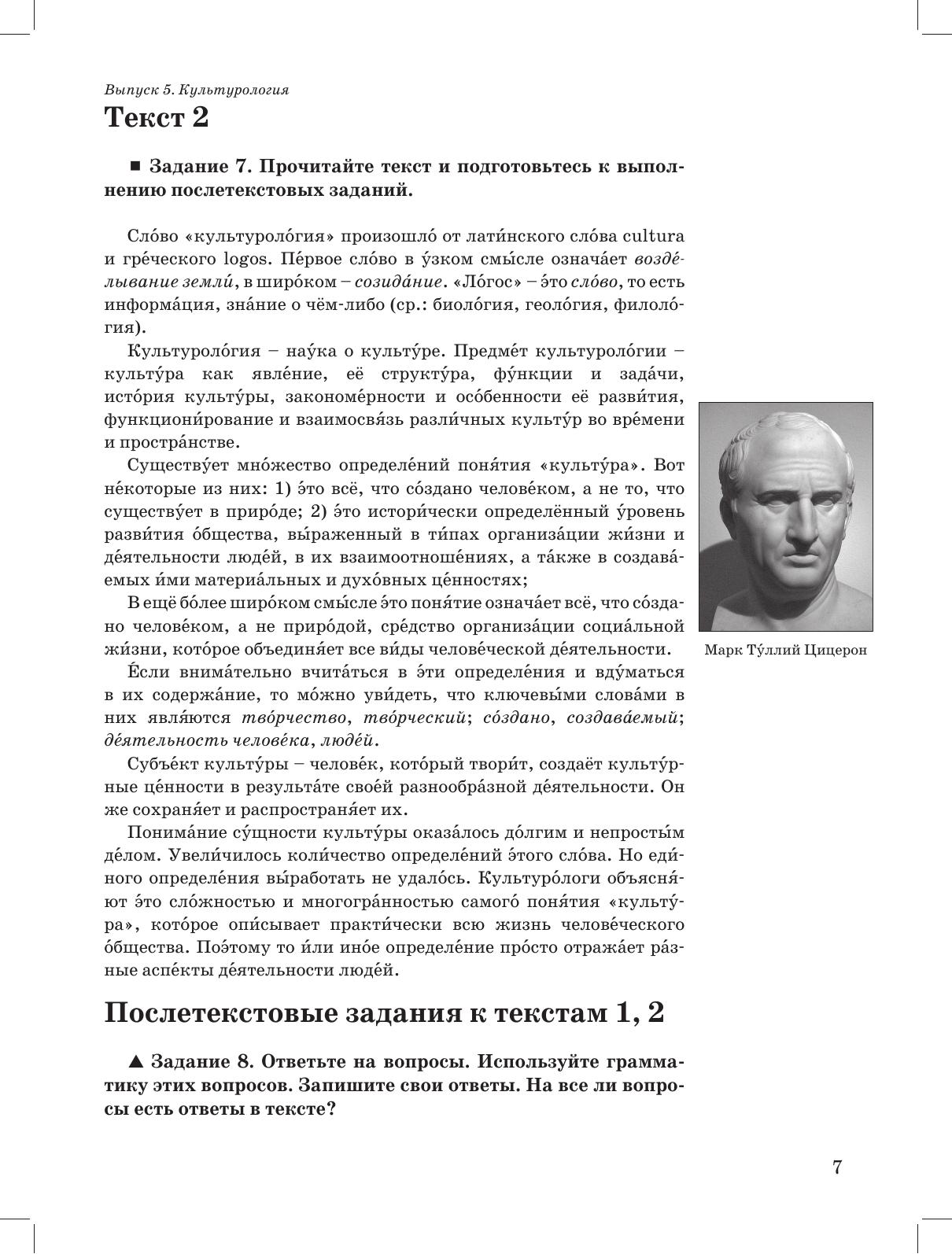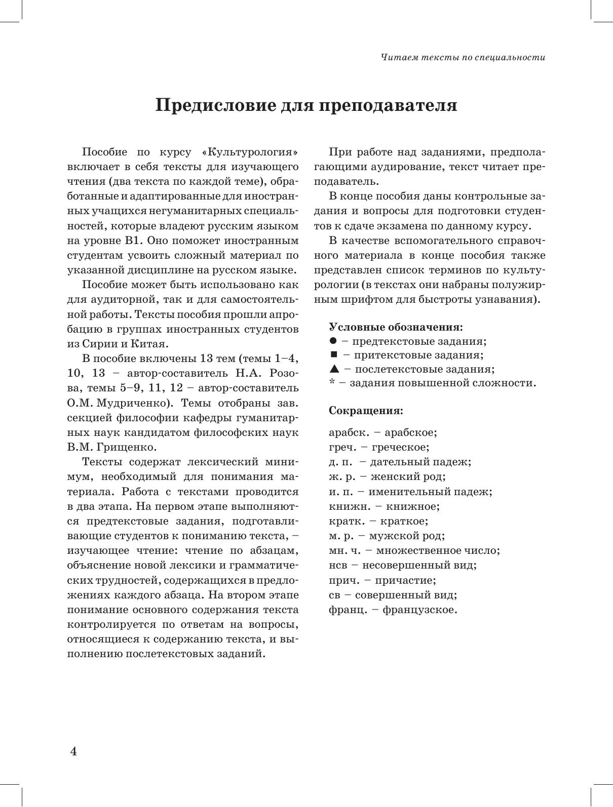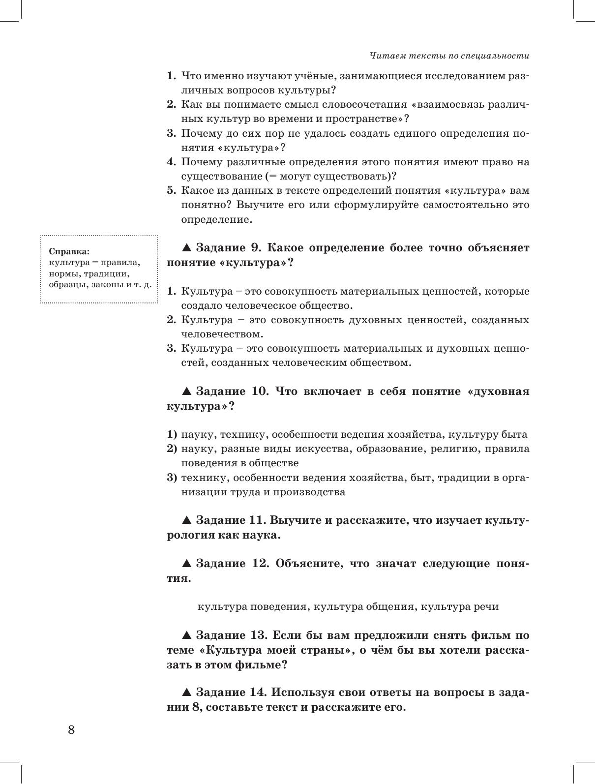 Читаем тексты по специальности вып. 5. Пособие по курсу «Культурология» адресовано иностранным учащимся негуманитарных специальностей, владеющим русским языком на уровне В1. Оно включает адаптированные тексты с лексическим минимумом, необходимым для усвоения каждой темы. В конце пособия представлен справочный материал – список терминов, некоторые из них встречаются в текстах. Пособие может быть использовано как для аудиторной работы под руководством преподавателя, так и для самостоятельной работы студентов. Кроме того, оно может быть использовано преподавателями в учебных целях как материал для организации различной дополнительной/самостоятельной работы студентов.