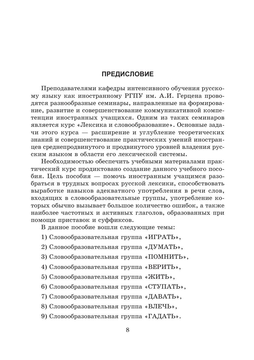 Цель пособия — помочь иностранным учащимся разобраться в трудных вопросах русской лексики, способствовать выработке навыков адекватного употребления в речи слов, входящих в словообразовательные группы, употребление которых обычно вызывает большое количество ошибок, а также наиболее частотных и активных глаголов, образованных при помощи приставок и суффиксов. Для иностранных учащихся среднего и среднепродвинутого этапов обучения русскому языку.