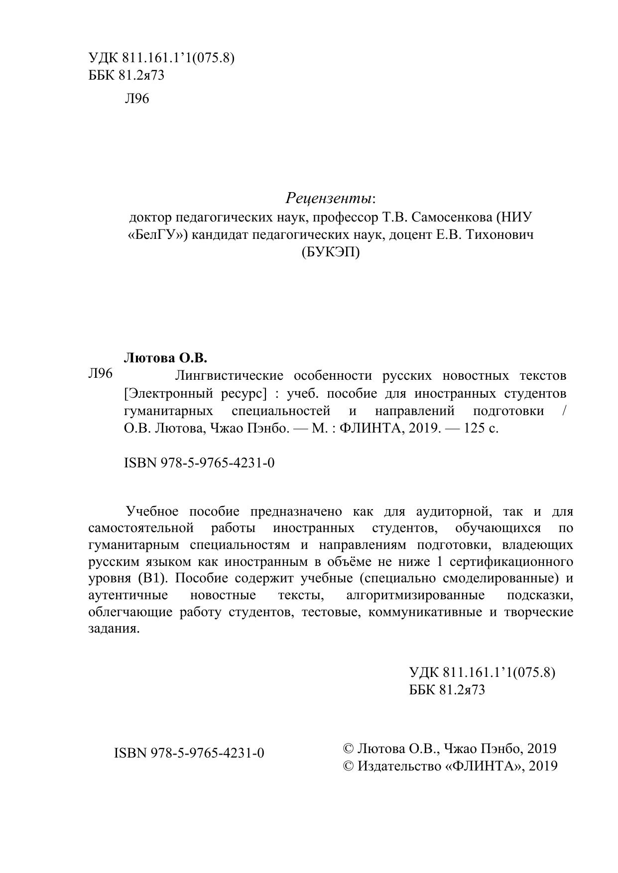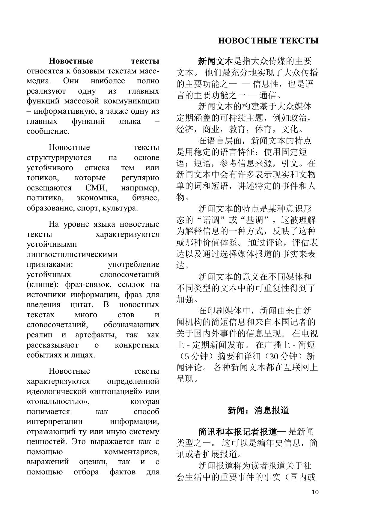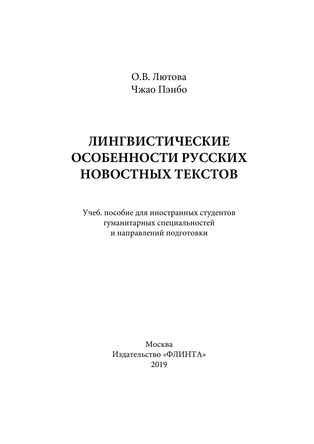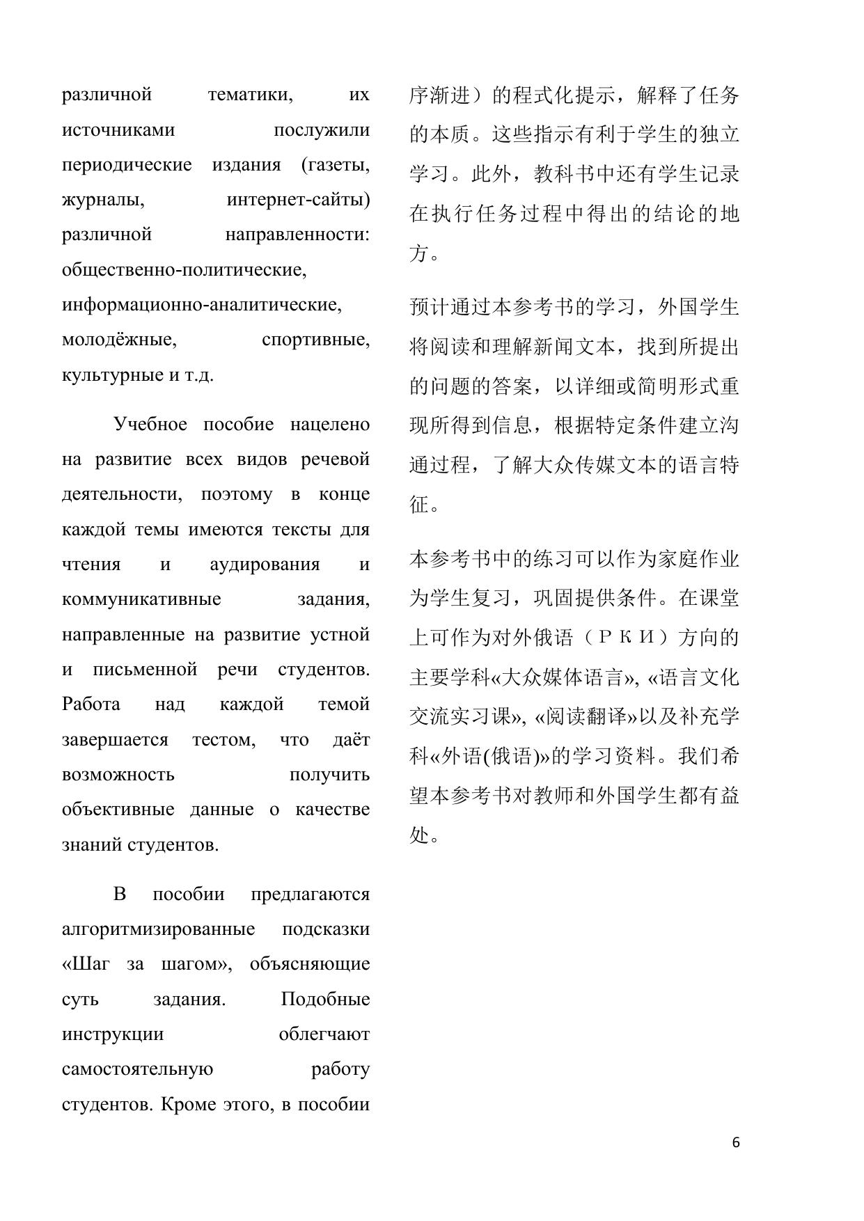 Учебное пособие предназначено как для аудиторной, так и для самостоятельной работы иностранных студентов, обучающихся по гуманитарным специальностям и направлениям подготовки, владеющих русским языком как иностранным в объёме не ниже 1 сертификационного уровня (В1). Пособие содержит учебные (специально смоделированные) и аутентичные новостные тексты, алгоритмизированные подсказки, облегчающие работу студентов, тестовые, коммуникативные и творческие задания.