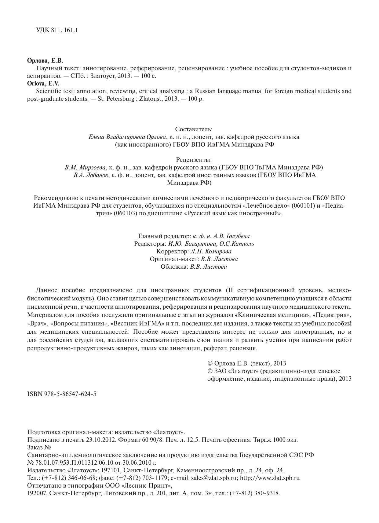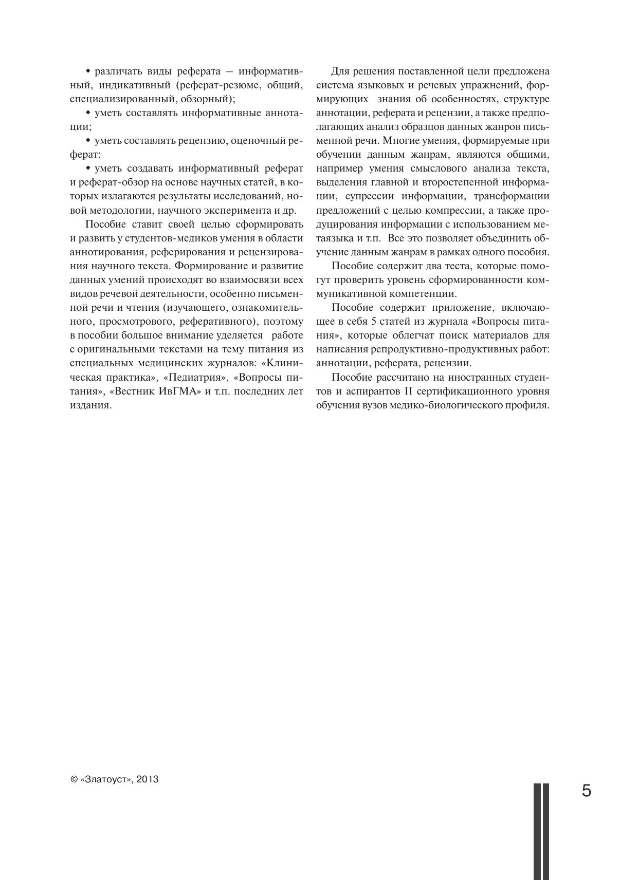 Данное пособие предназначено для иностранных студентов (II сертификационный уровень, медико-биологический модуль). Оно ставит целью совершенствовать коммуникативную компетенцию учащихся в областиписьменной речи, в частности аннотирования, реферирования и рецензирования научного медицинского текста. Материалом для пособия послужили оригинальные статьи из журналов «Клиническая медицина», «Педиатрия», «Врач», «Вопросы питания», «Вестник ИвГМА» и т.п. последних лет издания, а также тексты из учебных пособий для медицинских специальностей. Пособие может представлять интерес не только для иностранных, но и для российских студентов, желающих систематизировать свои знания и развить умения при написании работ репродуктивно-продуктивных жанров, таких как аннотация, реферат, рецензия.