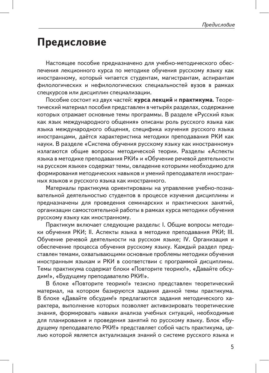 В учебном пособии рассматриваются общие вопросы преподавания русского языка как иностранного, методика обучения языковым аспектам и видам речевой деятельности. Лингвистические, научно-методические и учебно-методические материалы пособия направлены на совершенствование коммуникативной компетенции, формирование методических навыков и развитие методических умений будущих преподавателей. Учебное пособие предназначено для студентов, магистрантов, аспирантов филологических специальностей, в том числе и иностранных.