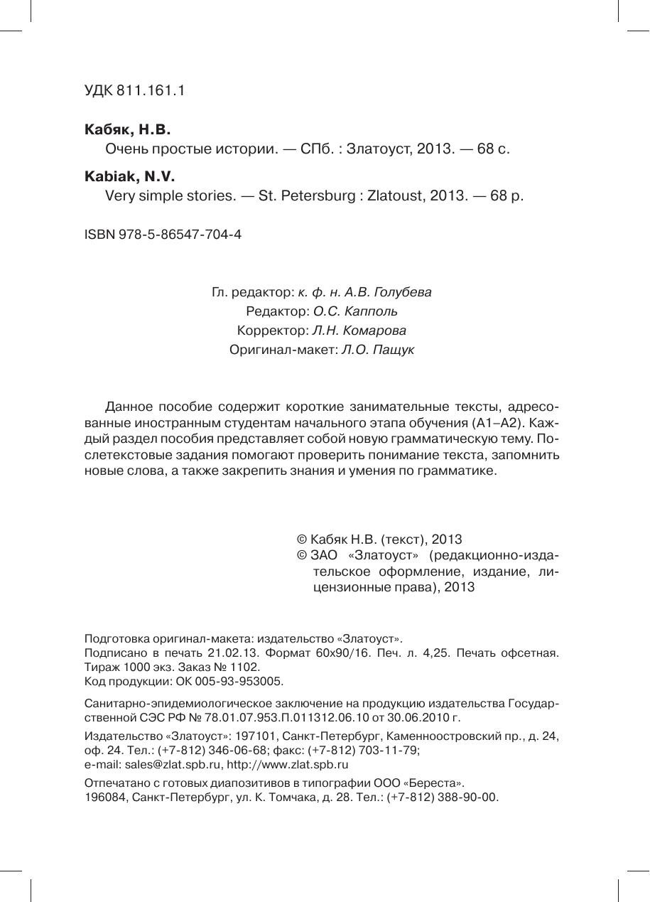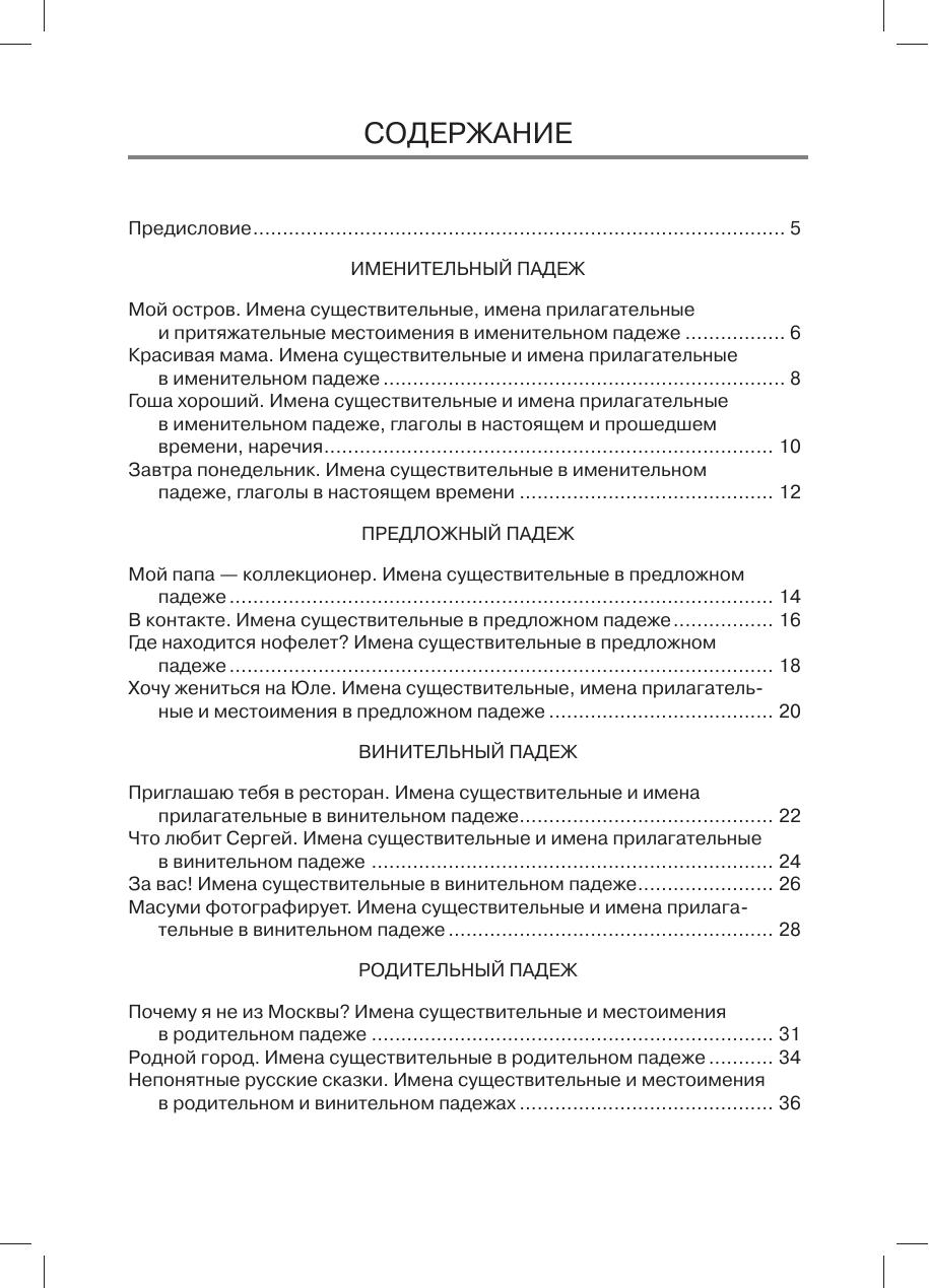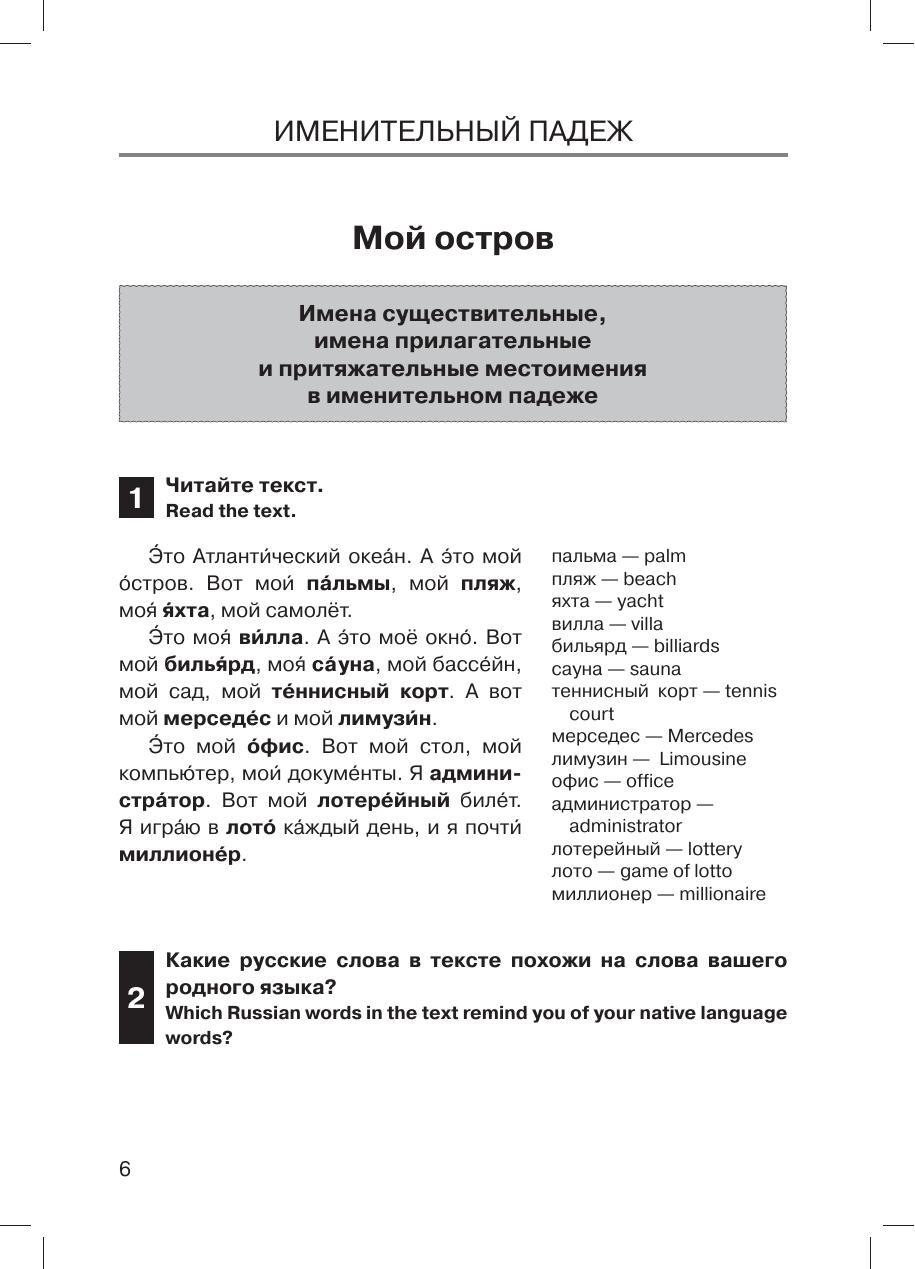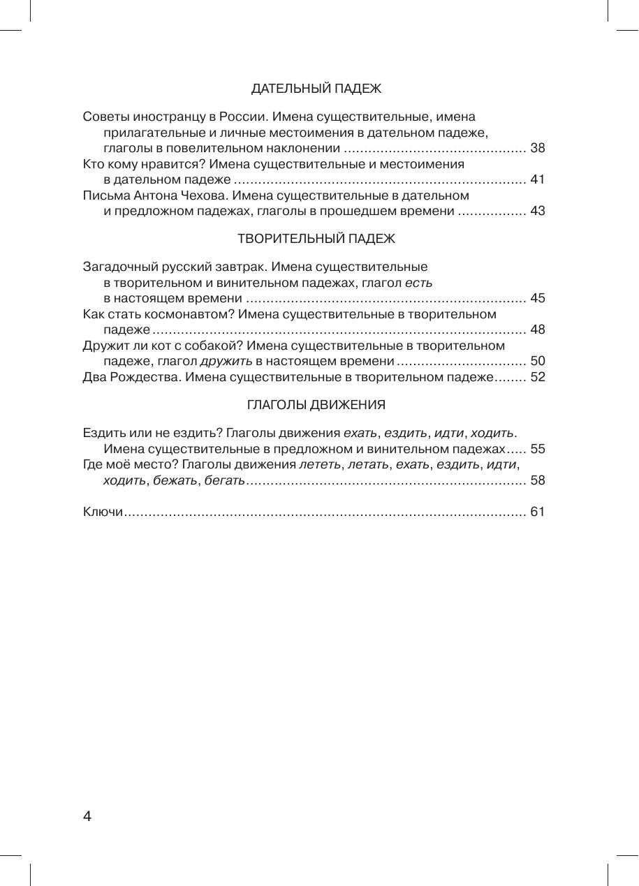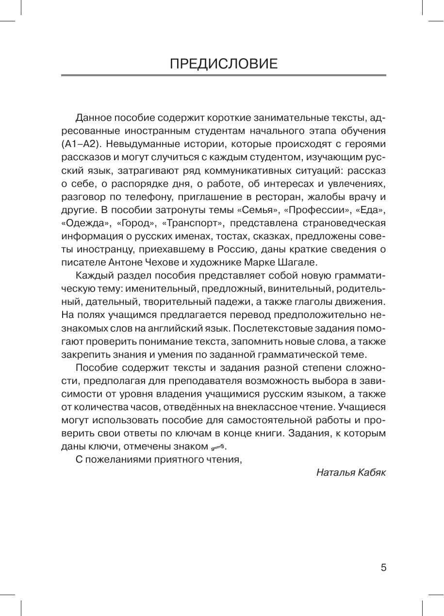 Данное пособие содержит короткие занимательные тексты, адресованные иностранным студентам начального этапа обучения (А1–А2). Каждый раздел пособия представляет собой новую грамматическую тему. Послетекстовые задания помогают проверить понимание текста, запомнить новые слова, а также закрепить знания и умения по грамматике.