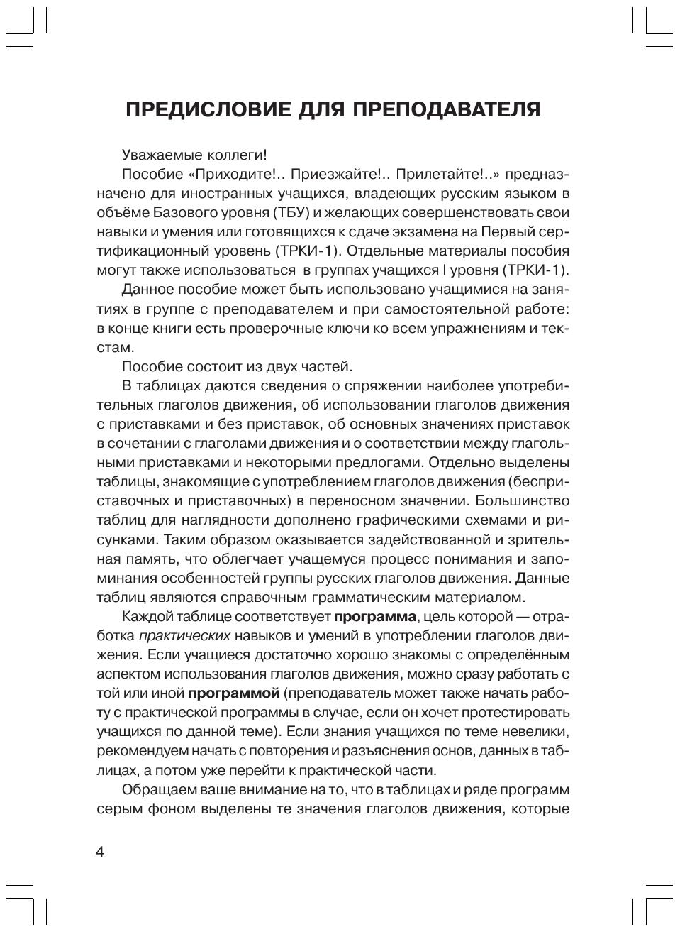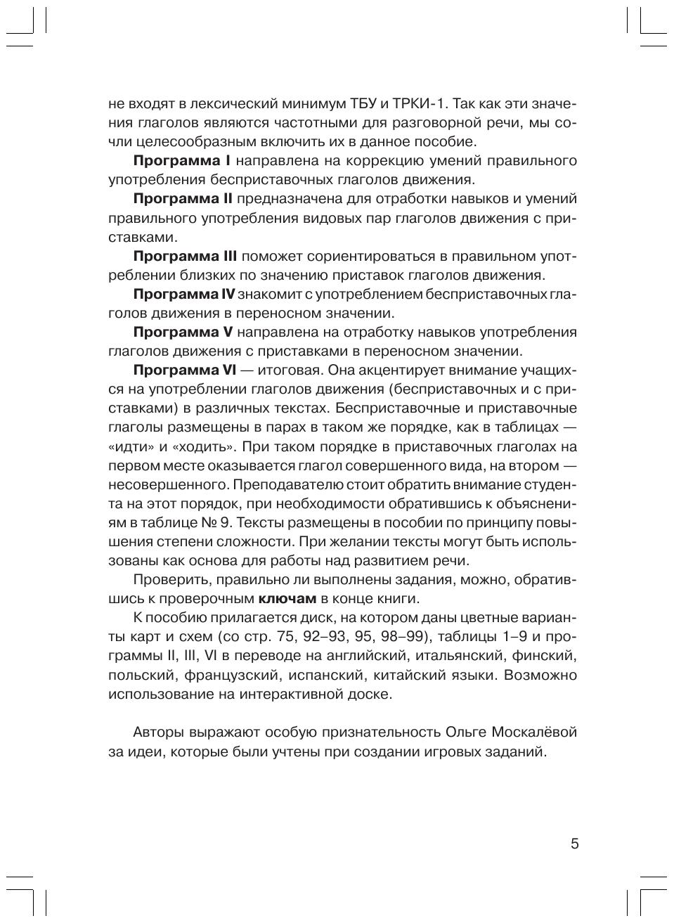 Сборник упражнений по грамматической теме «Глаголы движения» для иностранных учащихся, владеющих русским языком в объеме Базового уровня (ТБУ). Отдельные материалы пособия могут также использоваться в группах учащихся I уровня (ТРКИ 1). Небольшой объем книги позволяет как включать ее в языковую программу, рассчитанную на долгий период, так и использовать ее на краткосрочных курсах русского языка. Ко всем упражнениям имеются ключи. Цветные карты и схемы, а также переводы грамматических таблиц записаны на CD.
