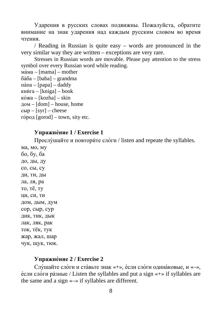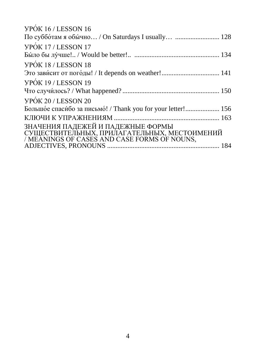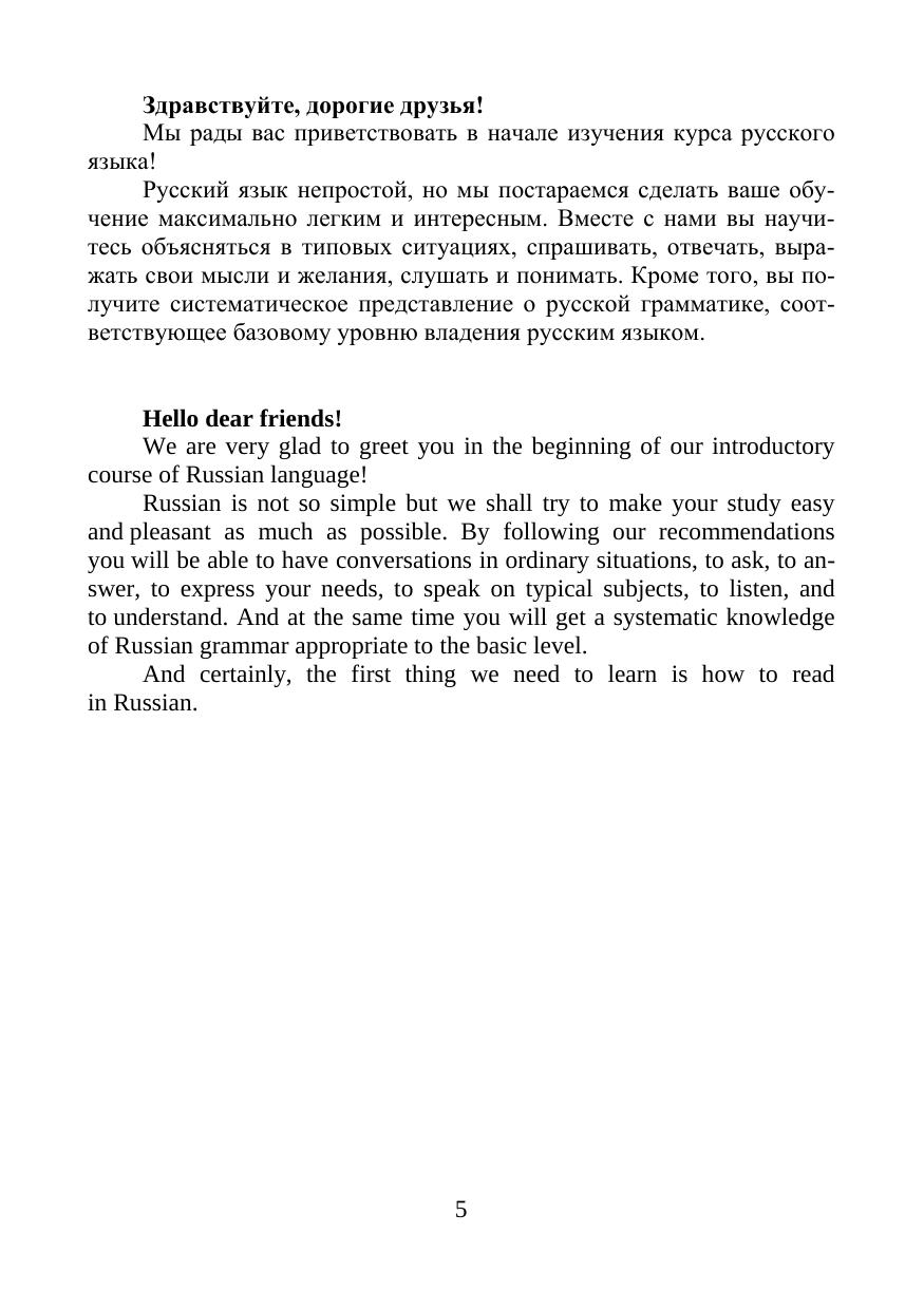 Учебное пособие cодержит 20 уроков, включающих диалоги, тексты, грамматический материал и упражнения к нему. Допускает возможность самостоятельного изучения. Предназначено для обучения русскому языку как иностранному на начальном этапе.