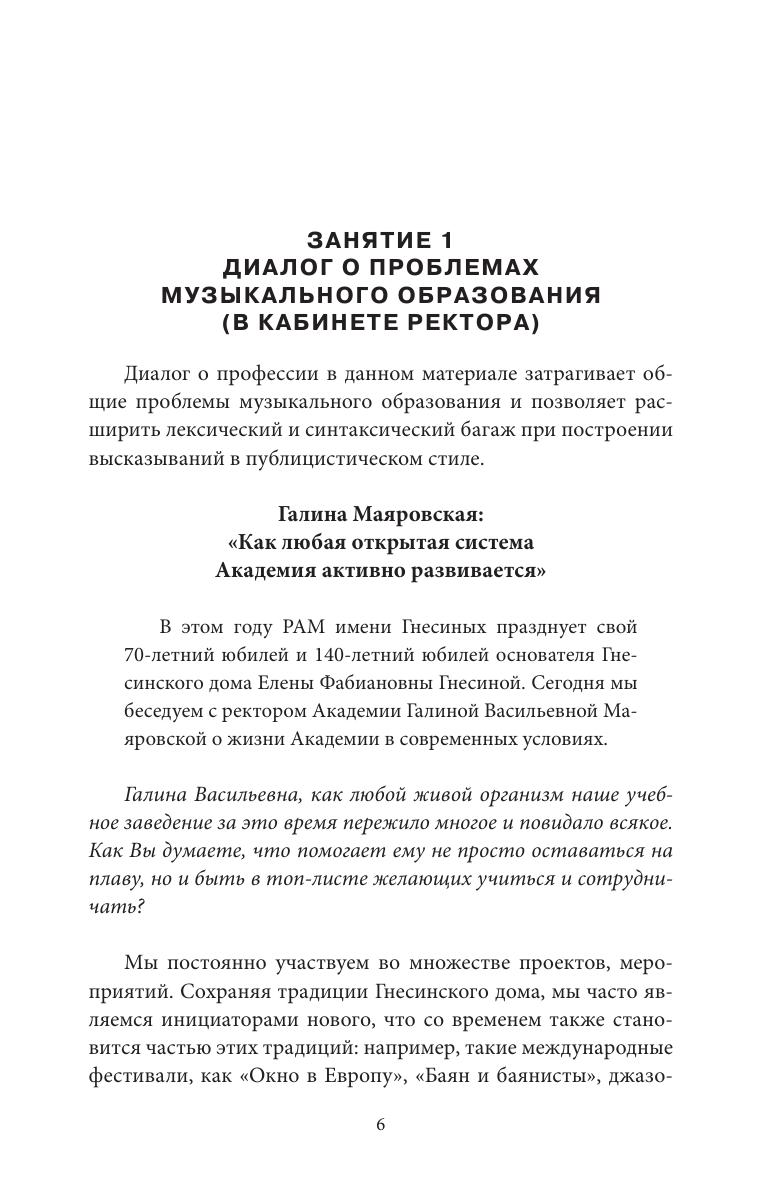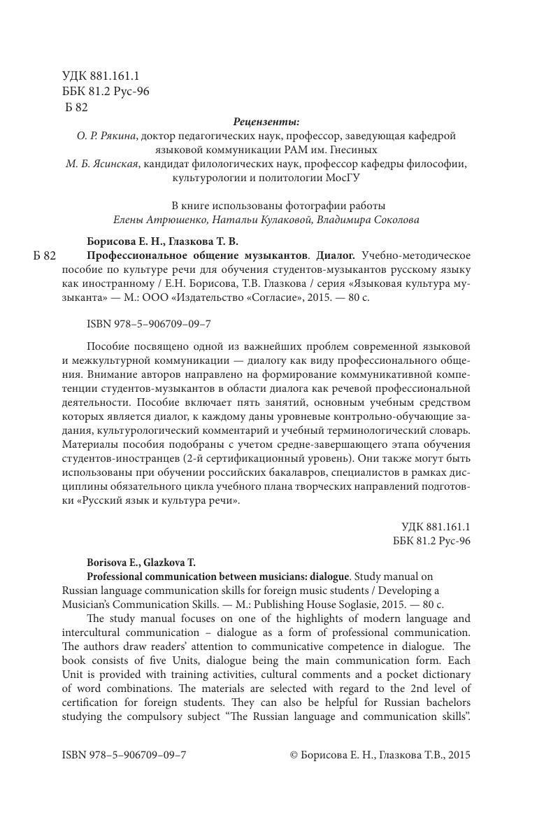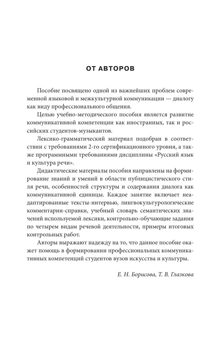 Пособие посвящено одной из важнейших проблем современной языковой и межкультурной коммуникации — диалогу как виду профессионального общения. Внимание авторов направлено на формирование коммуникативной компетенции студентов-музыкантов в области диалога как речевой профессиональной деятельности. Пособие включает пять занятий, основным учебным средством которых является диалог, к каждому даны уровневые контрольно-обучающие задания, культурологический комментарий и учебный терминологический словарь. Материалы пособия подобраны с учетом средне-завершающего этапа обучения студентов-иностранцев (2?й сертификационный уровень). Они также могут быть использованы при обучении российских бакалавров, специалистов в рамках дисциплины обязательного цикла учебного плана творческих направлений подготовки «Русский язык и культура речи».