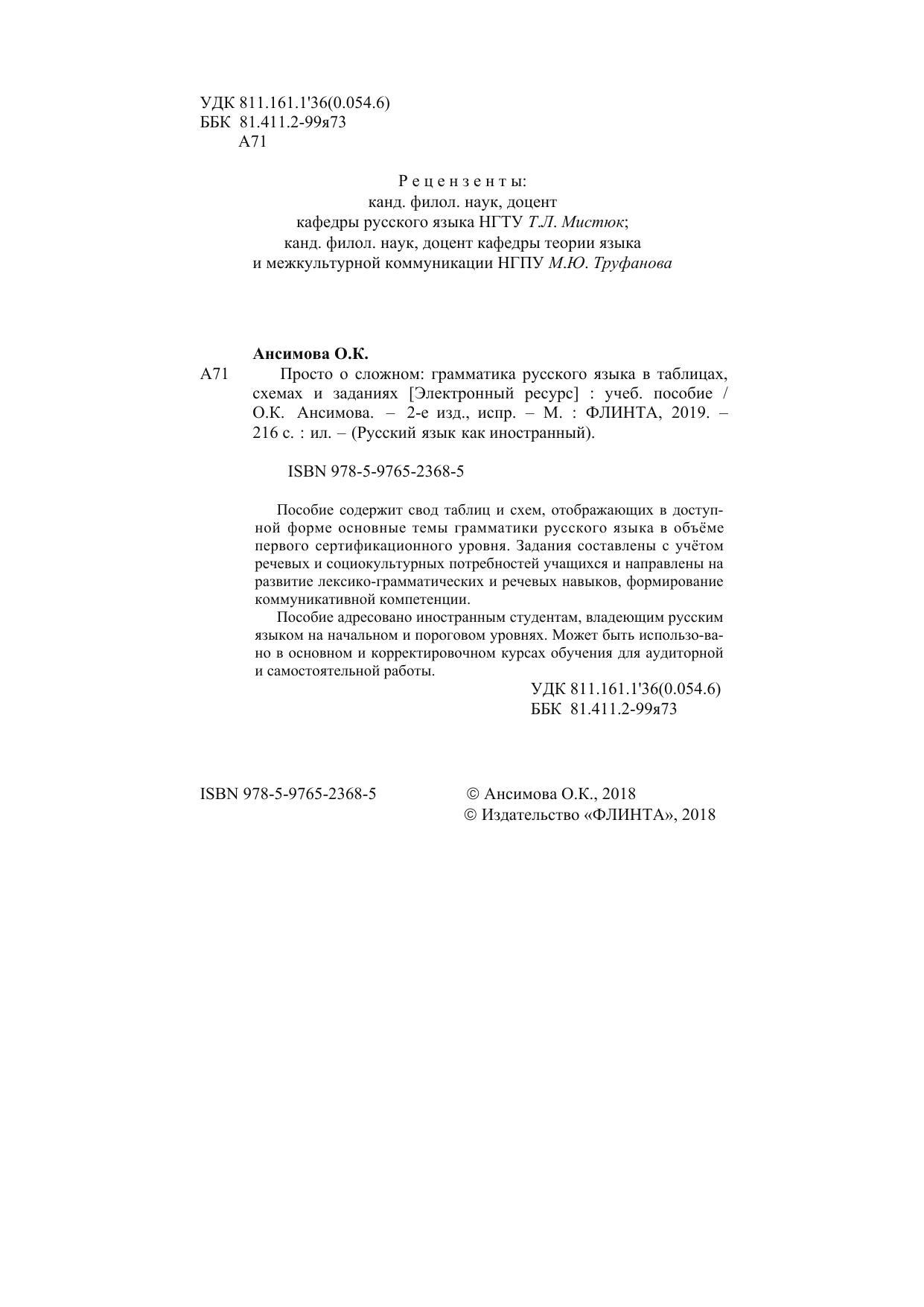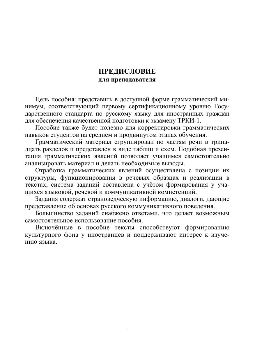Пособие содержит свод таблиц и схем, отображающих в доступной форме основные темы грамматики русского языка в объёме первого сертификационного уровня. Задания составлены с учётом речевых и социокультурных потребностей учащихся и направлены на развитие лексико-грамматических и речевых навыков, формирование