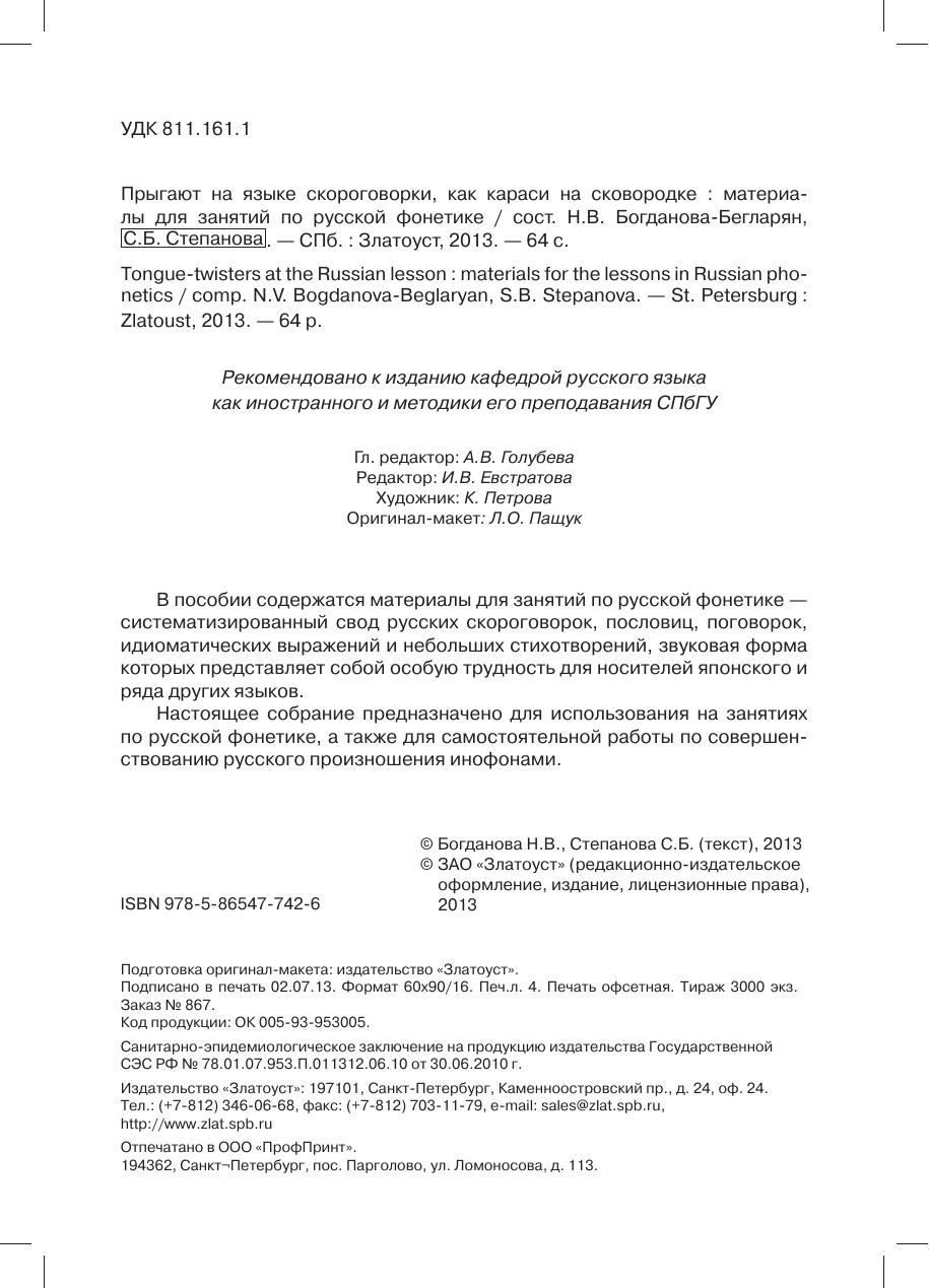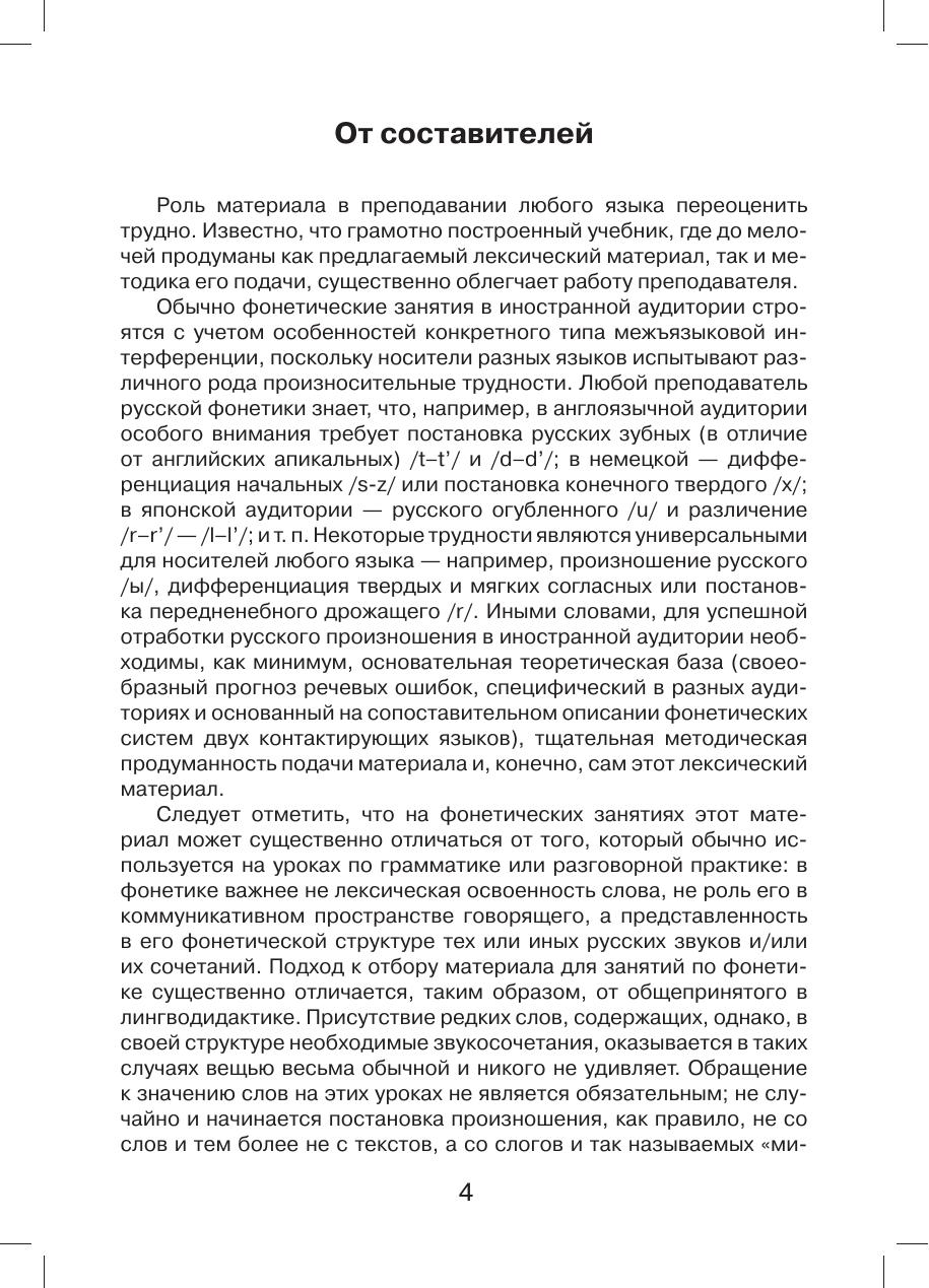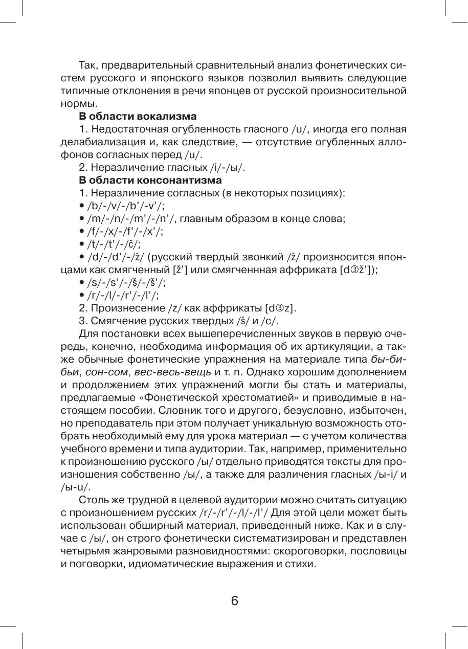 В пособии содержатся материалы для занятий по русской фонетике — систематизированный свод русских скороговорок, пословиц, поговорок, идиоматических выражений и небольших стихотворений, звуковая форма которых представляет собой особую трудность для носителей японского и ряда других языков. Настоящее собрание предназначено для использования на занятиях по русской фонетике, а также для самостоятельной работы по совершенствованию русского произношения инофонами.