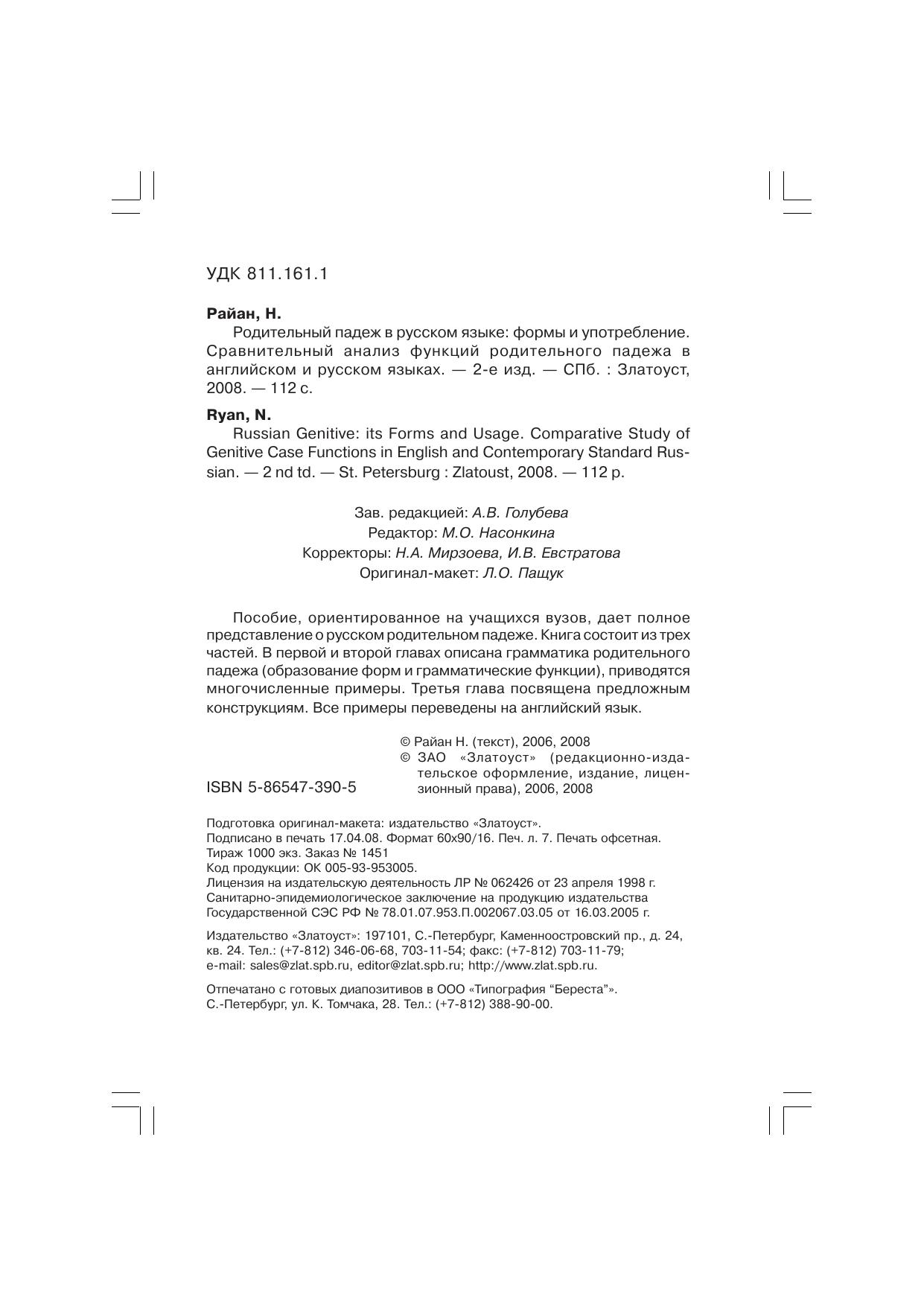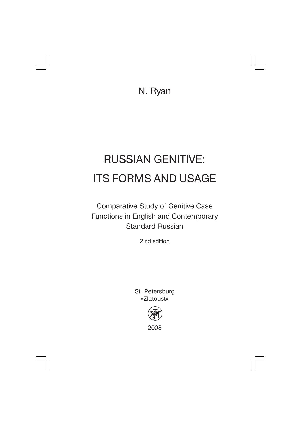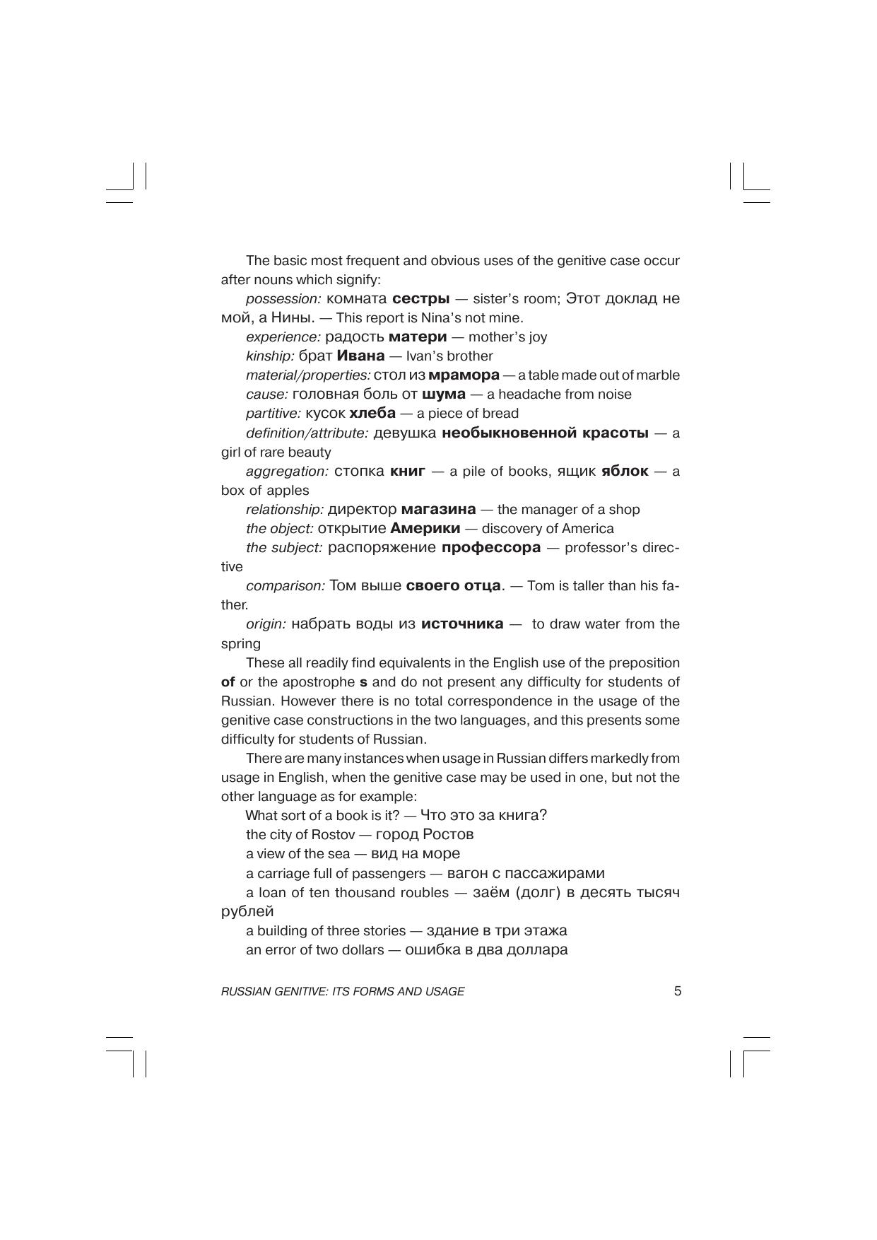 Пособие, ориентированное на учащихся вузов, дает полное представление о русском родительном падеже. Книга состоит из трех частей. В первой и второй главах описана грамматика родительного падежа (образование форм и грамматические функции), приводятся многочисленные примеры. Третья глава посвящена предложным конструкциям. Все примеры переведены на английский язык.
