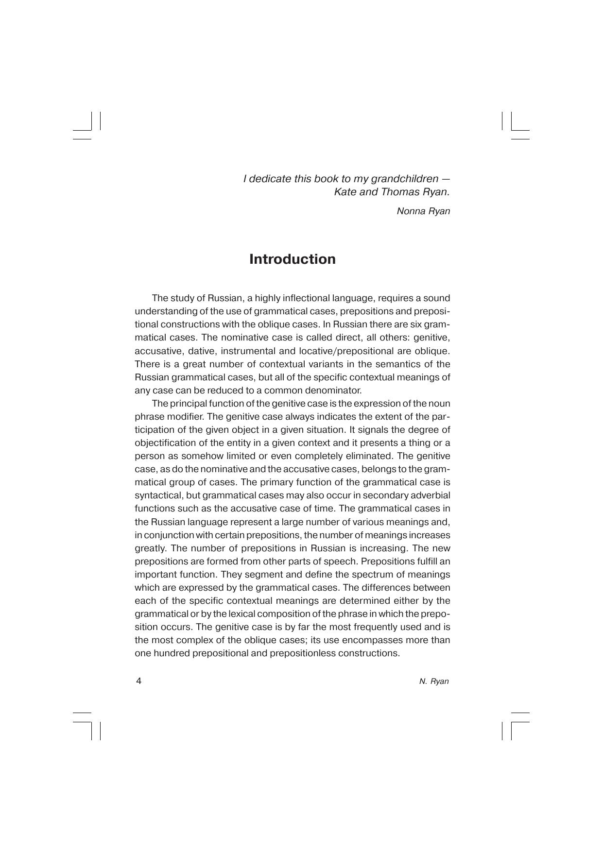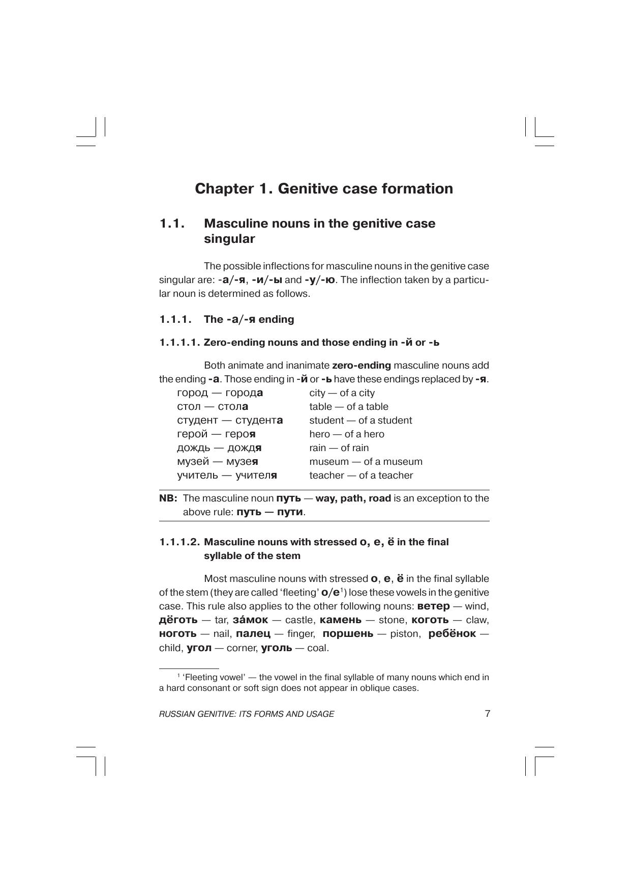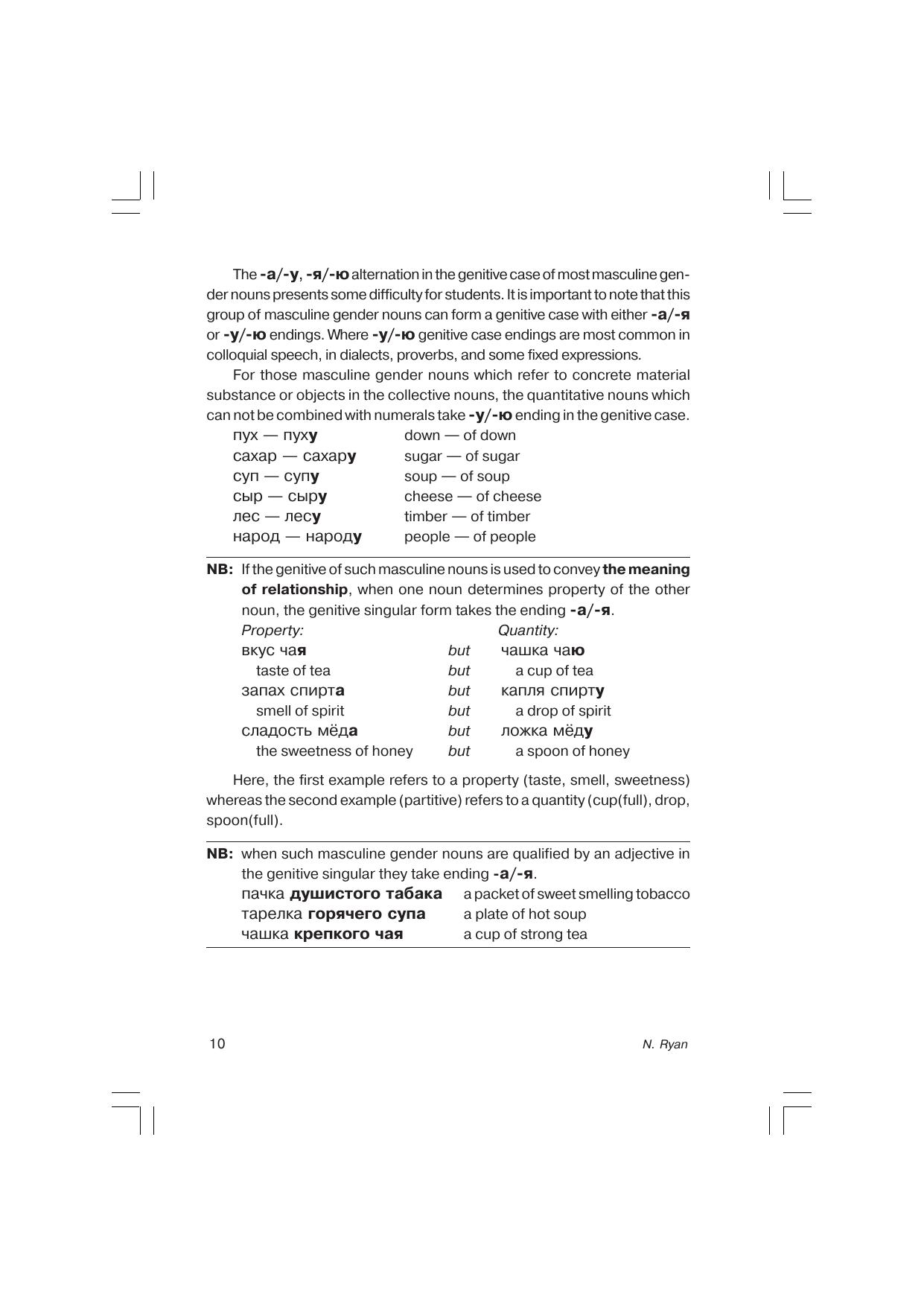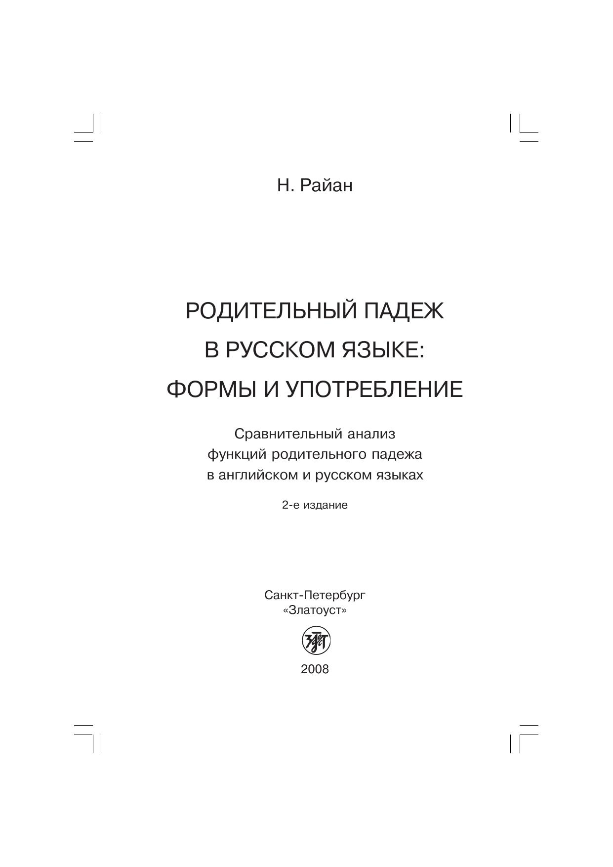 Пособие, ориентированное на учащихся вузов, дает полное представление о русском родительном падеже. Книга состоит из трех частей. В первой и второй главах описана грамматика родительного падежа (образование форм и грамматические функции), приводятся многочисленные примеры. Третья глава посвящена предложным конструкциям. Все примеры переведены на английский язык.