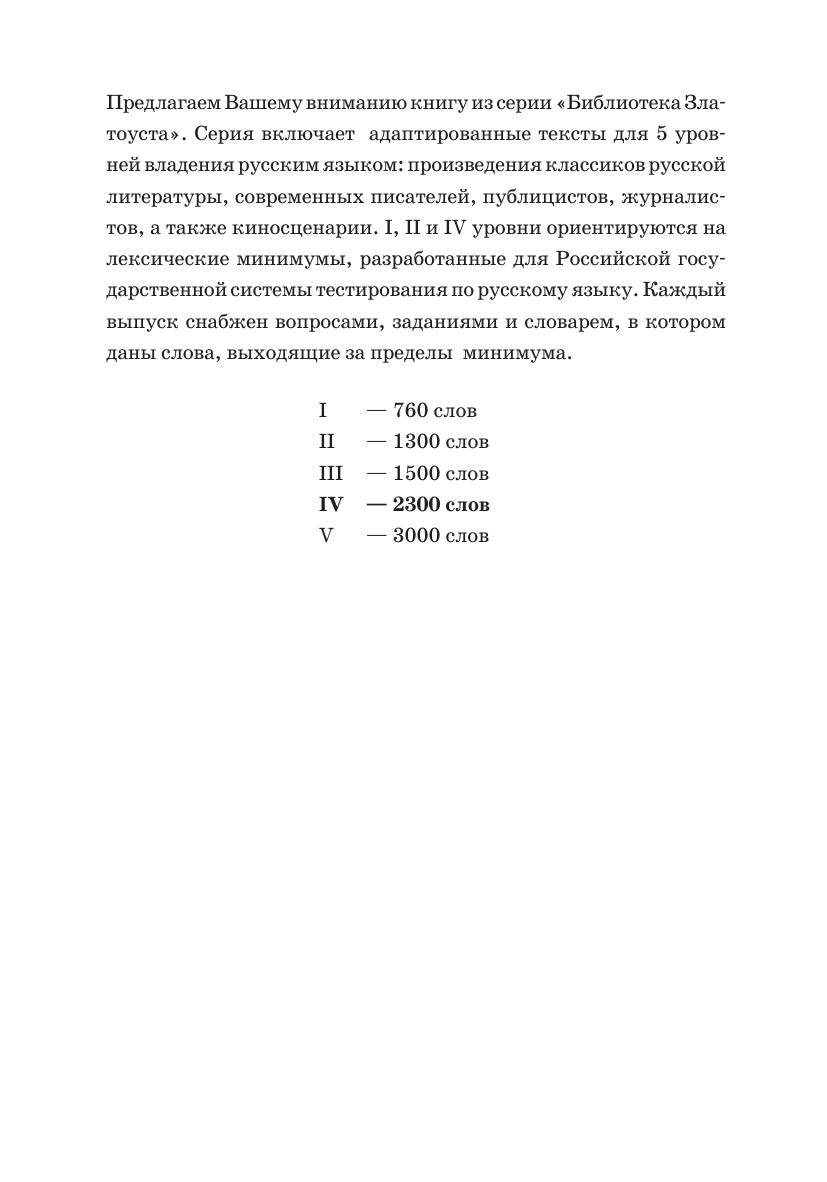 Предлагаем Вашему вниманию книгу из серии «Библиотека Златоуста». Серия включает адаптированные тексты для 5 уровней владения русским языком: произведения классиков русской литературы, современных писателей, публицистов, журналистов, а также киносценарии. I, II и IV уровни ориентируются на лексические минимумы, разработанные для Российской государственной системы тестирования по русскому языку. Каждый выпуск снабжен вопросами, заданиями и словарем, в котором даны слова, выходящие за пределы минимума.