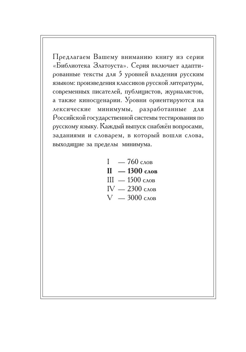 Предлагаем Вашему вниманию книгу из серии «Библиотека Златоуста». Серия включает адаптированные тексты для 5 уровней владения русским языком: произведения классиков русской литературы, современных писателей, публицистов, журналистов, а также киносценарии. Уровни ориентируются на лексические минимумы, разработанные для Российской государственной системы тестирования по русскому языку. Каждый выпуск снабжён вопросами, заданиями и словарем, в который вошли слова, выходящие за пределы минимума.