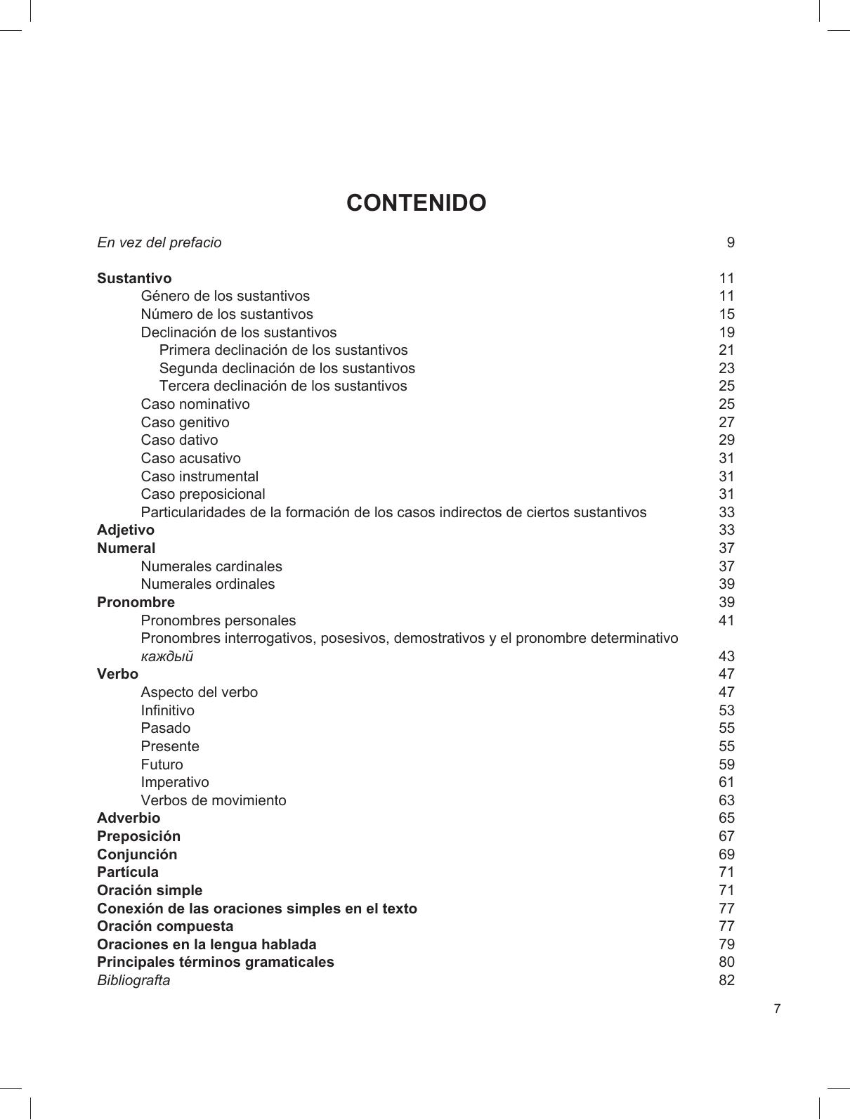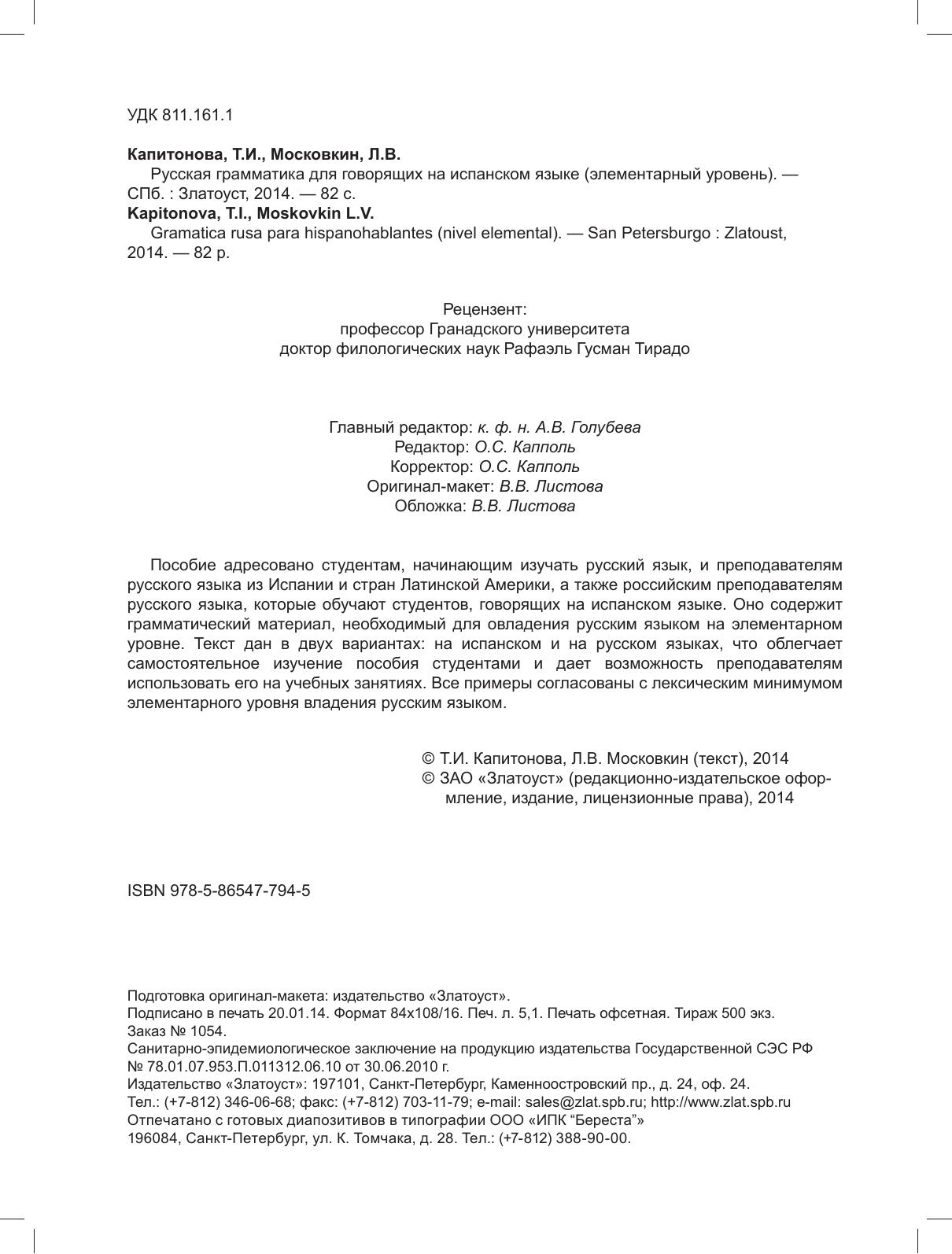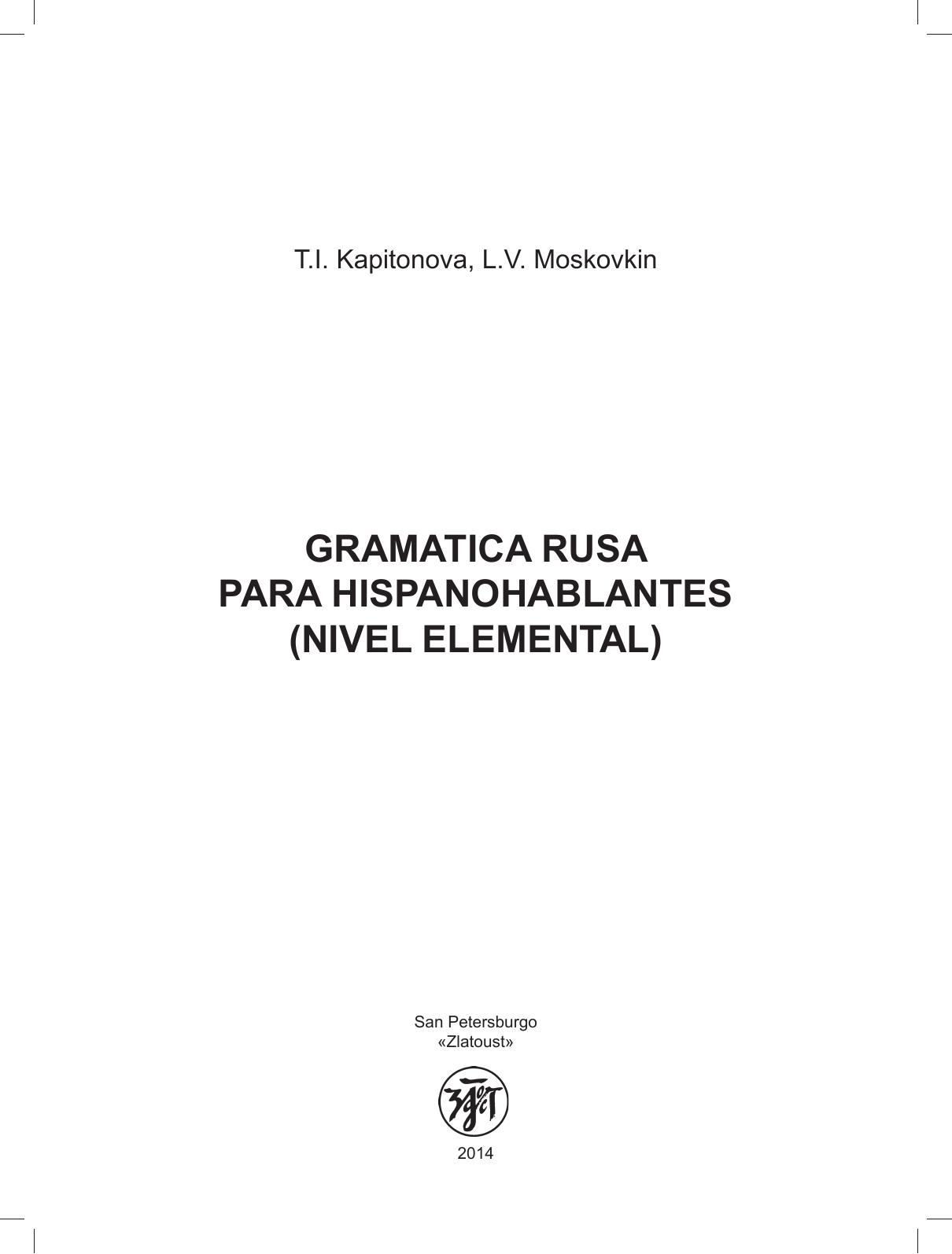 Пособие адресовано студентам, начинающим изучать русский язык, и преподавателям русского языка из Испании и стран Латинской Америки, а также российским преподавателям русского языка, которые обучают студентов, говорящих на испанском языке. Оно содержит грамматический материал, необходимый для овладения русским языком на элементарном уровне. Текст дан в двух вариантах: на испанском и на русском языках, что облегчает самостоятельное изучение пособия студентами и дает возможность преподавателям использовать его на учебных занятиях. Все примеры согласованы с лексическим минимумом элементарного уровня владения русским языком.