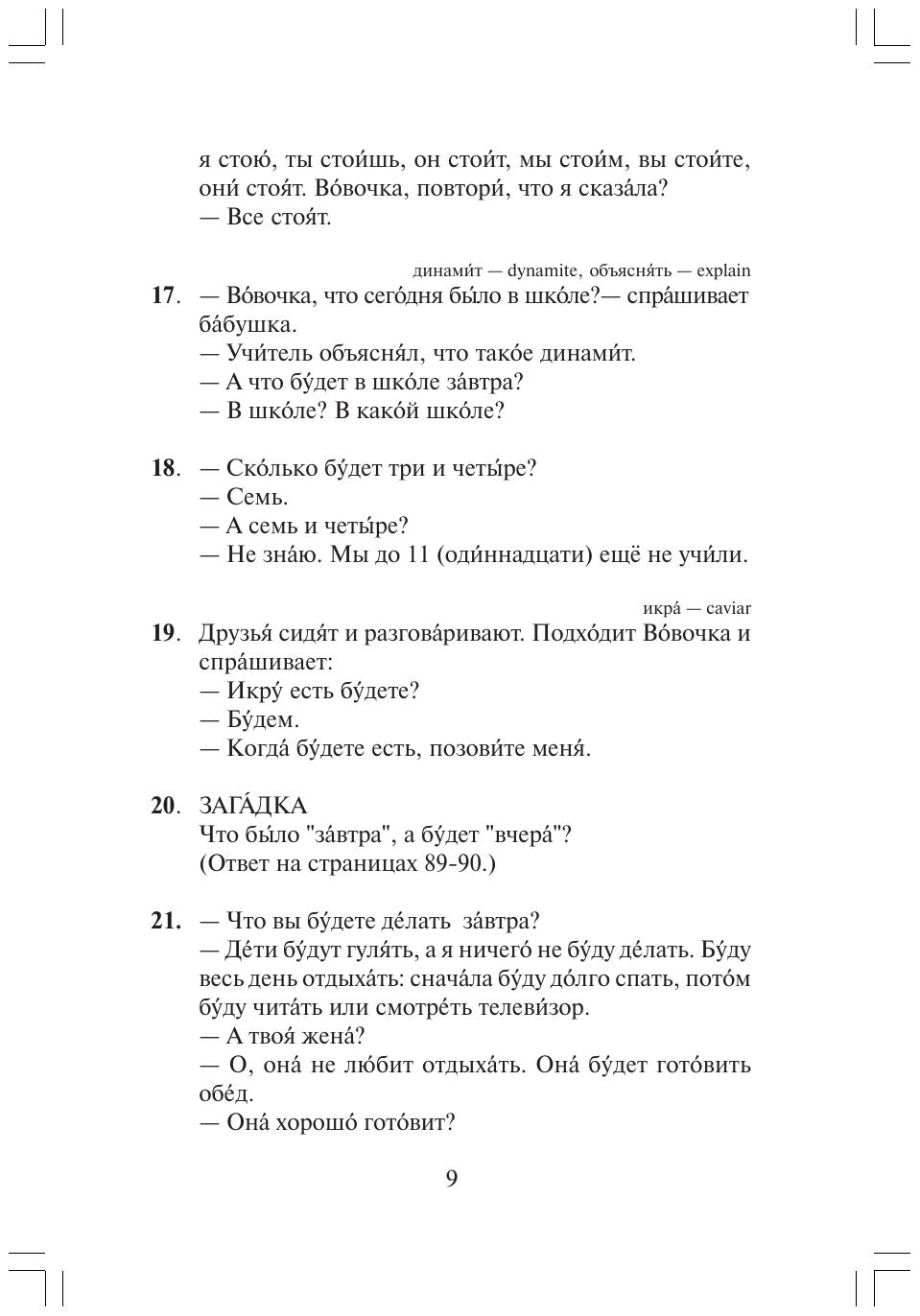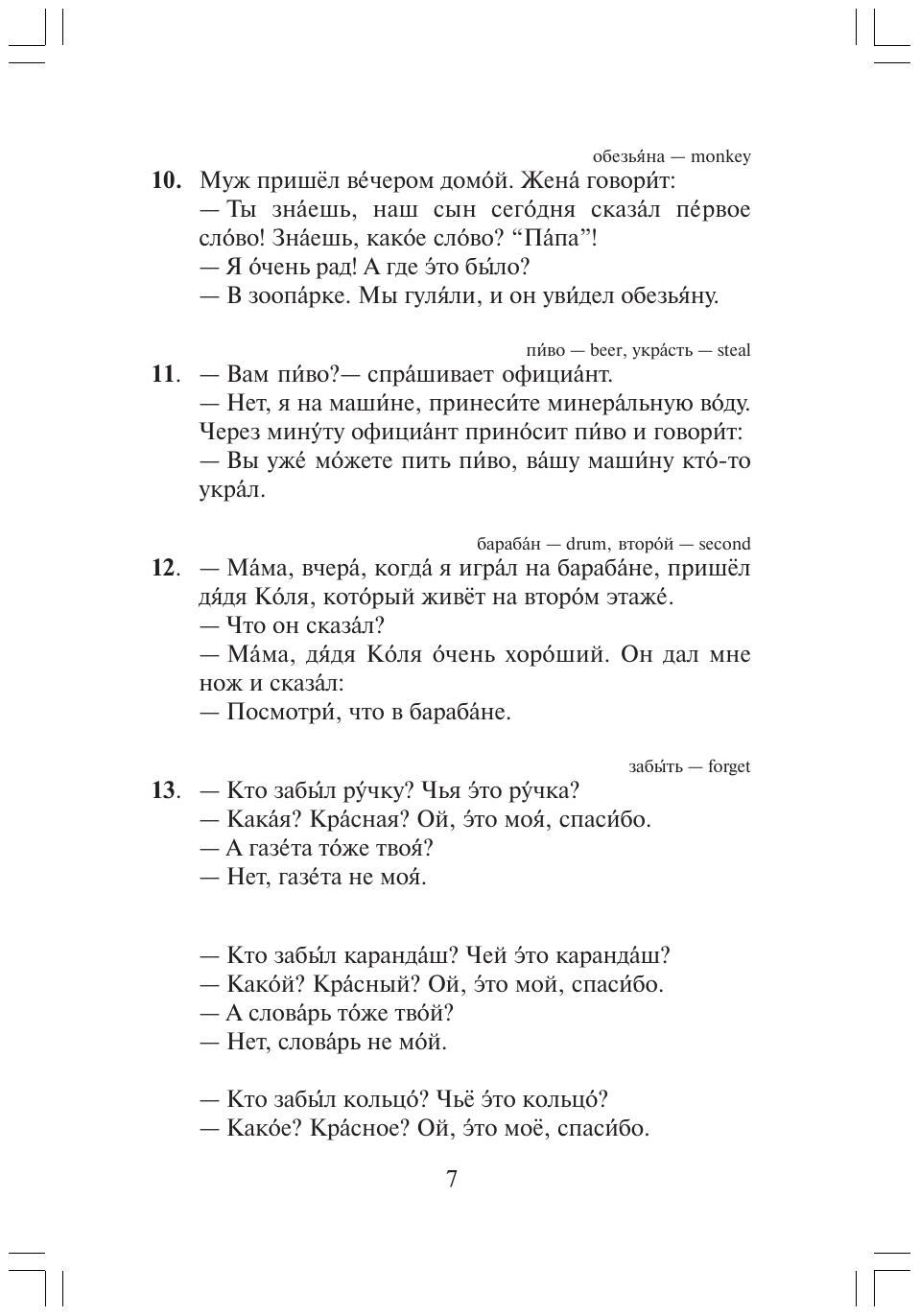 Предлагаемое пособие предназначено для иностранцев, начинающих изучать русский язык (первые 100 часов обучения). Содержит 284 микротекста (анекдоты, шутки, викторины и вопросы, загадки и задачи, диалоги), подобранные в соответствиис грамматическими темами и снабженные ударениями и притекстовым словарем. Расширяет словарный запас, тренирует падежные окончания, выводит речевые навыки на уровень автоматизма.