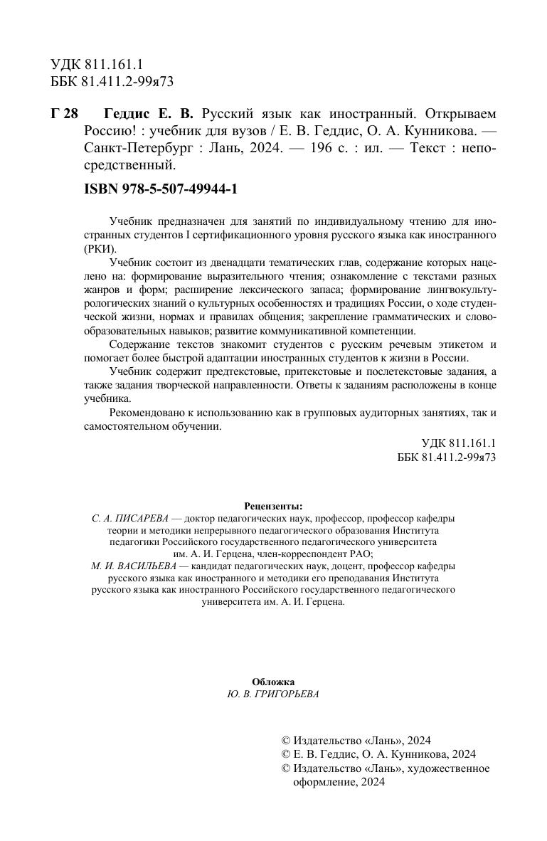 Учебник предназначен для занятий по индивидуальному чтению для иностранных студентов I сертификационного уровня русского языка как иностранного (РКИ). Учебник состоит из двенадцати тематических глав, содержание которых нацелено на: формирование выразительного чтения, ознакомление с текстами разных жанров и форм, расширение лексического запаса, формирование лингвокультурологических знаний о культурных особенностях и традициях России, о ходе студенческой жизни, нормах и правилах общения, закрепление грамматических и словообразовательных навыков, развитие коммуникативной компетенции. Содержание текстов знакомит студентов с русским речевым этикетом и помогает более быстрой адаптации иностранных студентов к жизни в России. Учебник содержит предтекстовые, притекстовые и послетекстовые задания, а также задания творческой направленности. Ответы к заданиям расположены в конце учебника. Рекомендовано к использованию как в групповых аудиторных занятиях, так и самостоятельном обучении.