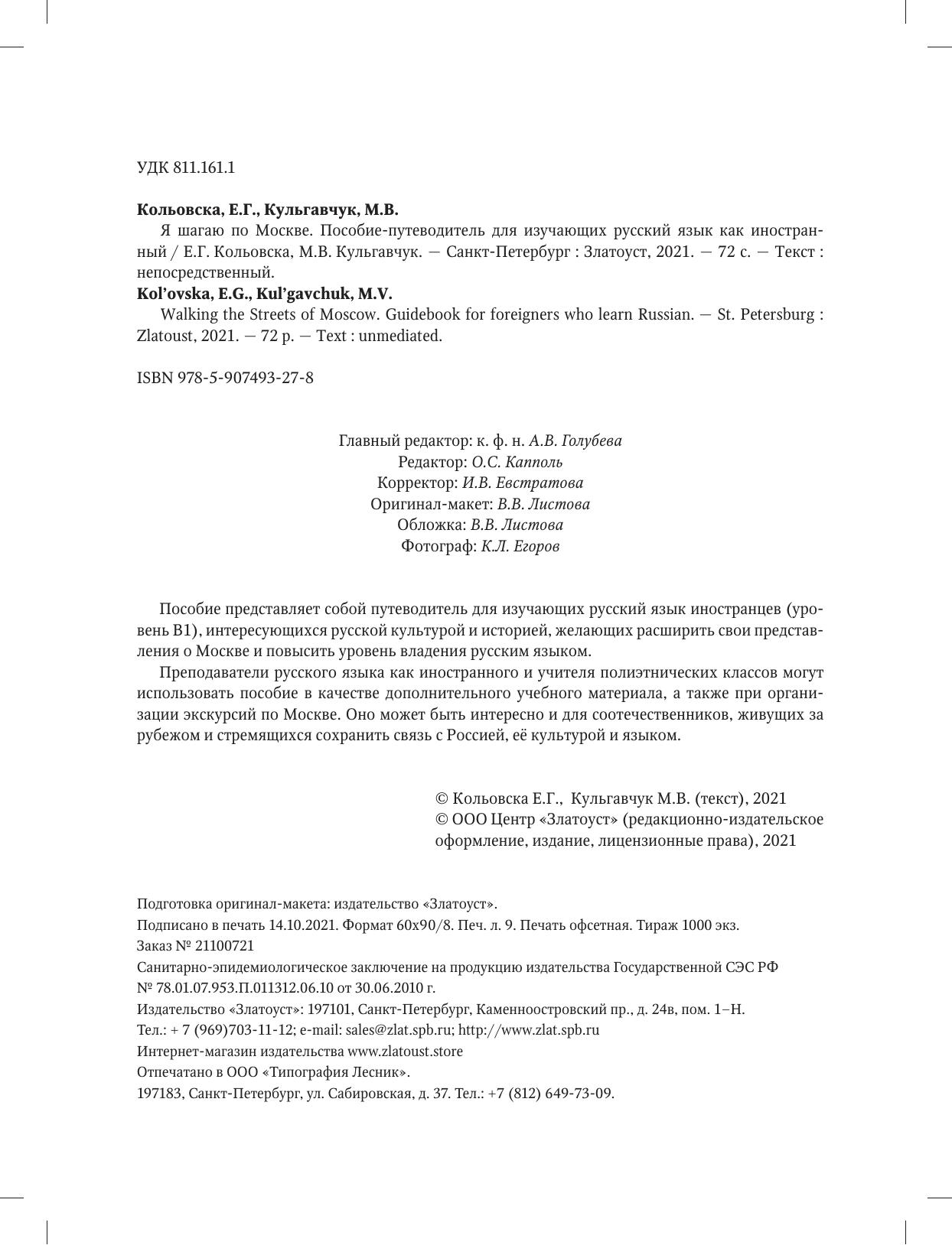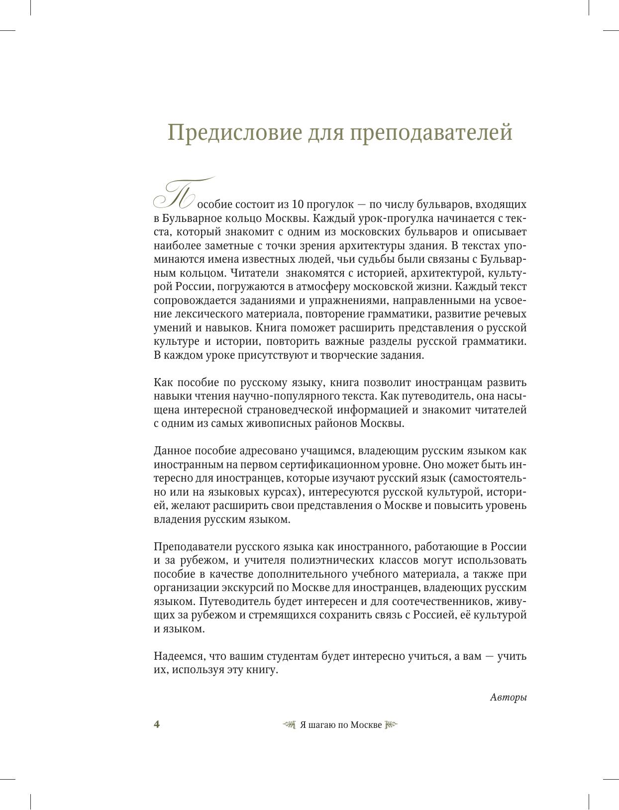 Пособие представляет собой путеводитель для изучающих русский язык иностранцев (уровень В1), интересующихся русской культурой и историей, желающих расширить свои представления о Москве и повысить уровень владения русским языком. Преподаватели русского языка как иностранного и учителя полиэтнических классов могут использовать пособие в качестве дополнительного учебного материала, а также при организации экскурсий по Москве. Оно может быть интересно и для соотечественников, живущих за рубежом и стремящихся сохранить связь с Россией, её культурой и языком.