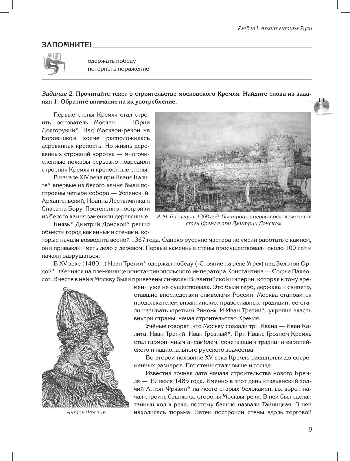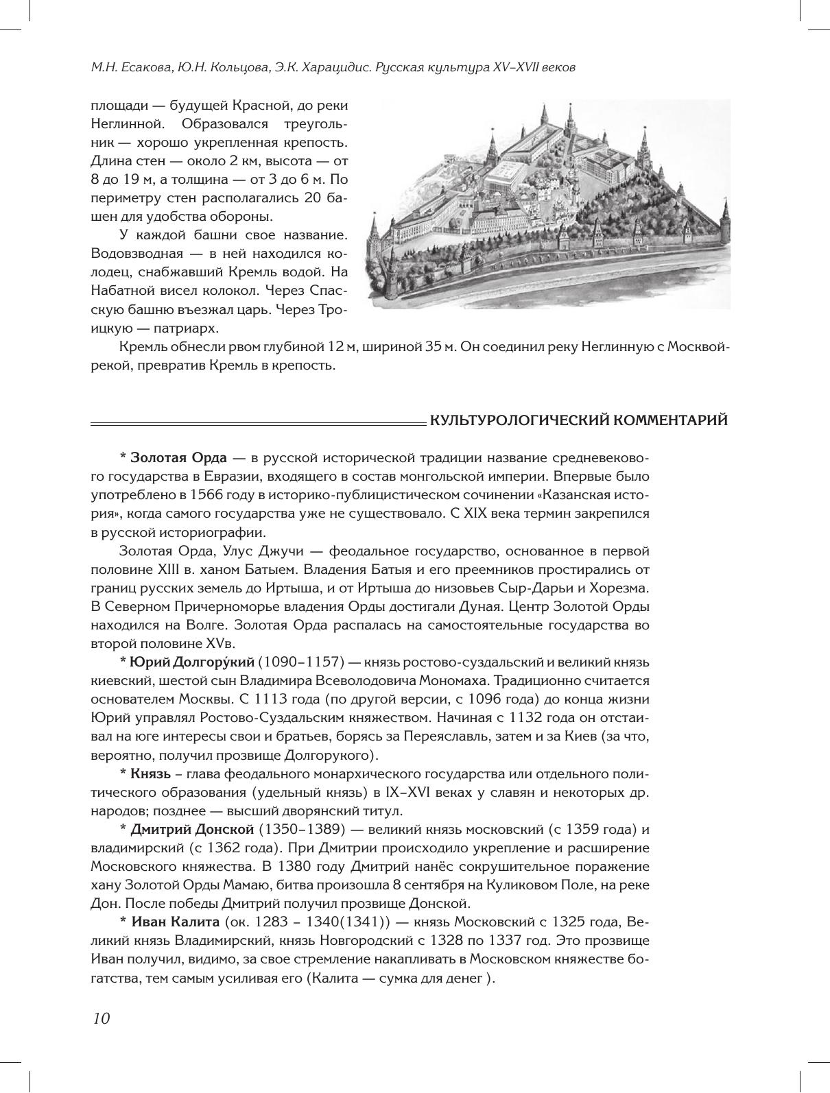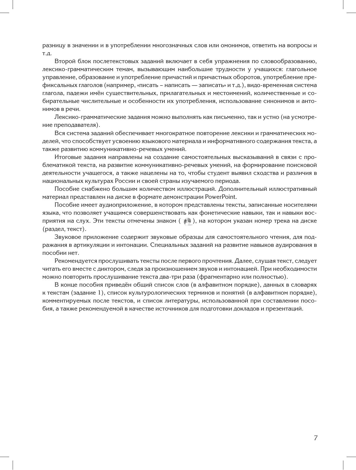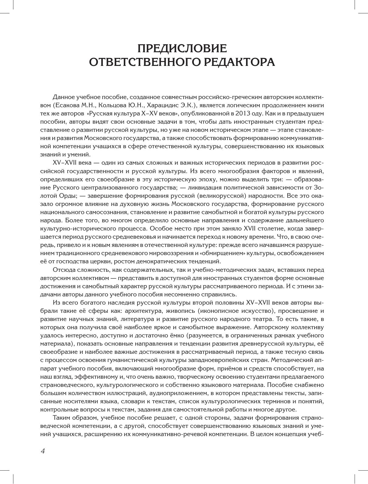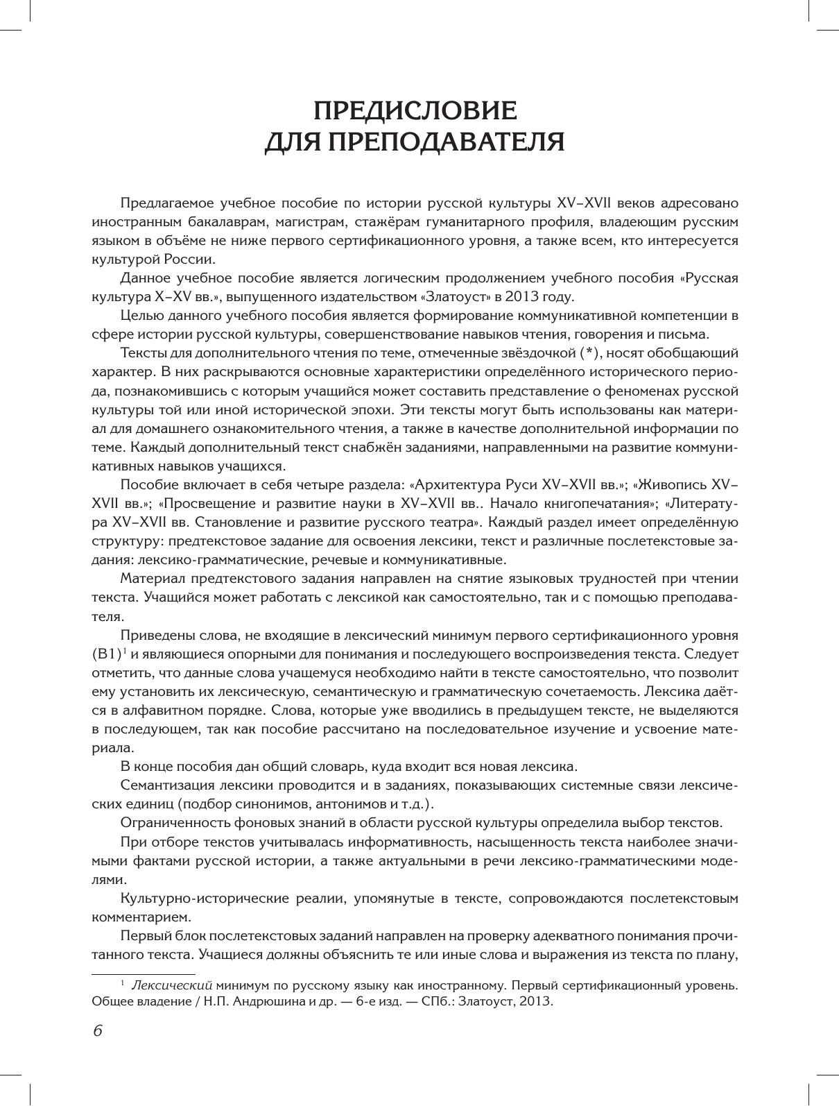 Данное учебное пособие представляет собой сборник текстов и упражнений по истории русской культуры, которое, с одной стороны, даёт представление о русской культуре второй половины XV – XVII веков, а с другой — формирует и совершенствует навыки чтения, говорения и письма. Каждый раздел состоит из учебных текстов, текстов для дополнительного чтения, различных упражнений. Учебное пособие снабжено большим количеством иллюстраций. Предлагаемое учебное пособие по истории русской культуры второй половины XV – XVII веков адресовано бакалаврам, магистрам, стажёрам гуманитарного профиля, владеющим русским языком в объёме не ниже первого сертификационного уровня (В1), а также всем, кто интересуется историей и культурой России.