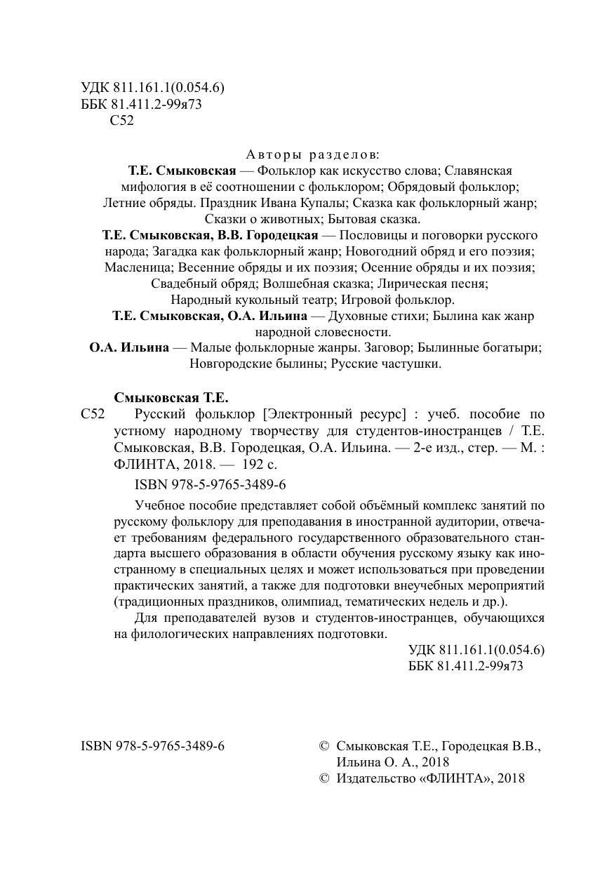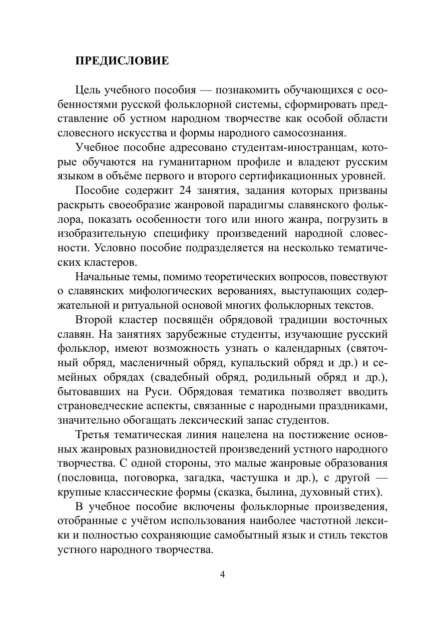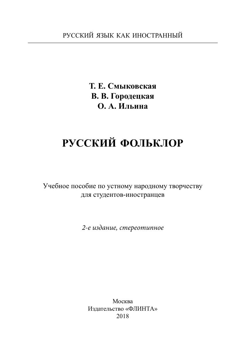 Учебное пособие представляет собой объёмный комплекс занятий по русскому фольклору для преподавания в иностранной аудитории, отвечает требованиям федерального государственного образовательного стандарта высшего образования в области обучения русскому языку как иностранному в специальных целях и может использоваться при проведении практических занятий, а также для подготовки внеучебных мероприятий (традиционных праздников, олимпиад, тематических недель и др.). Для преподавателей вузов и студентов-иностранцев, обучающихся на филологических направлениях подготовки.