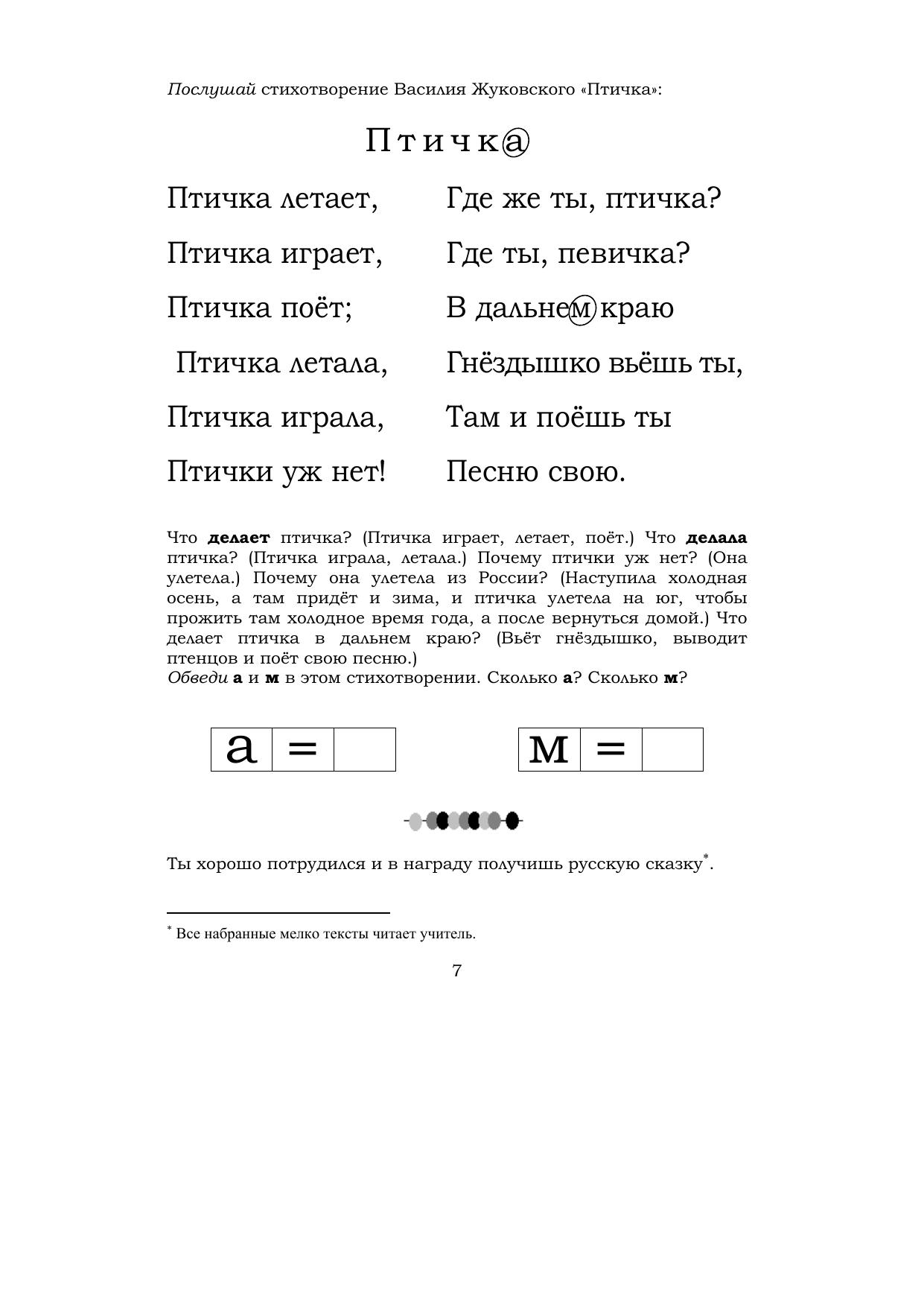 «Русский учебник» составлен для детей русскоязычного зарубежья, где бы они ни жили. Он устроен таким образом, чтобы ребенок учился читать и говорить по-русски. К этому его побуждают все страницы книги, каждое упражнение и каждый комментарий, который для него прочитает взрослый. Ребенок работает с «Русским учебником», «не покладая рук»: он берется за карандаш на первом уроке и оставляет его на последнем, для пользы дела изрисовав книжку. Фольклор илитература, начала грамматики, астрономия и география становятся предметами речи. Это букварь, учебник-хрестоматия и рабочая тетрадь в едином речеобразовательном замысле. Здесь 15 народных сказок, пословицы, потешки, скороговорки, стишки, хрестоматийные стихи для детей из старой русской литературы, стихотворения Лермонтова и Блока, басни Льва Толстого, две сказки Пушкина (и их подробный разбор).
