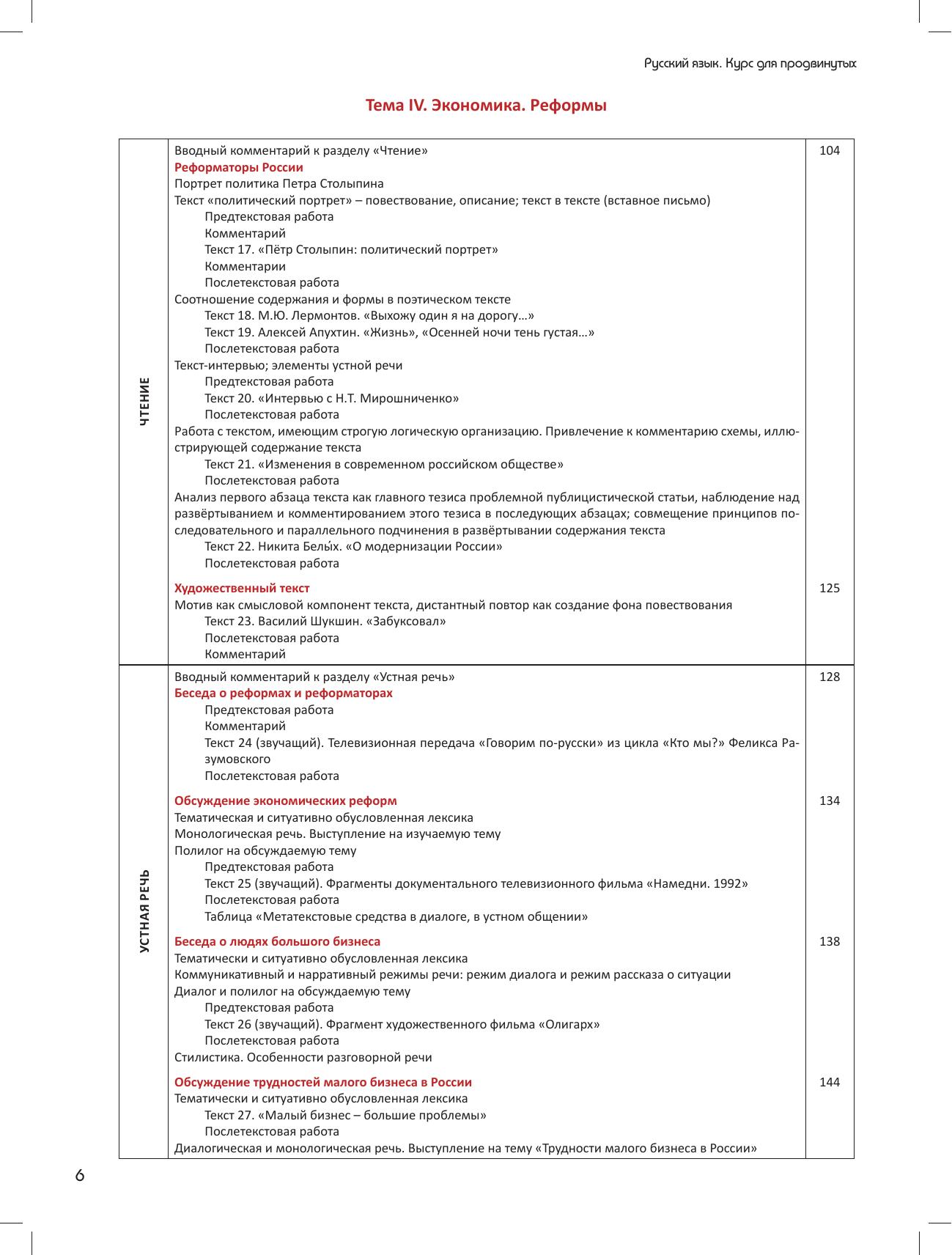 Курс в целом построен по тематическому принципу и включает 12 тем. Каждая тема разработана для всех видов речевой деятельности, что обеспечивает скоординированную подачу материала при аспектном обучении: единый подход при изучении типовых текстов, их структуры, лексико-грамматического наполнения, использовании этих текстов в качестве образцов при построении собственных высказываний в устной и письменной форме.