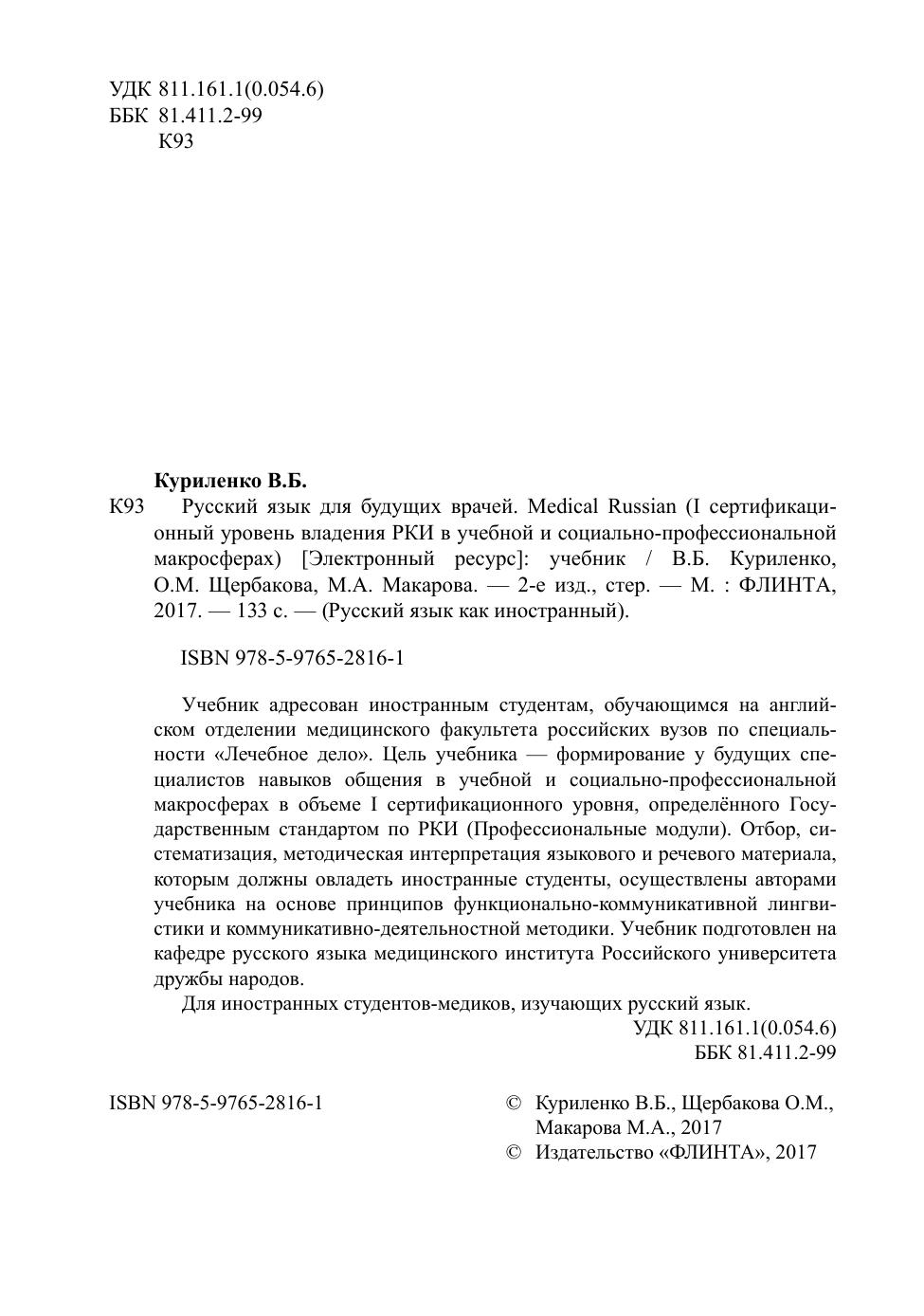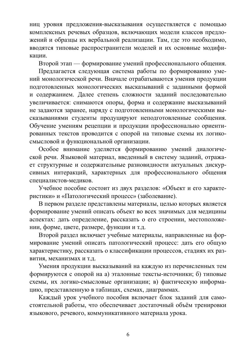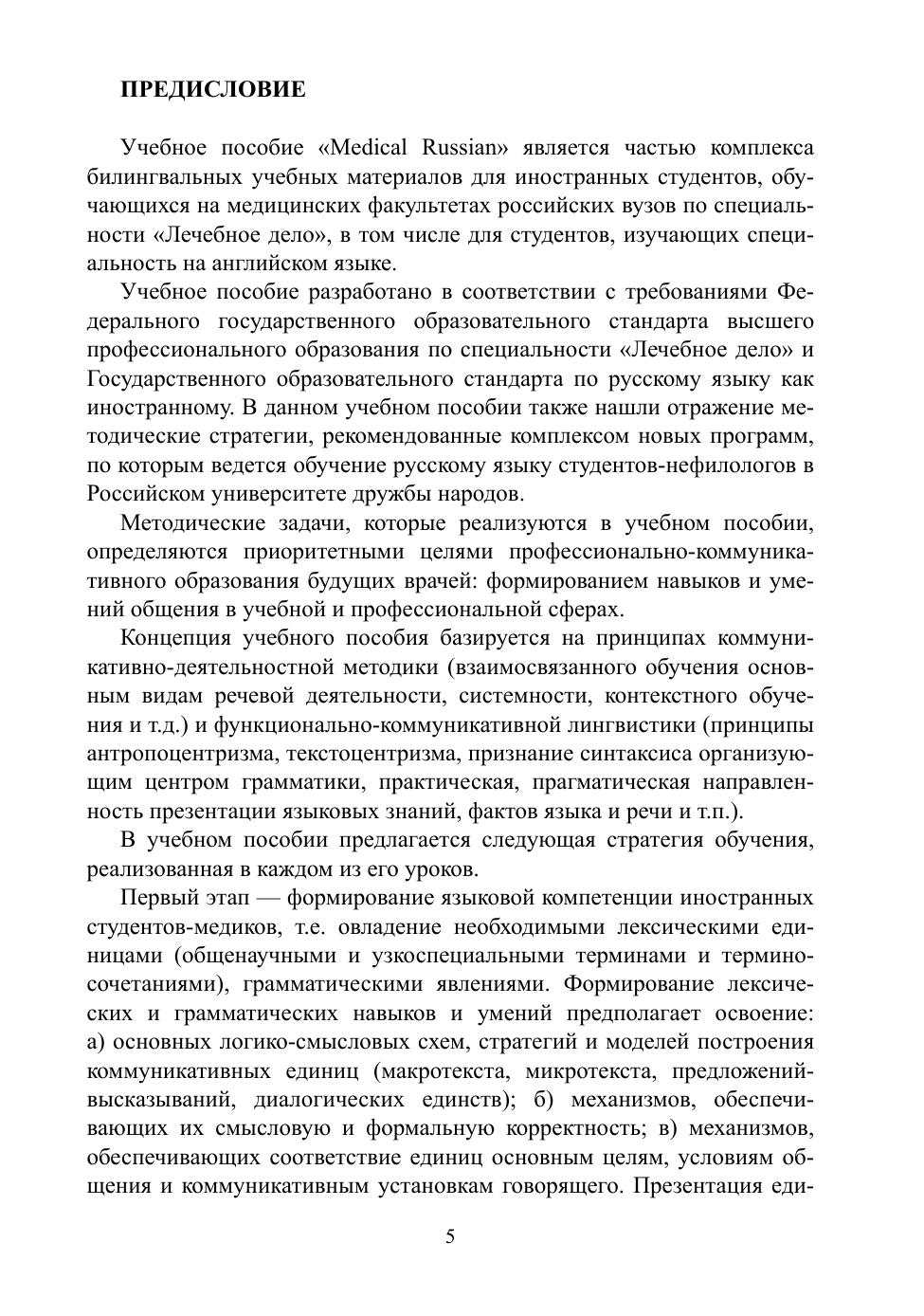 Учебник адресован иностранным студентам, обучающимся на английском отделении медицинского факультета российских вузов по специальности «Лечебное дело». Цель учебника — формирование у будущих специалистов навыков общения в учебной и социально-профессиональной макросферах в объеме I сертификационного уровня, определённого Государственным стандартом по РКИ (Профессиональные модули). Отбор, систематизация, методическая интерпретация языкового и речевого материала, которым должны овладеть иностранные студенты, осуществлены авторами учебника на основе принципов функционально-коммуникативной лингвистики и коммуникативно-деятельностной методики. Учебник подготовлен на кафедре русского языка медицинского института Российского университета дружбы народов.