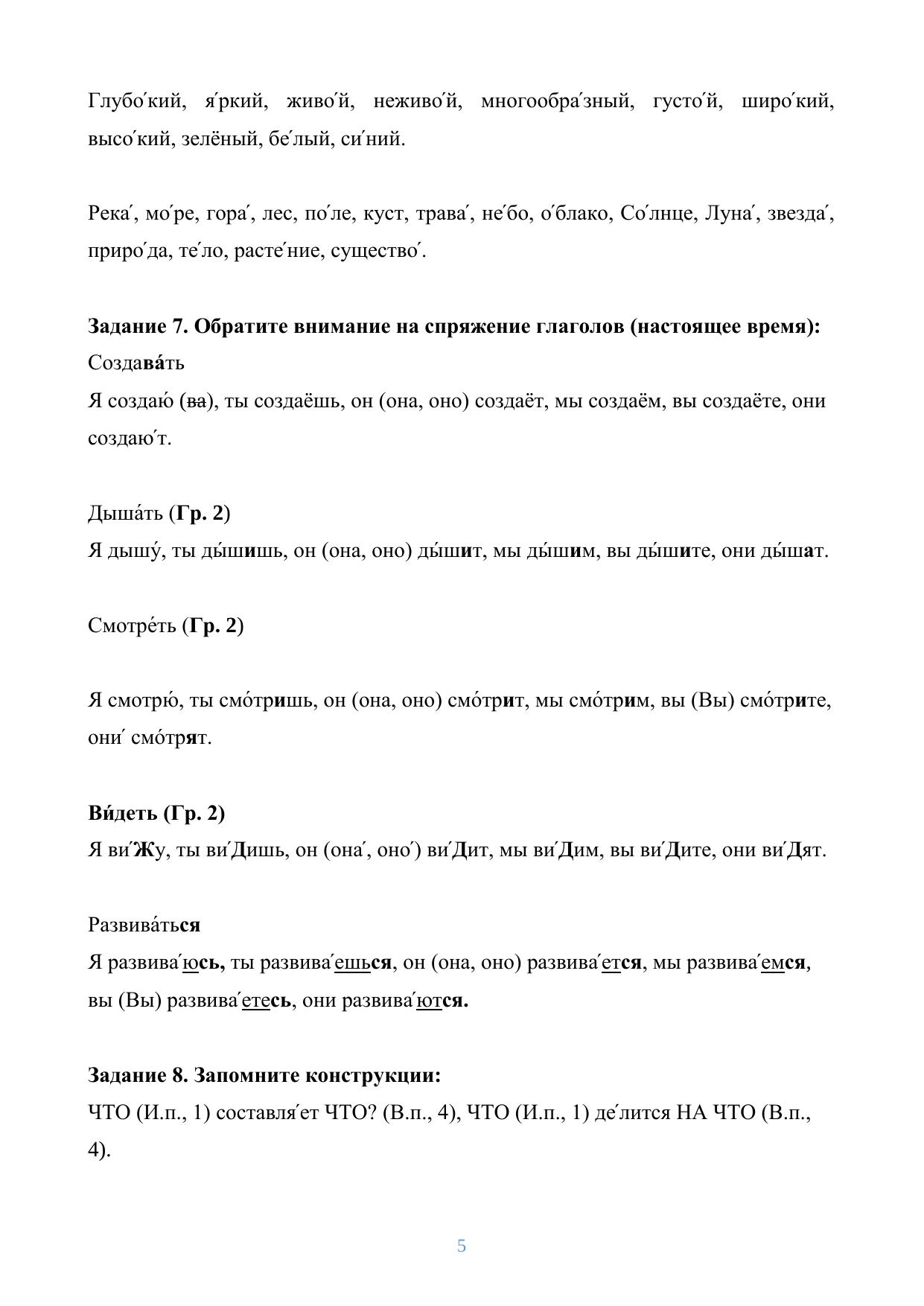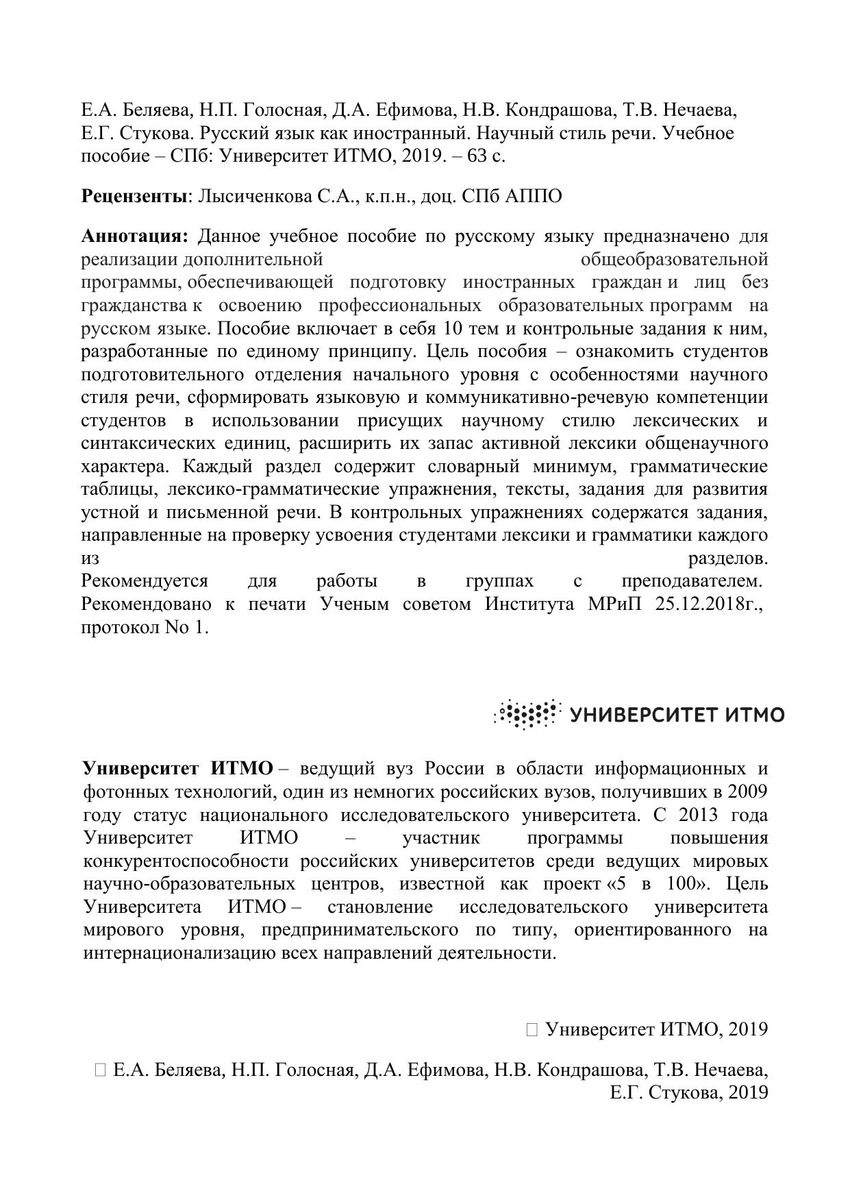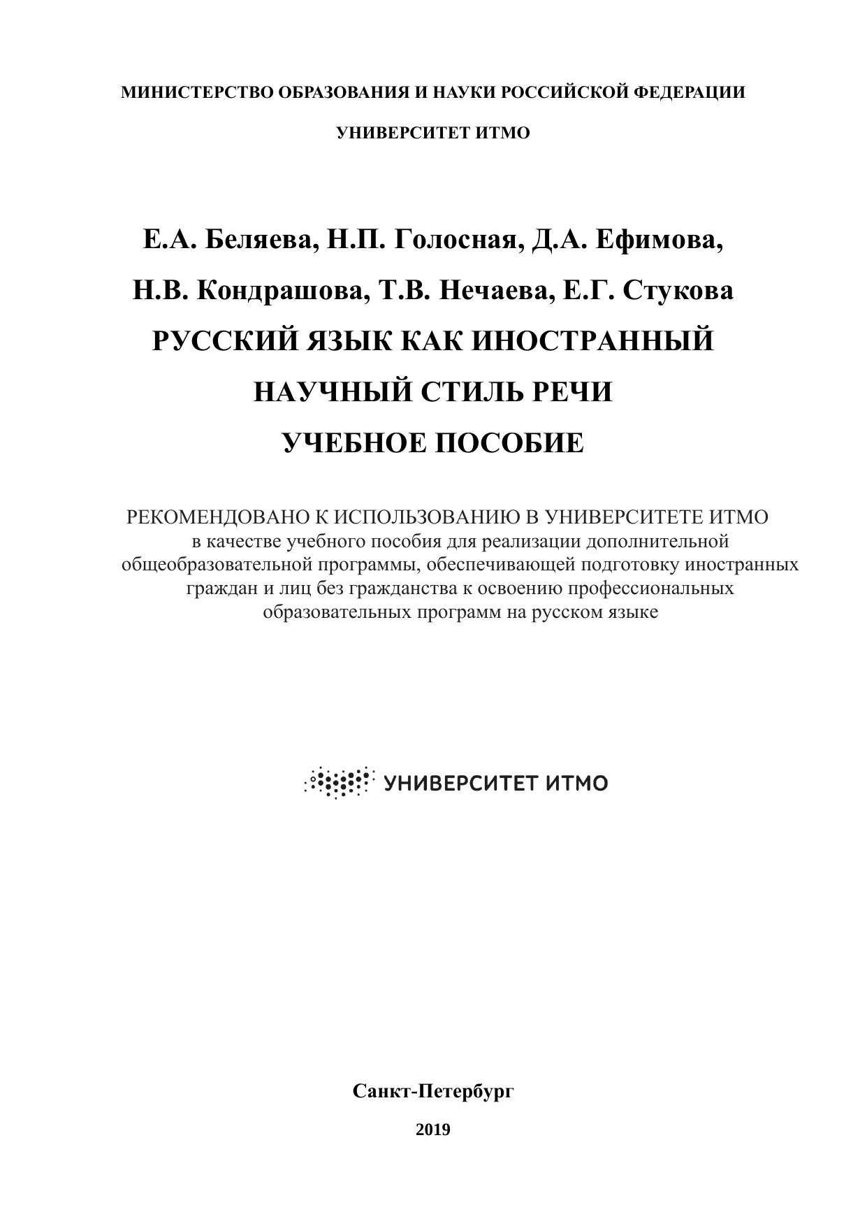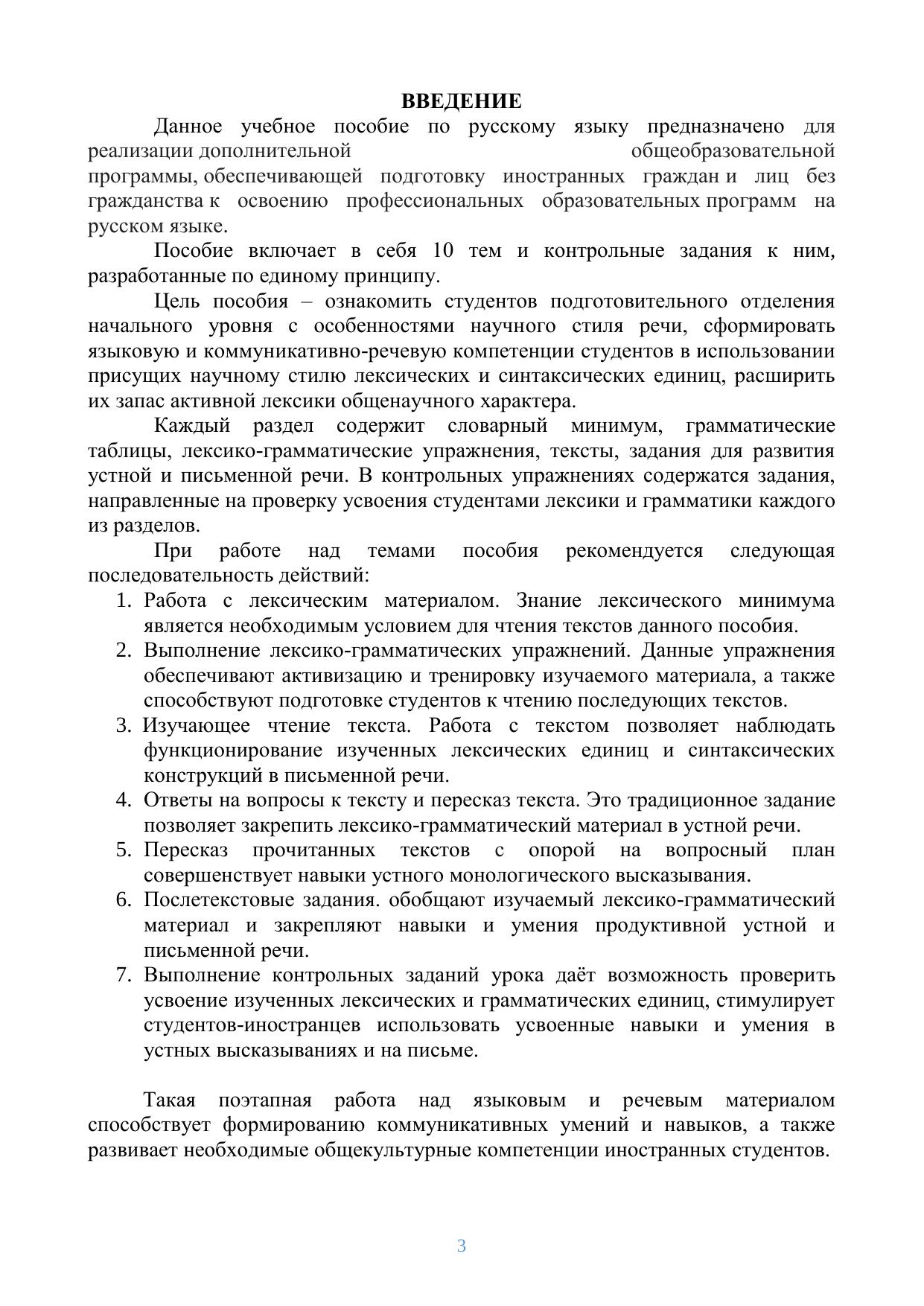 Данное учебное пособие по русскому языку предназначено для реализации дополнительной общеобразовательной программы, обеспечивающей подготовку иностранных граждан и лиц без гражданства к освоению профессиональных образовательных программ на русском языке. Пособие включает в себя 10 тем и контрольные задания к ним, разработанные по единому принципу. Цель пособия – ознакомить студентов подготовительного отделения начального уровня с особенностями научного стиля речи, сформировать языковую и коммуникативно-речевую компетенции студентов в использовании присущих научному стилю лексических и синтаксических единиц, расширить их запас активной лексики общенаучного характера. Каждый раздел содержит словарный минимум, грамматические таблицы, лексико-грамматические упражнения, тексты, задания для развития устной и письменной речи. В контрольных упражнениях содержатся задания, направленные на проверку усвоения студентами лексики и грамматики каждого из разделов. Рекомендуется для работы в группах с преподавателем.