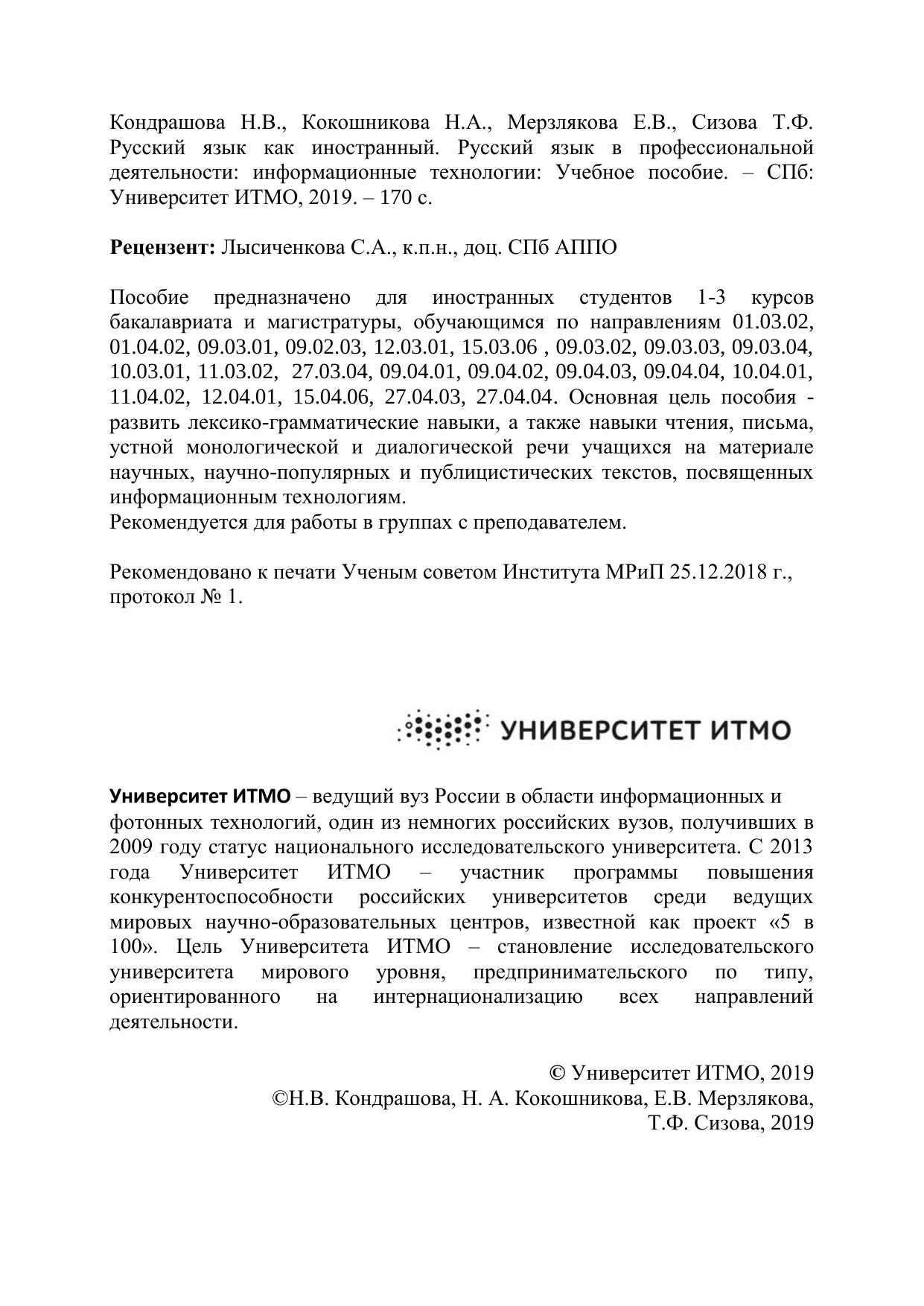 Пособие предназначено для иностранных студентов 1-3 курсов бакалавриата и магистратуры, обучающимся по направлениям 01.03.02, 01.04.02, 09.03.01, 09.02.03, 12.03.01, 15.03.06 , 09.03.02, 09.03.03, 09.03.04, 10.03.01, 11.03.02, 27.03.04, 09.04.01, 09.04.02, 09.04.03, 09.04.04, 10.04.01, 11.04.02, 12.04.01, 15.04.06, 27.04.03, 27.04.04. Основная цель пособия - развить лексико-грамматические навыки, а также навыки чтения, письма, устной монологической и диалогической речи учащихся на материале научных, научно-популярных и публицистических текстов, посвященных информационным технологиям.