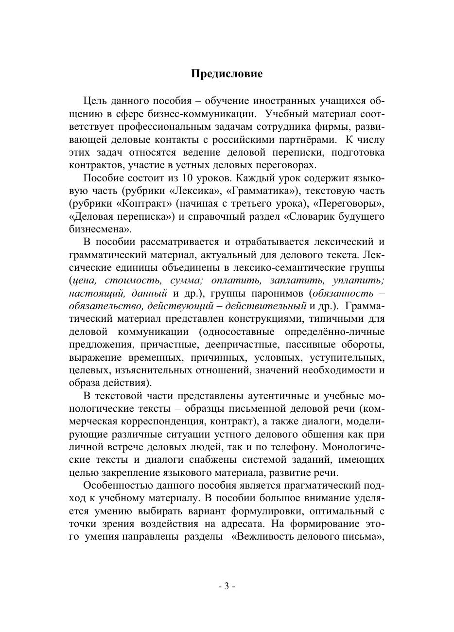 Цель пособия — обучение иностранных учащихся общению в сфере бизнес-коммуникации. Учебный материал соответствует профессиональным задачам сотрудника фирмы, развивающей деловые контакты с российскими партнёрами (ведение деловой переписки, подготовка контактов, языковое посредничество в устных деловых переговорах). Особенностью данного пособия является прагматический подход к учебному материалу. В пособии большое внимание уделяется умению выбирать вариант формулировки, оптимальный с точки зрения воздействия на адресата. На формирование этого умения направлены разделы "Вежливость делового письма", "Убедительность делового письма", "Варианты писем в зависимости от устанавливаемой дистанции общения", а также задания, отрабатывающие употребление формул речевого этикета, задания-инсценировки деловых переговоров. Прагматический подход характерен в ряде случаев и для подачи грамматики.