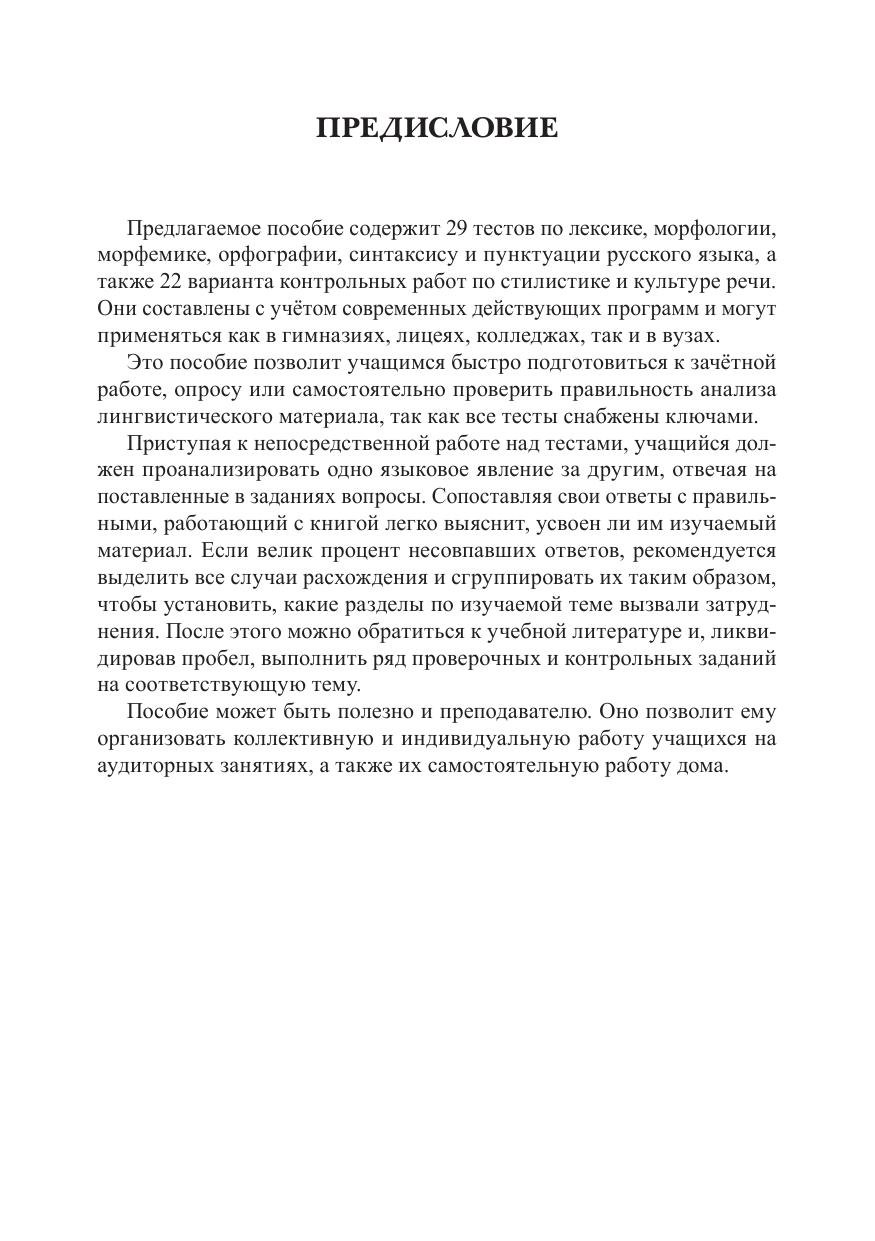 Пособие содержит 29 тестов по русскому языку, 22 варианта контрольных работ по культуре речи. Оно может быть использовано для проверки уровня сформированности умений и навыков учащихся, а