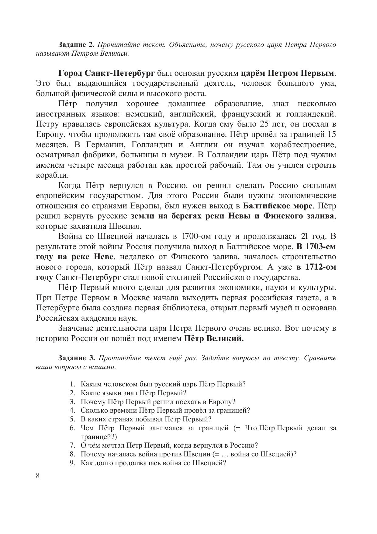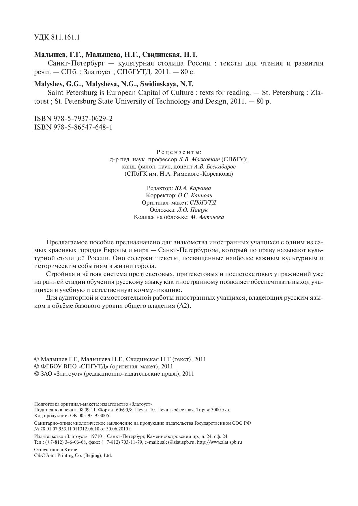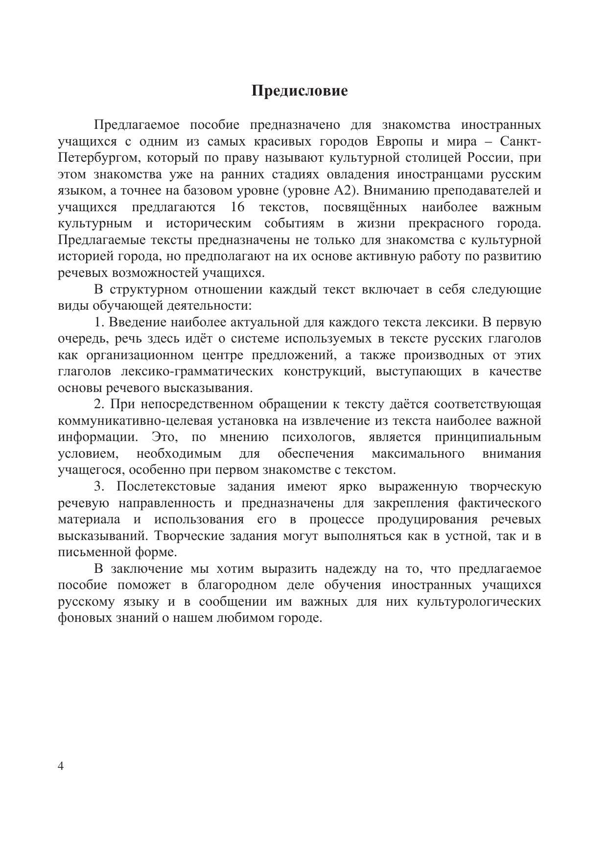 Предлагаемое пособие предназначено для знакомства иностранных учащихся с одним из самых красивых городов Европы и мира — Санкт-Петербургом, который по праву называют культурной столицей России. Оно содержит тексты, посвящённые наиболее важным культурным и историческим событиям в жизни города. Стройная и чёткая система предтекстовых, притекстовых и послетекстовых упражнений уже на ранней стадии обучения русскому языку как иностранному позволяет обеспечивать выход учащихся в учебную и естественную коммуникацию. Для аудиторной и самостоятельной работы иностранных учащихся, владеющих русским языком в объёме базового уровня общего владения (А2).