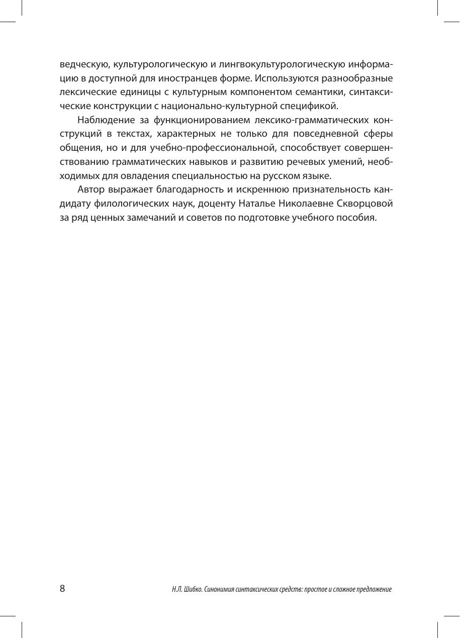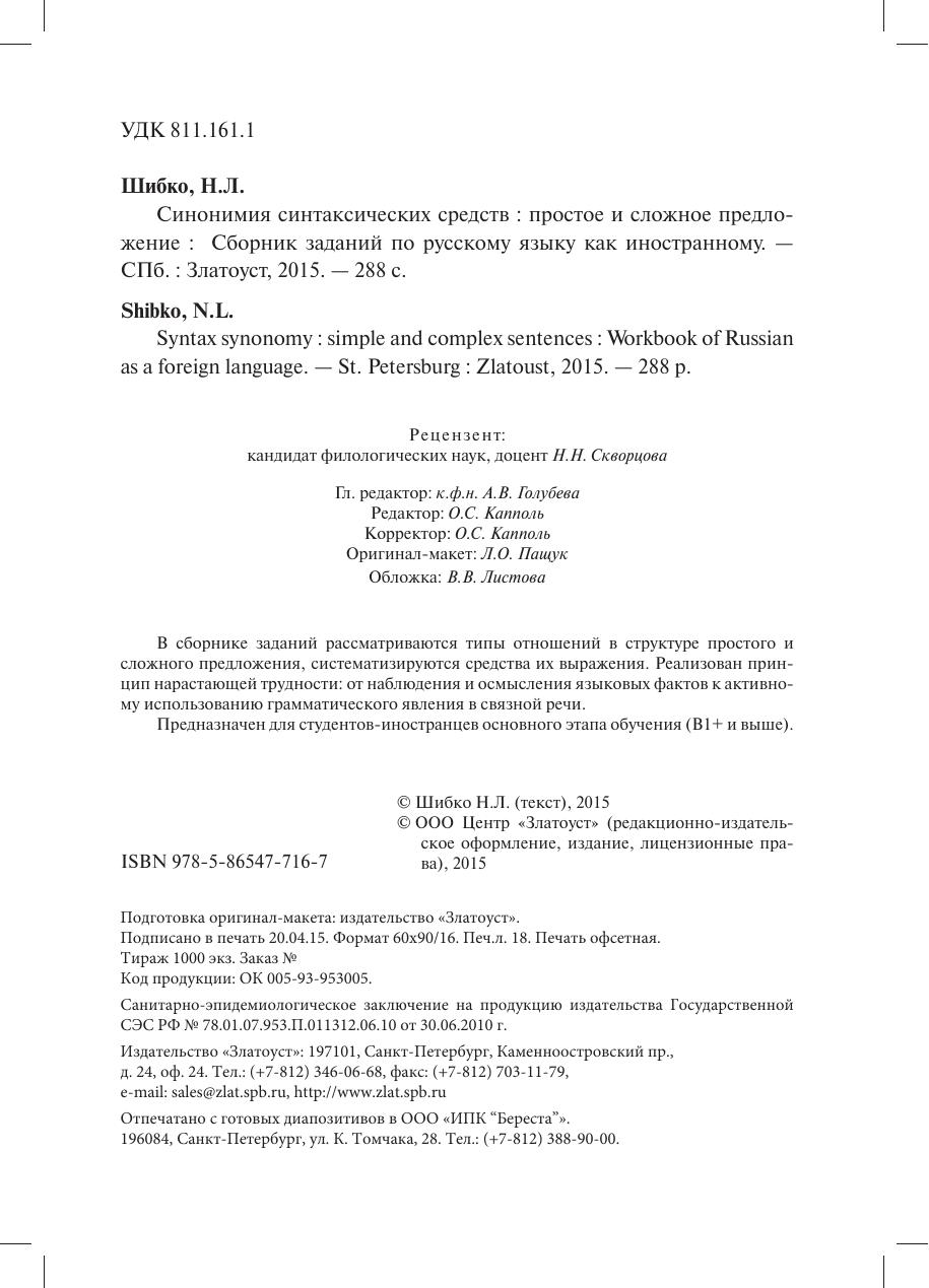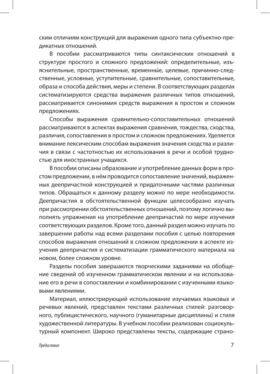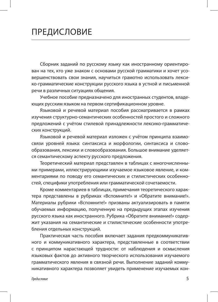 В сборнике заданий рассматриваются типы отношений в структуре простого и сложного предложения, систематизируются средства их выражения. Реализован принцип нарастающей трудности: от наблюдения и осмысления языковых фактов к активному использованию грамматического явления в связной речи. Предназначен для студентов-иностранцев основного этапа обучения (В1+ и выше).