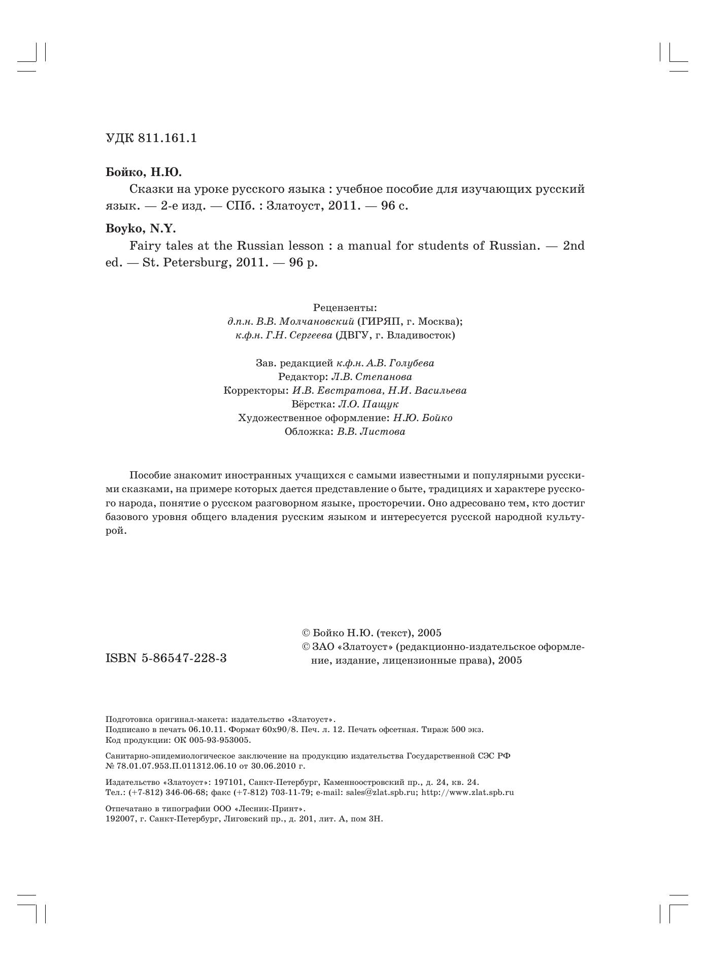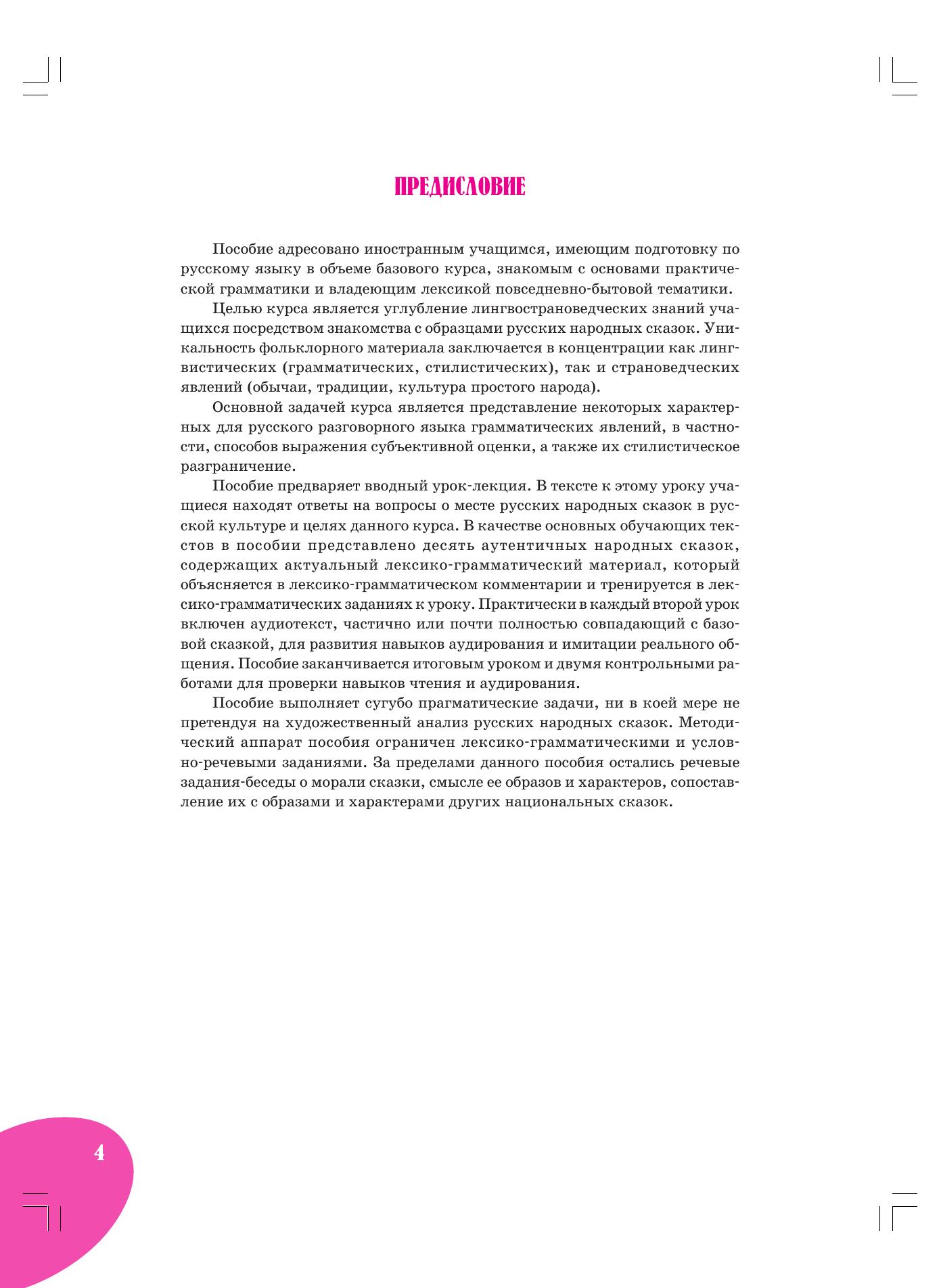 Пособие знакомит иностранных учащихся с самыми известными и популярными русскими сказками, на примере которых дается представление о быте, традициях и характере русского народа, понятие о русском разговорном языке, просторечии. Оно адресовано тем, кто достиг базового уровня общего владения русским языком и интересуется русской народной культурой.