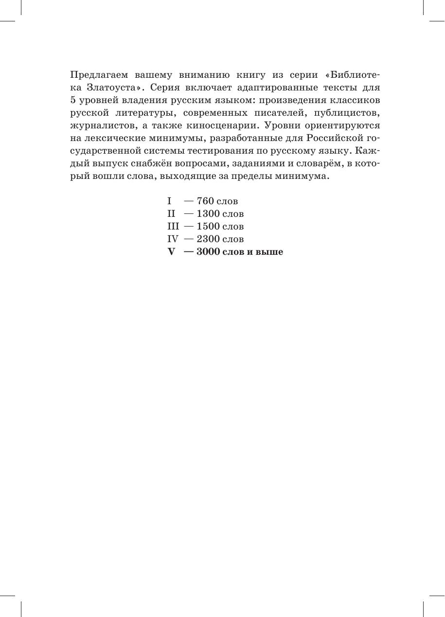 Предлагаем вашему вниманию книгу из серии «Библиотека Златоуста». Серия включает адаптированные тексты для 5 уровней владения русским языком: произведения классиков русской литературы, современных писателей, публицистов,журналистов, а также киносценарии. Уровни ориентируются на лексические минимумы, разработанные для Российской государственной системы тестирования по русскому языку. Каждый выпуск снабжён вопросами, заданиями и словарём, в который вошли слова, выходящие за пределы минимума.