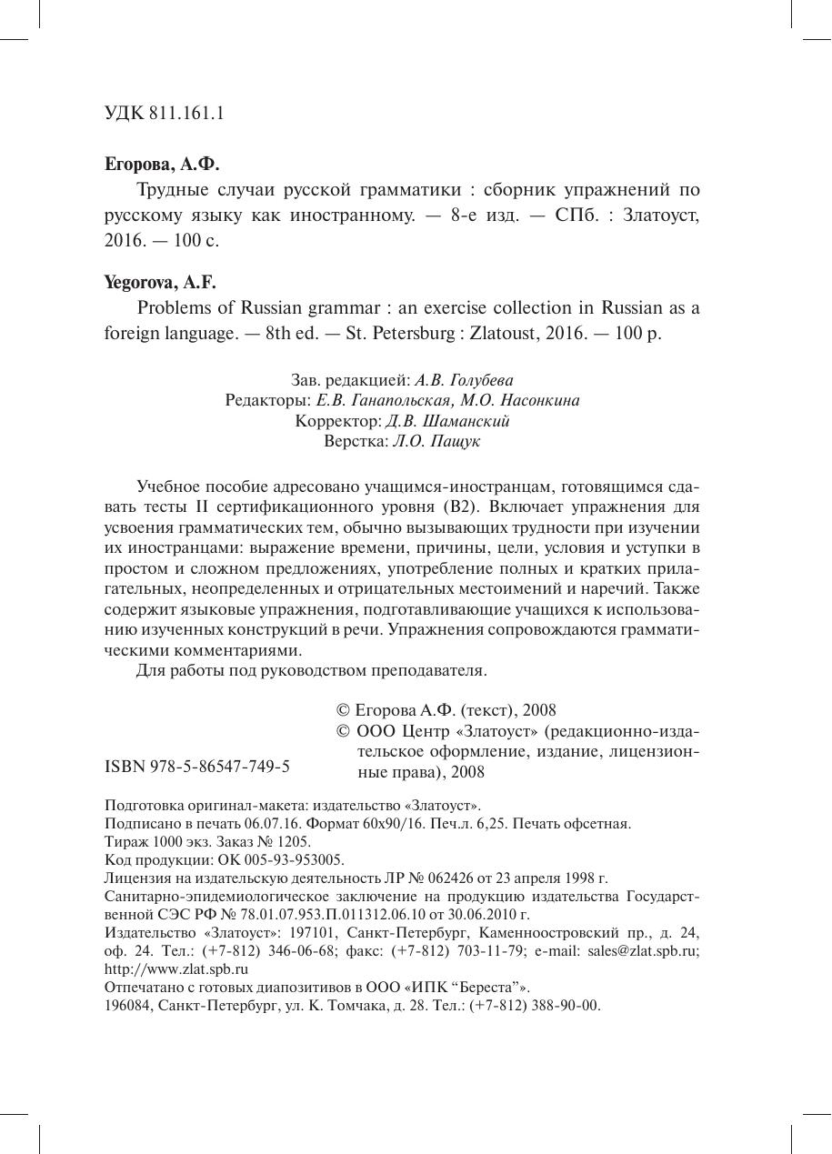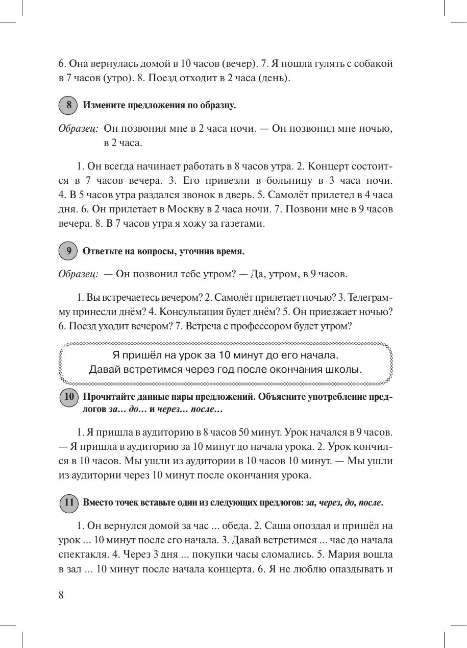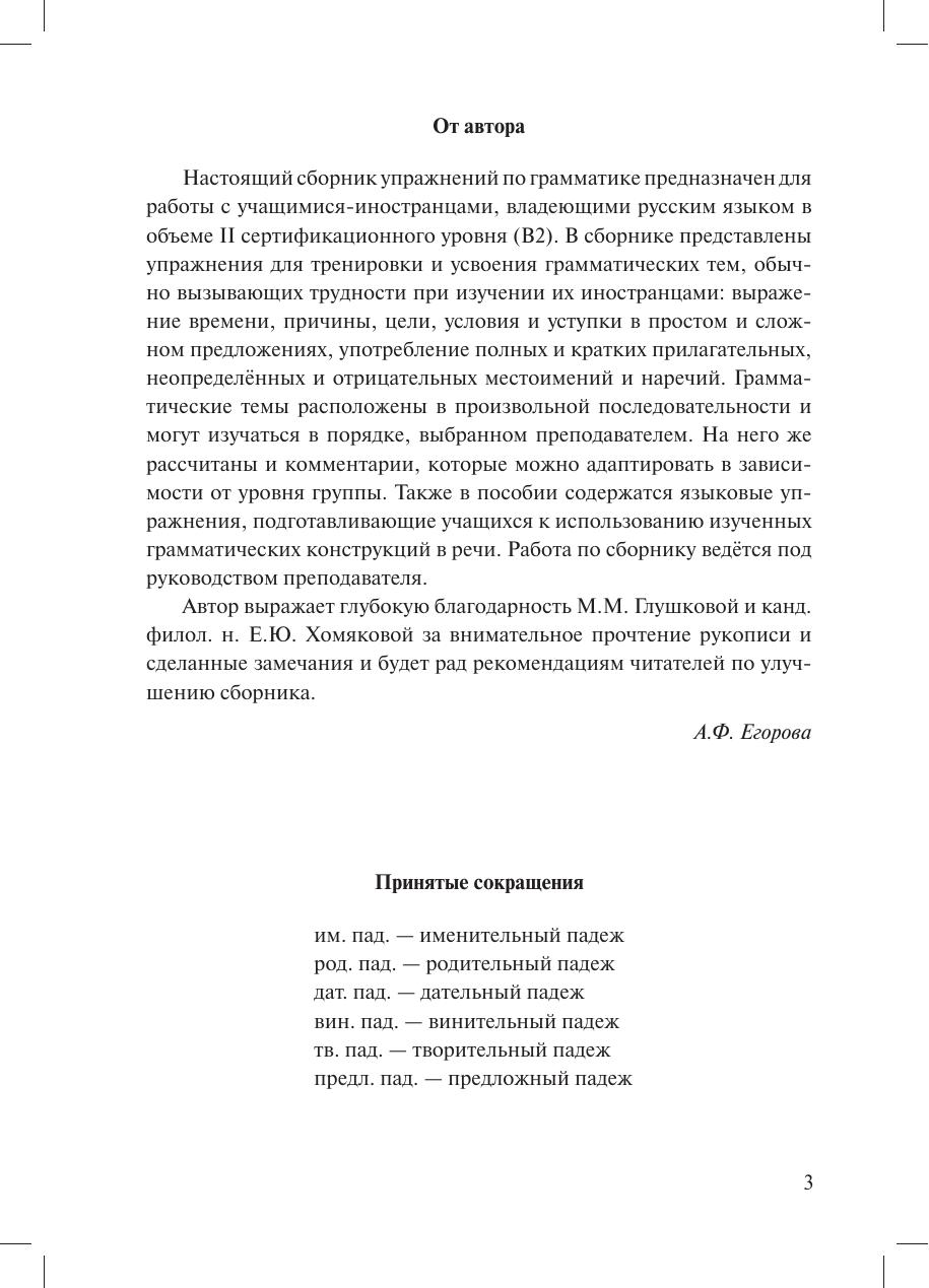 Учебное пособие адресовано учащимся-иностранцам, готовящимся сдавать тесты II сертификационного уровня (B2). Включает упражнения для усвоения грамматических тем, обычно вызывающих трудности при изучении их иностранцами: выражение времени, причины, цели, условия и уступки в простом и сложном предложениях, употребление полных и кратких прилагательных, неопределенных и отрицательных местоимений и наречий. Также содержит языковые упражнения, подготавливающие учащихся к использованию изученных конструкций в речи. Упражнения сопровождаются грамматическими комментариями. Для работы под руководством преподавателя.